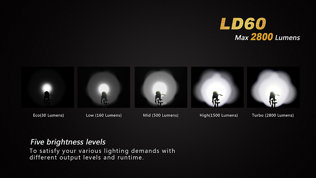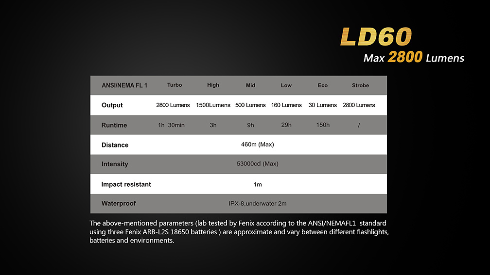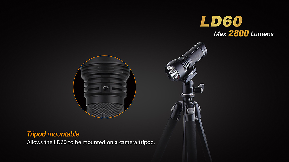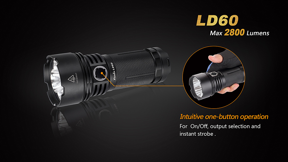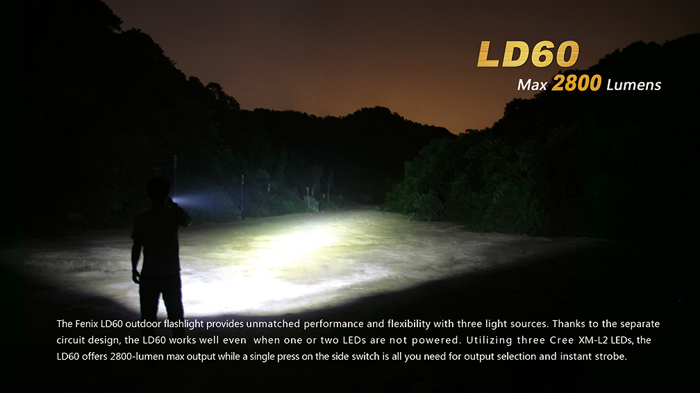 Extrémne výkonná kompaktná LED baterka Fenix LD60 XM-L2 je osadená tromi špičkovými diódami Cree XM-L2 U2 s maximálnym výkonom 2 800 lm. Baterka používa digitálnu elektroniku s konštantnou reguláciou pre zaručenie stáleho svetelného výkonu i pri znižovaní napätia v batériách, nechýba ani pamäť na posledný zvolený režim. Ovládanie je pohodlné a rýchle vďaka systému jedného tlačidla, kedy jeho podržaním dochádza k aktivácii a deaktivácii svetla a jeho rýchlym stlačením sa prepínajú svetelné režimy. Baterka Fenix LD60 je vysoko výkonné svetlo s kompaktnými rozmermi a príjemnou váhou. Možno ho využiť pre osvetlenie rozľahlých priestorov ako pri amatérskom, tak profesionálnom použití.