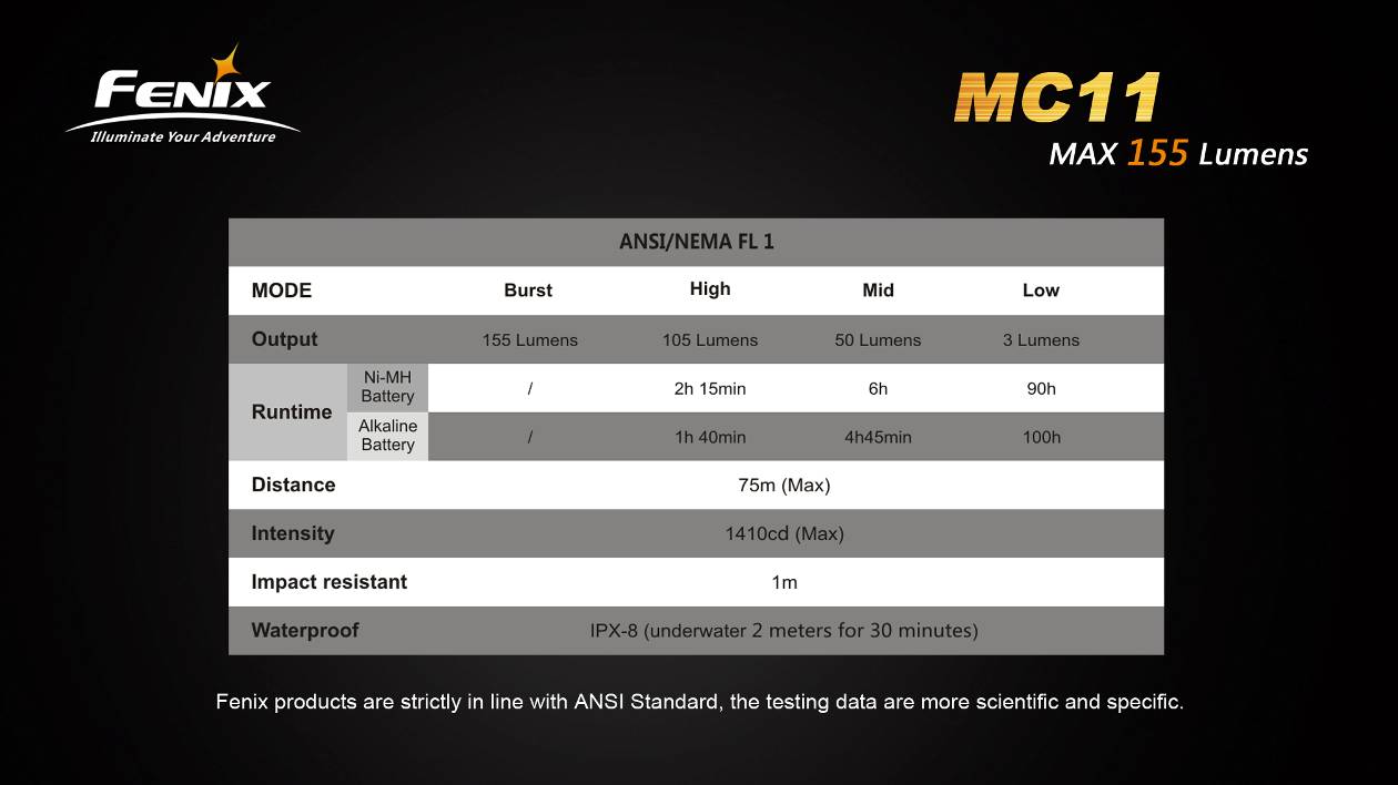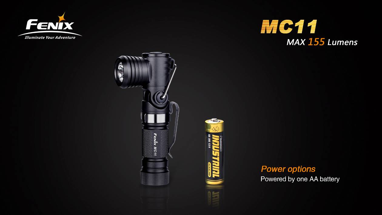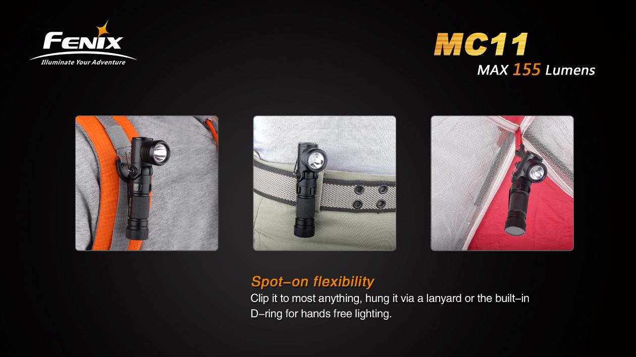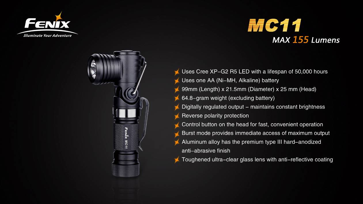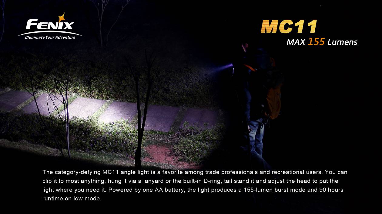 Svetlo Fenix MC11 XP-G2 je praktická a výkonná LED baterka na jednu tužkovú batériu. Výkonná LED Cree XP-G2 poskytuje svetelný tok až 155 lúmenov (ANSI). Špeciálne zahnutý L-design s naklápacou hlavou v rozsahu 90 stupňov zaručuje širokú použiteľnosť. Svetlo Fenix MC11 je taktiež vybavené odstrániteľnou pevnou oceľovou sponou pre ľahké nosenie na opasku a ďalej dvoma okami vhodnými pre zavesenie svetla. Svojou variabilitou je svetlo veľmi užitočné na kempovanie, pohyb v prírode, ako pracovné svetlo, čelovka a na mnoho ďalších použití.