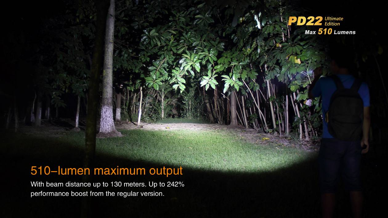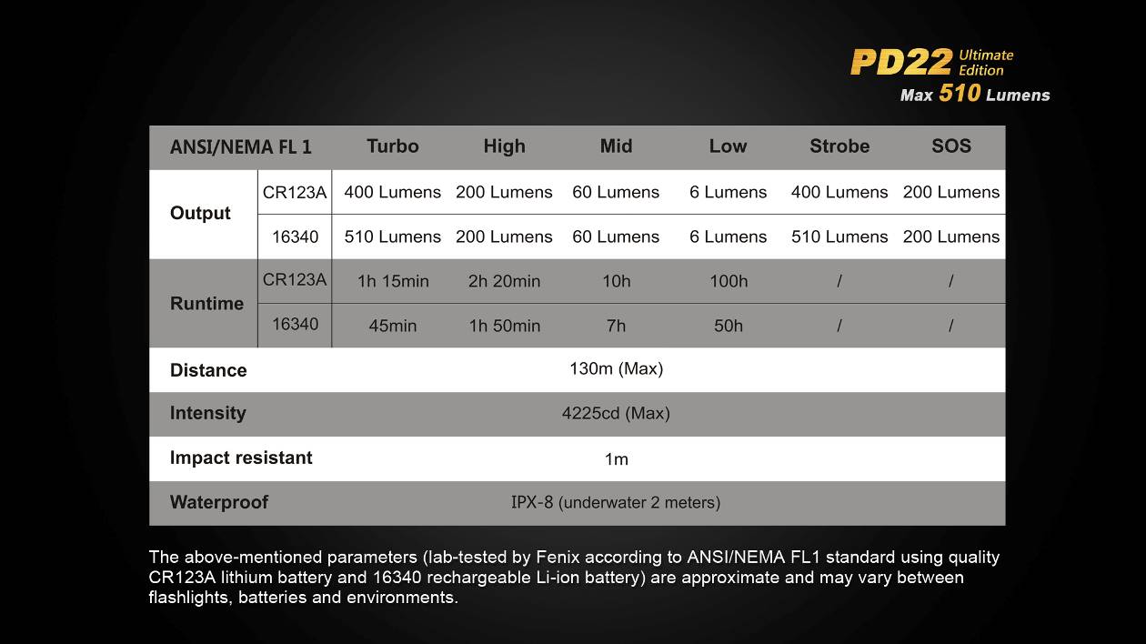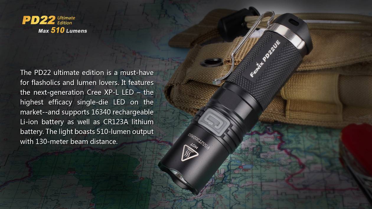 Vysoko výkonná vrecková baterka Fenix PD22 Ultimate Edition ponúka slušný svetelný tok až 510 lúmenov (ANSI) a dosvit do vzdialenosti až 130 metrov. K napájaniu možno použiť jeden kus jednorazovej CR123A batérie či nabíjací akumulátor typu RCR123A. Ako svetelný zdroj je použitá najnovšia LED Cree XP-L s vysokou účinnosťou až 200 lm/W. Svetlo ponúka celkom šesť rôznych režimov osvetlenia, ktoré umožní voliť medzi vysokým výkonom a dlhou výdržou (až 100 hodín prevádzky). Svetlo je napájané digitálne kontrolovaným konštantným prúdom pre zaručenie stáleho svetelného výkonu aj pri znižovaní napätia v batériách (pri ich pozvoľnom vybíjaní).