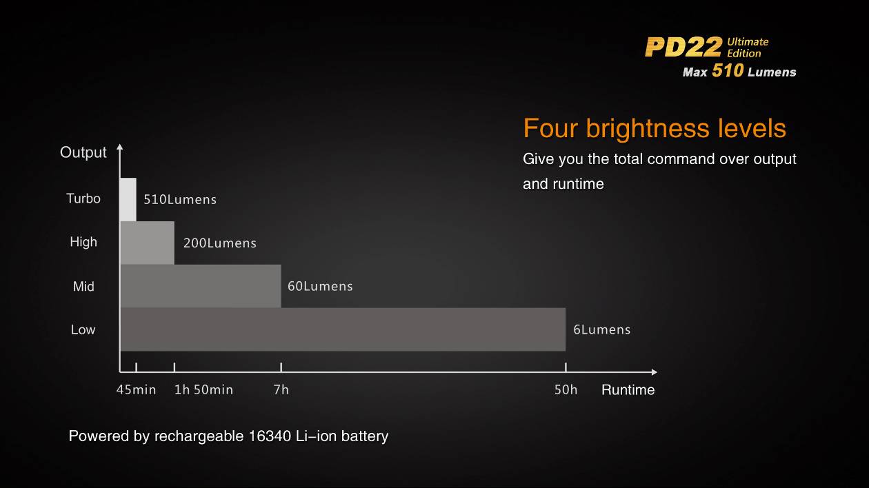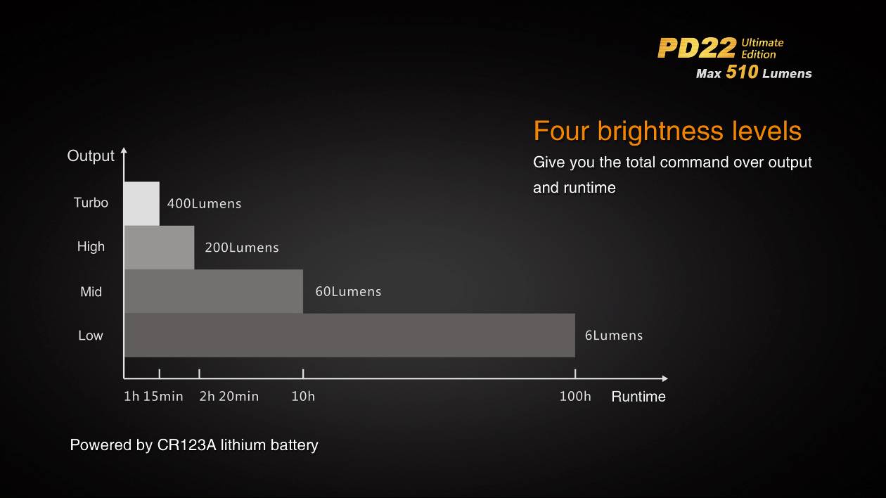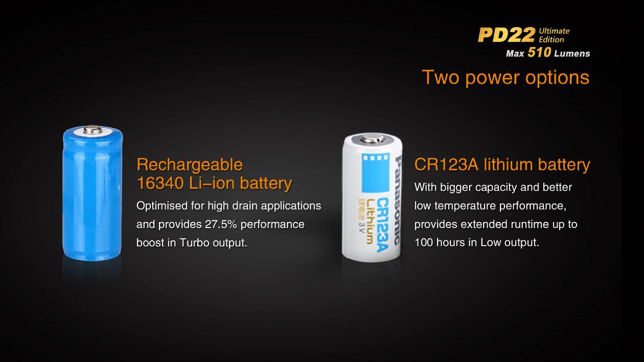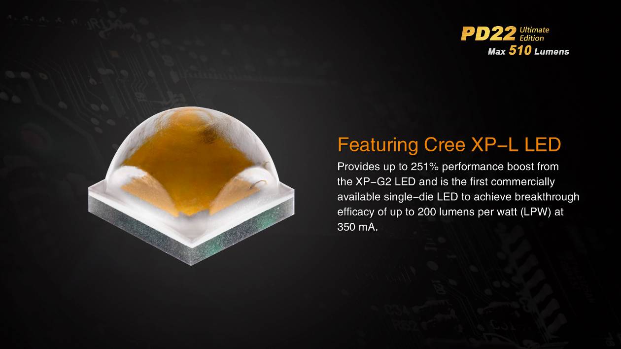 Vysoko výkonná vrecková baterka Fenix PD22 Ultimate Edition ponúka slušný svetelný tok až 510 lúmenov (ANSI) a dosvit do vzdialenosti až 130 metrov. K napájaniu možno použiť jeden kus jednorazovej CR123A batérie či nabíjací akumulátor typu RCR123A. Ako svetelný zdroj je použitá najnovšia LED Cree XP-L s vysokou účinnosťou až 200 lm/W. Svetlo ponúka celkom šesť rôznych režimov osvetlenia, ktoré umožní voliť medzi vysokým výkonom a dlhou výdržou (až 100 hodín prevádzky). Svetlo je napájané digitálne kontrolovaným konštantným prúdom pre zaručenie stáleho svetelného výkonu aj pri znižovaní napätia v batériách (pri ich pozvoľnom vybíjaní).