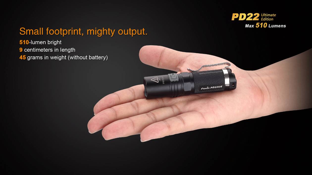 Fenix PD22 Ultimate Edition nahradzuje svetlo Fenix PD22 Premium G2 a okrem vyššieho výkonu zachováva všetky jeho prednosti ako je nízka váha, dĺžka iba 9 centimetrov, zapínanie taktickým spínačom na konci a jednoduché prepínanie režimu bočným tlačidlom u reflektora.