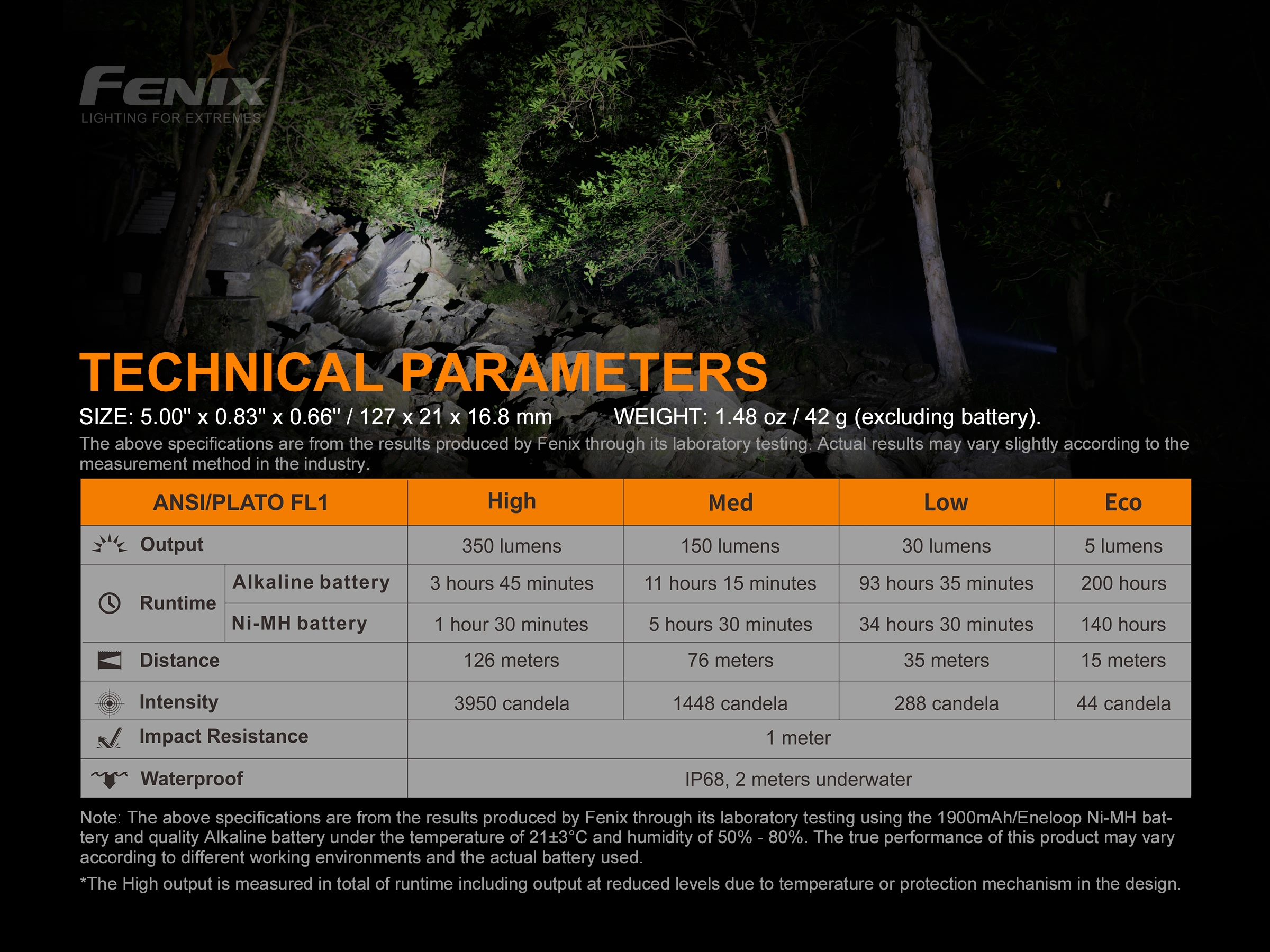 Všetky parametre baterky (svetelný tok, doba svietenia na batérie, vodotesnosť, dosvit a nárazuvzdornosť) sú merané v súlade s normou ANSI/NEMA FL 1-2009 Flashlight Basic Performance Standard.