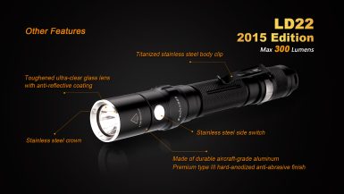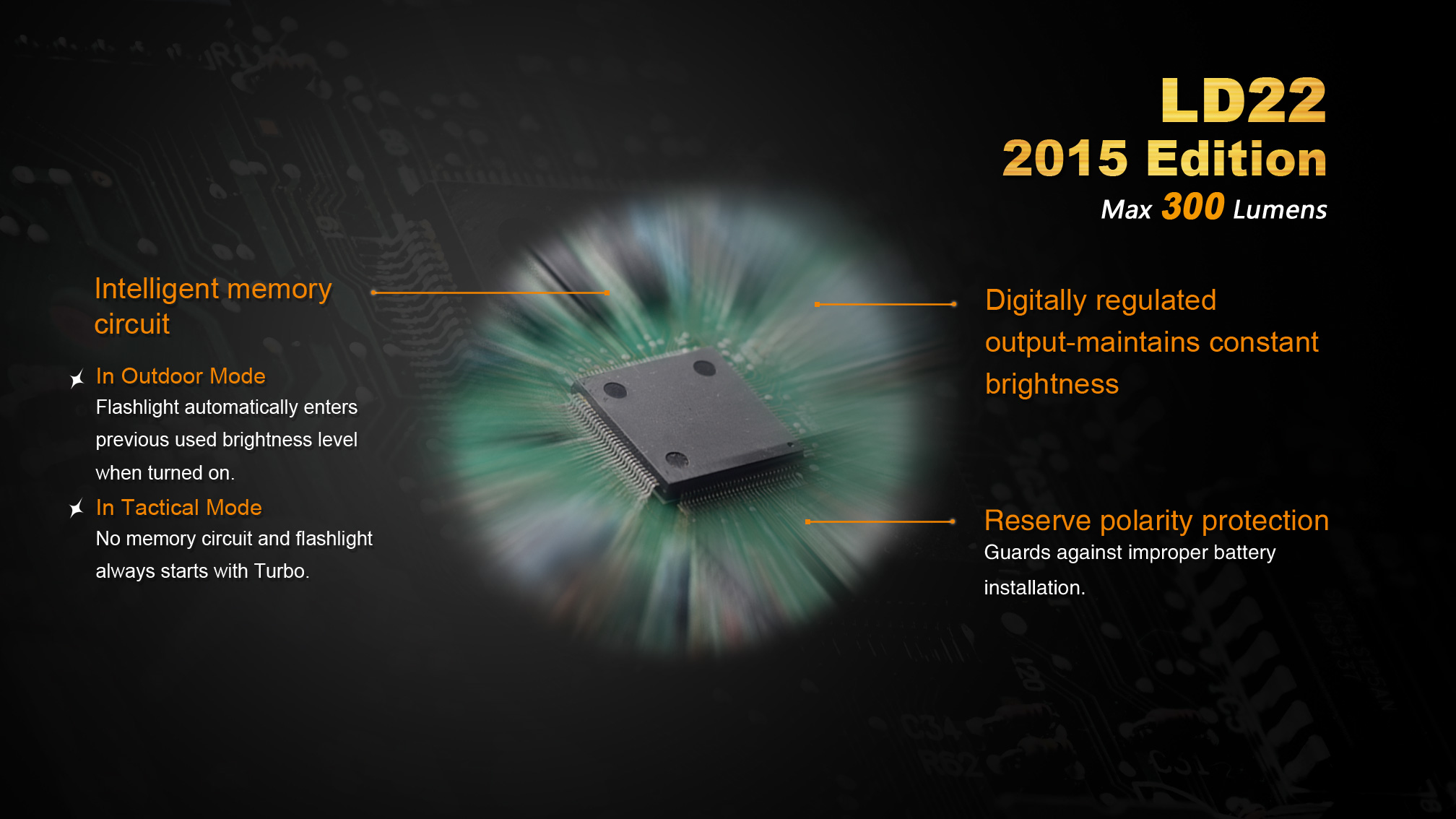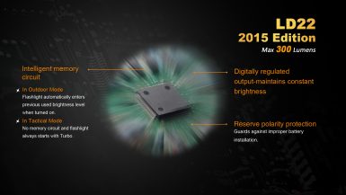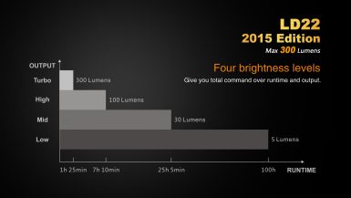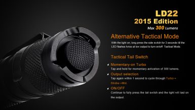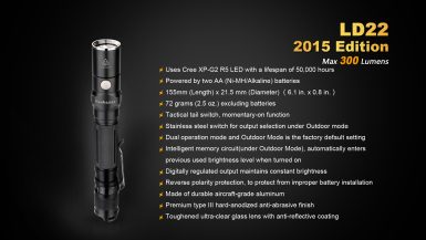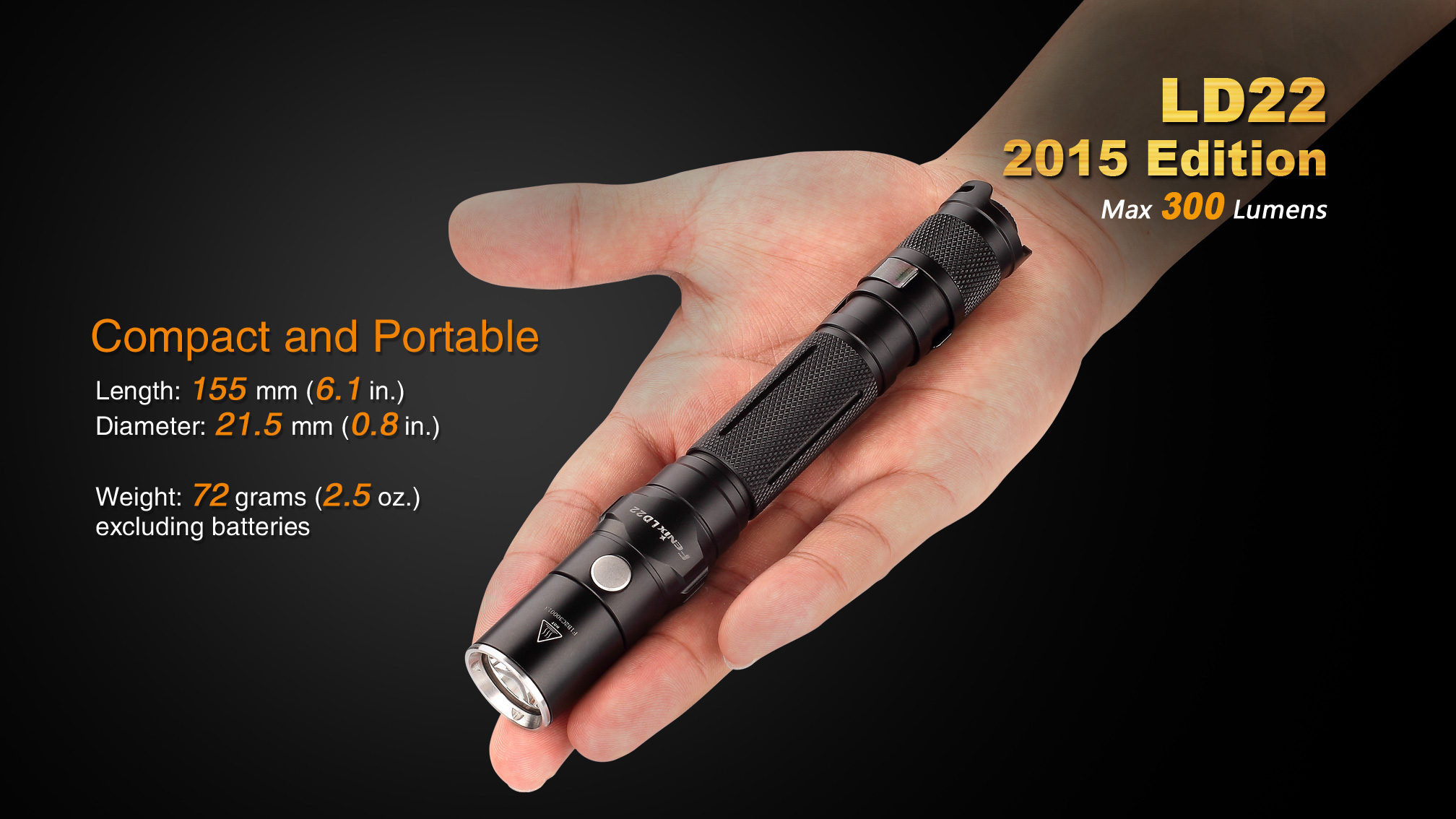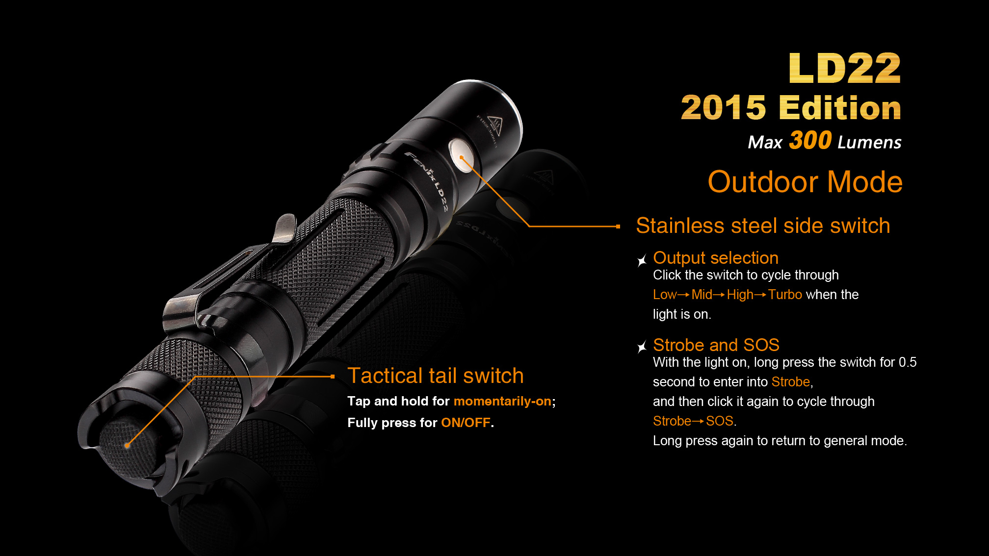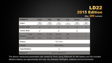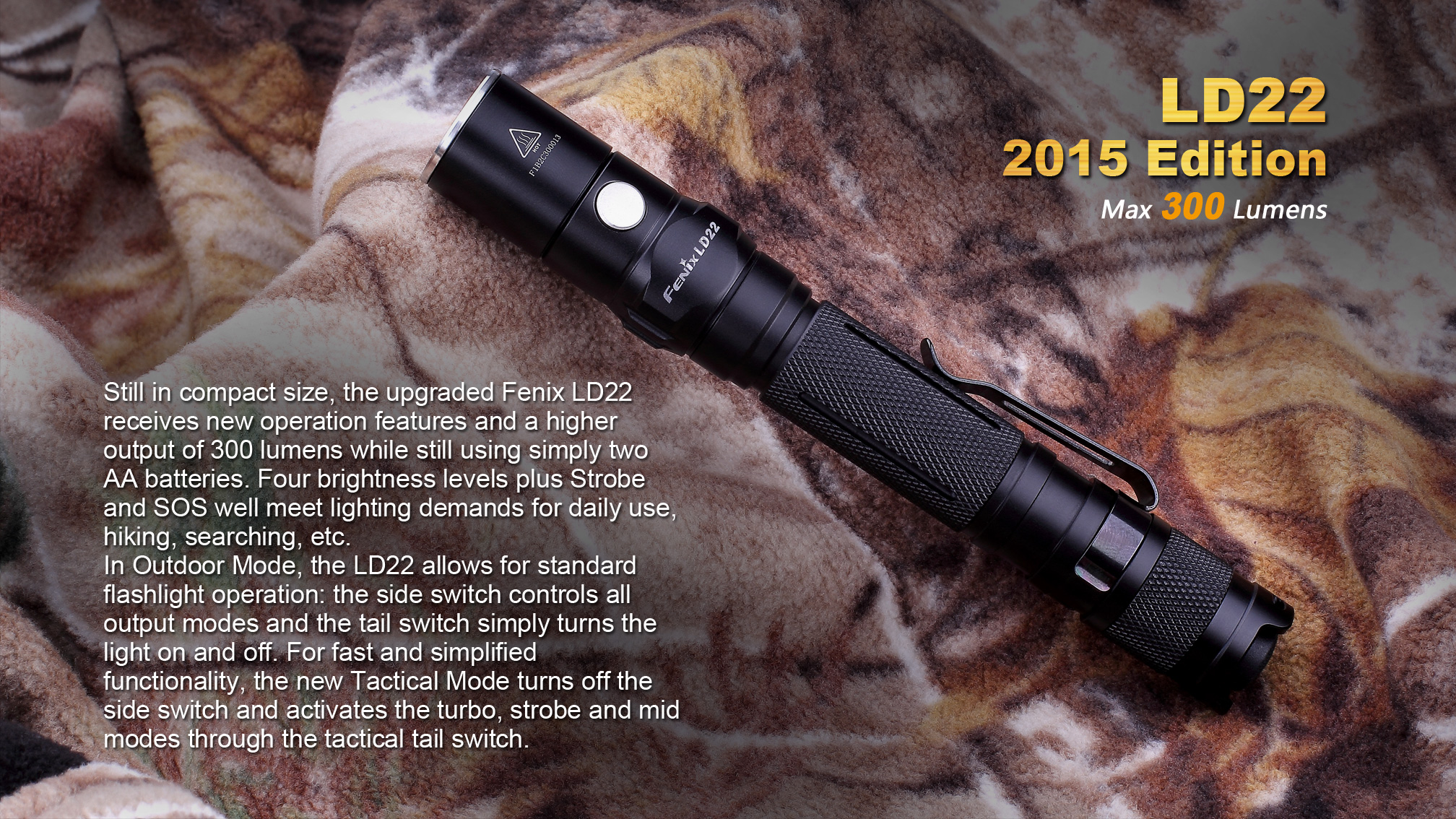 Obľúbená baterka Fenix LD22 vo svojej už štvrtej generácii prináša svetelný výkon 300 lúmenov a možnosť voľby medzi outdoorovým a taktickým ovládaním. Vysoký výkon, dlhá výdrž až 100 hodín a napájanie na 2 tužkové batérie z nej robia univerzálny nástroj. Oceníte ju ako pri použití v domácnosti, tak aj na turistike, pri kempovaní, cyklistike a pri ďalších outdoorových aktivitách.