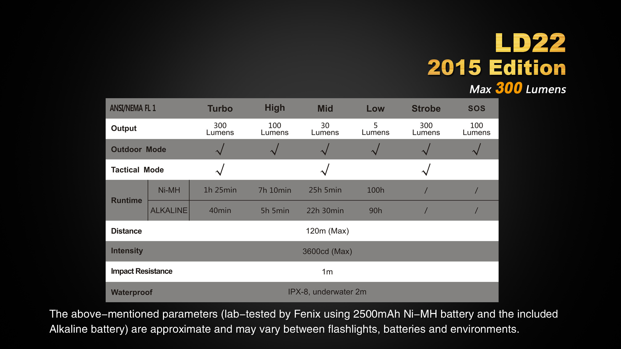 Všetky parametre baterky (svetelný tok, doba svietenia na batérie, vodotesnosť, dosvit a nárazuvzdornosť) sú merané v súlade s normou ANSI/NEMA FL 1-2009 Flashlight Basic Performance Standard.