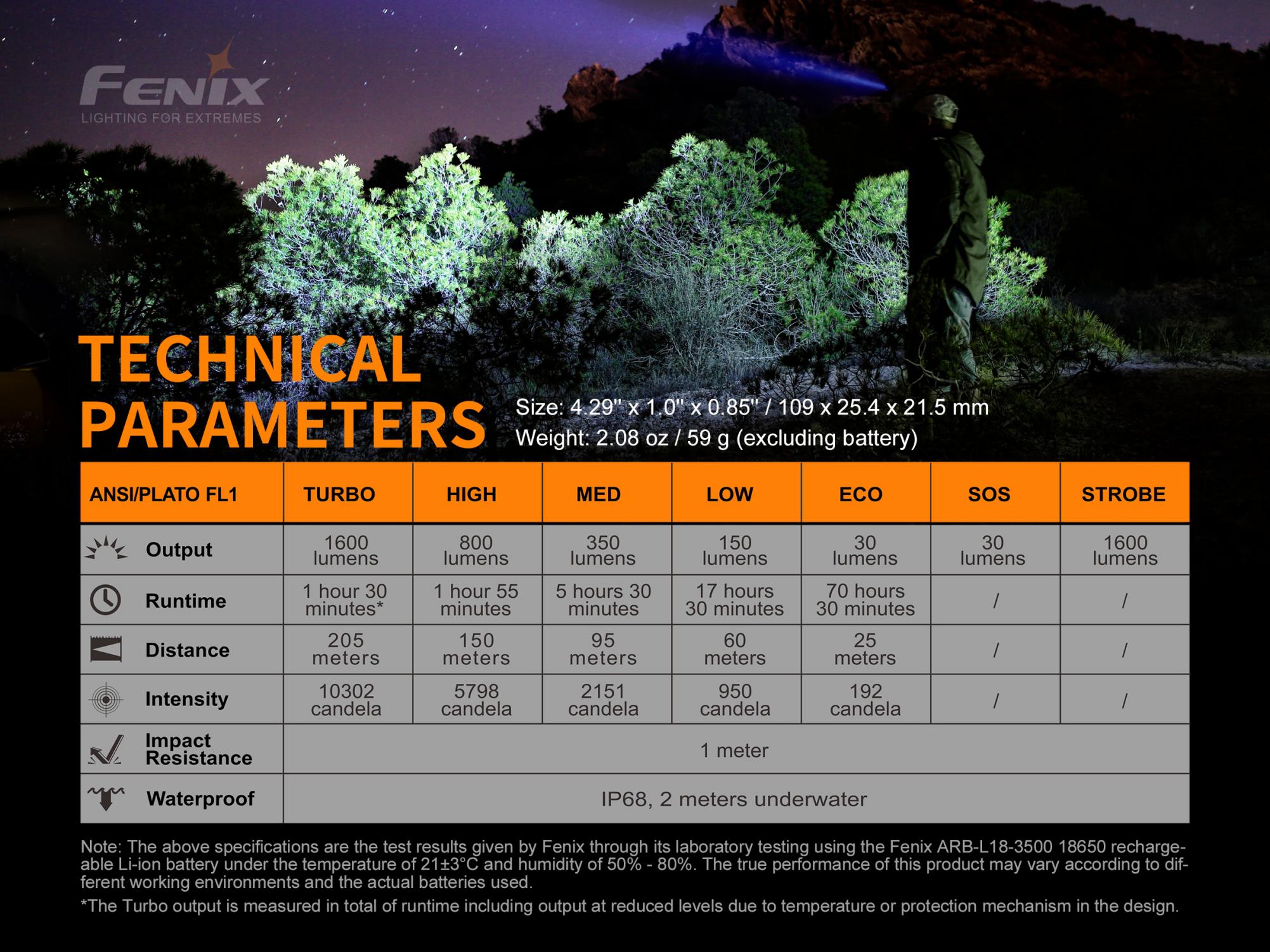 Všetky parametre baterky (svetelný tok, doba svietenia na batérie, vodotesnosť, dosvit a nárazuvzdornosť) sú merané v súlade s normou ANSI/NEMA FL 1-2009 Flashlight Basic Performance Standard.