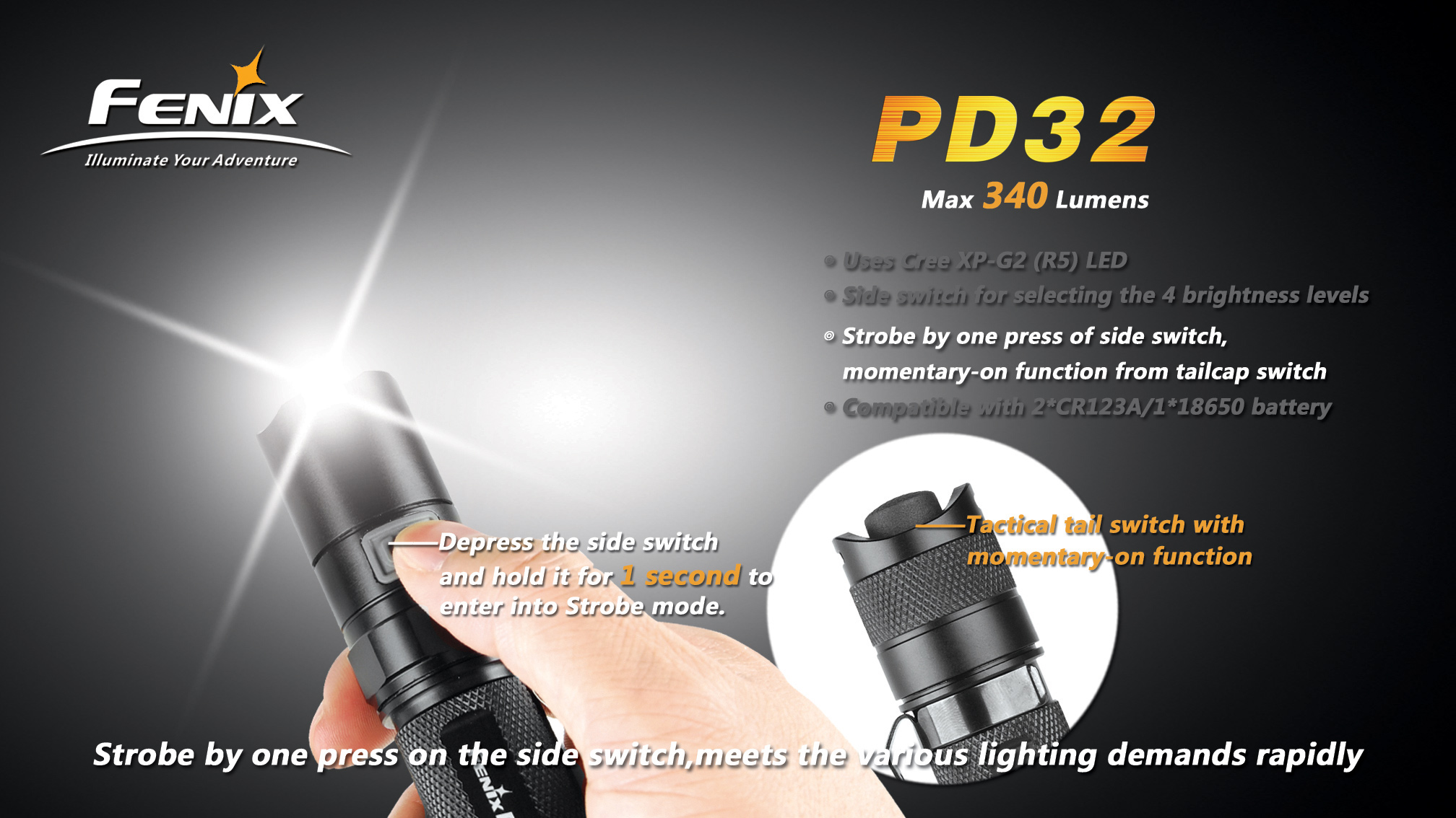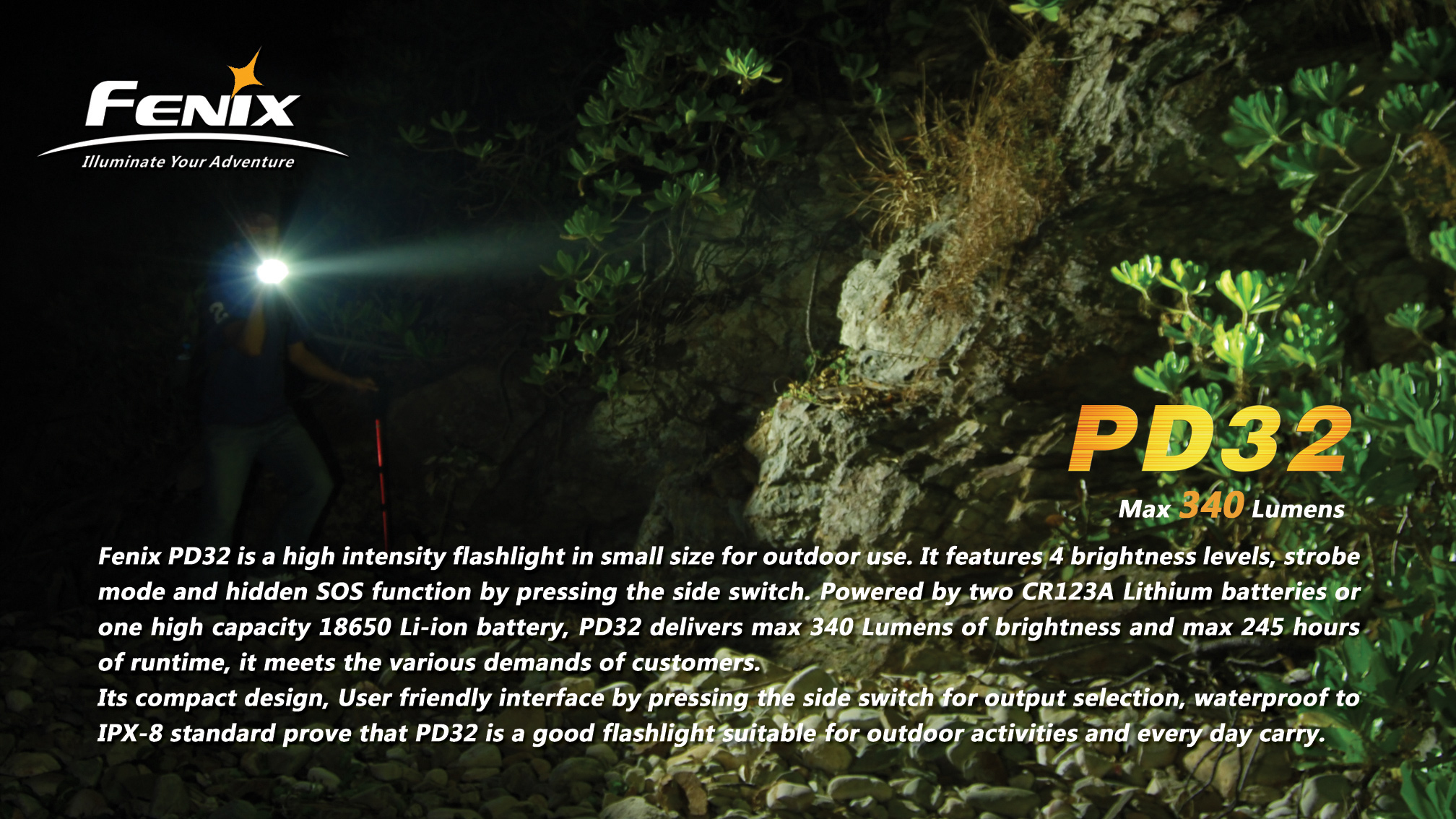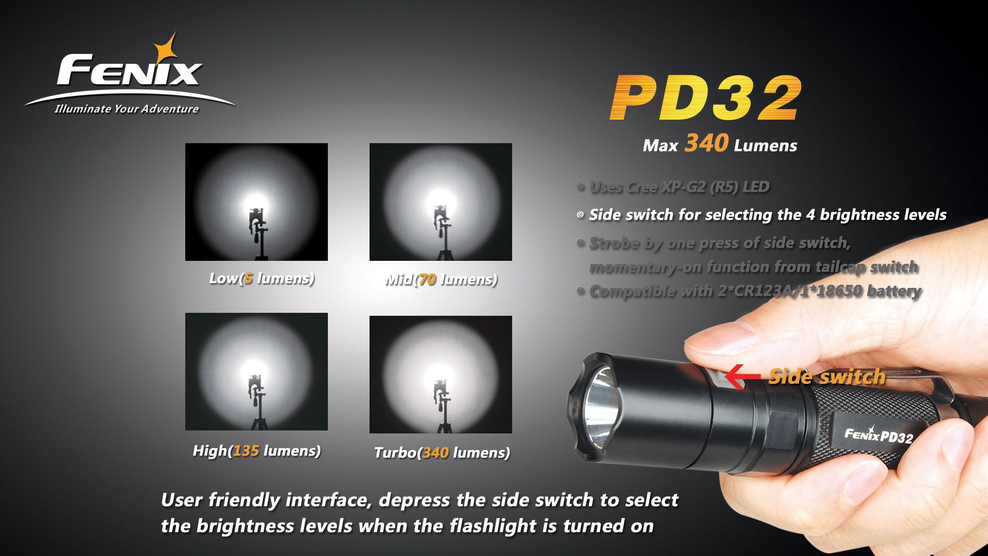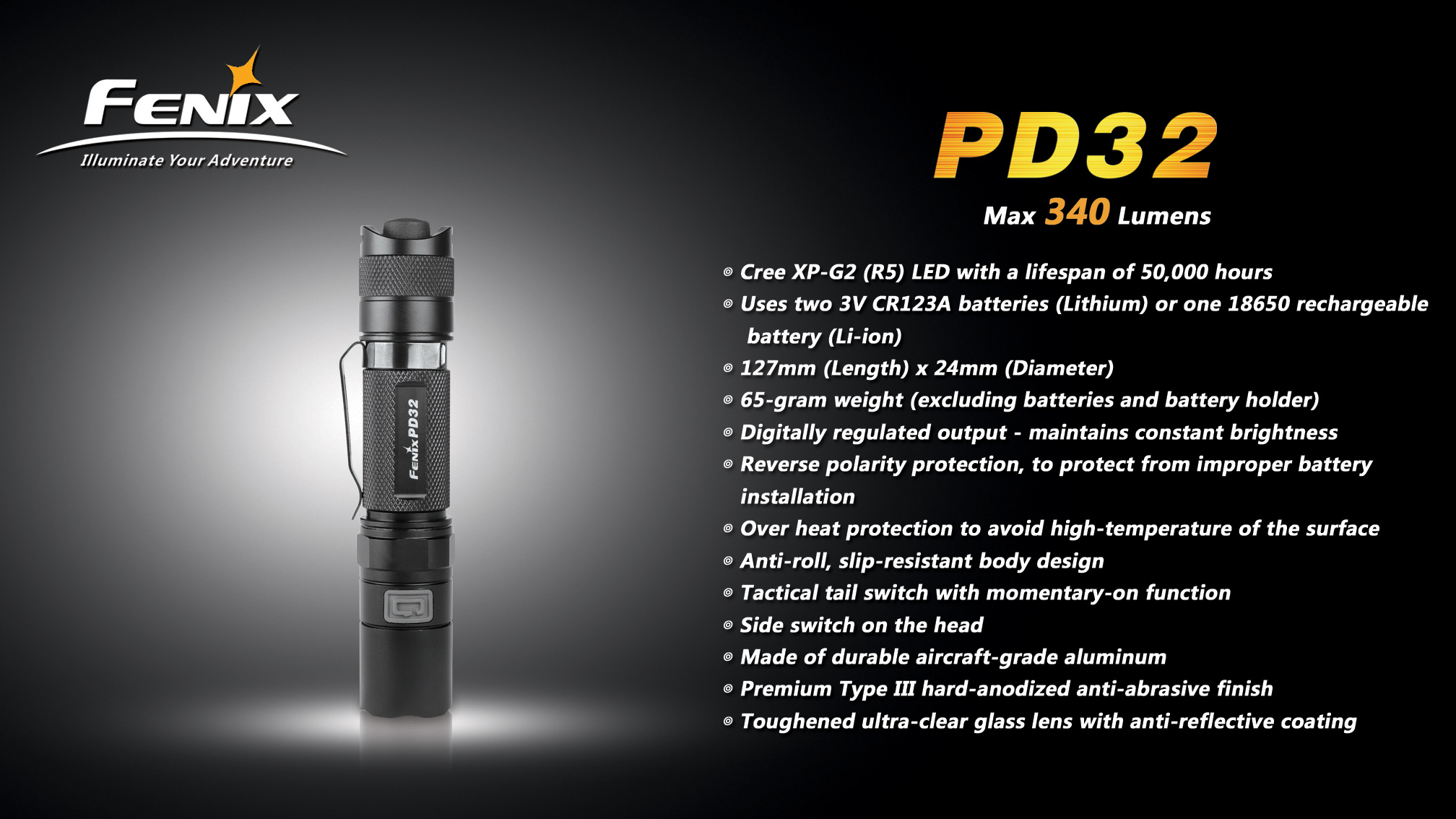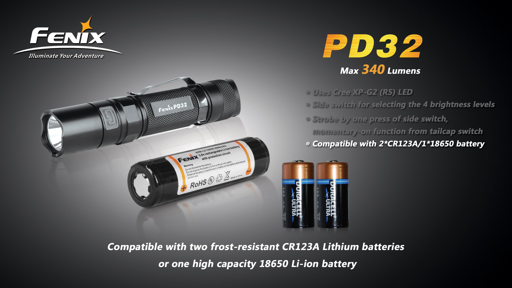 Najnovšia edícia baterky Fenix PD32 Premium G2 s výkonnou LED Cree XP-G2 ponúka špičkový svetelný tok až 340 lúmenov. Baterku je možné napájať z dvoch CR123A batérií alebo jedného vysokokapacitného li-ion 18650 akumulátoru. LED je napájaná digitálne kontrolovaným konštantným prúdom pre zaručenie stáleho svetelného výkonu aj pri znižovaní napätia v batériách (pri ich pozvoľnom vybíjaní). Fenix PD32 G2 disponuje šiestimi rôznymi úrovňami osvetlenia, ktoré umožňujú zvoliť si medzi vysokým výkonom s dosvitom až 154 metrov, dlhou výdržou (až 245 hodín) a zábleskovými režimami pre upútanie pozornosti a krízové situácie. Fenix PD32 G2 si napriek svojej širokej funkčnosti a extrémnemu výkonu uchováva kompaktnú veľkosť.