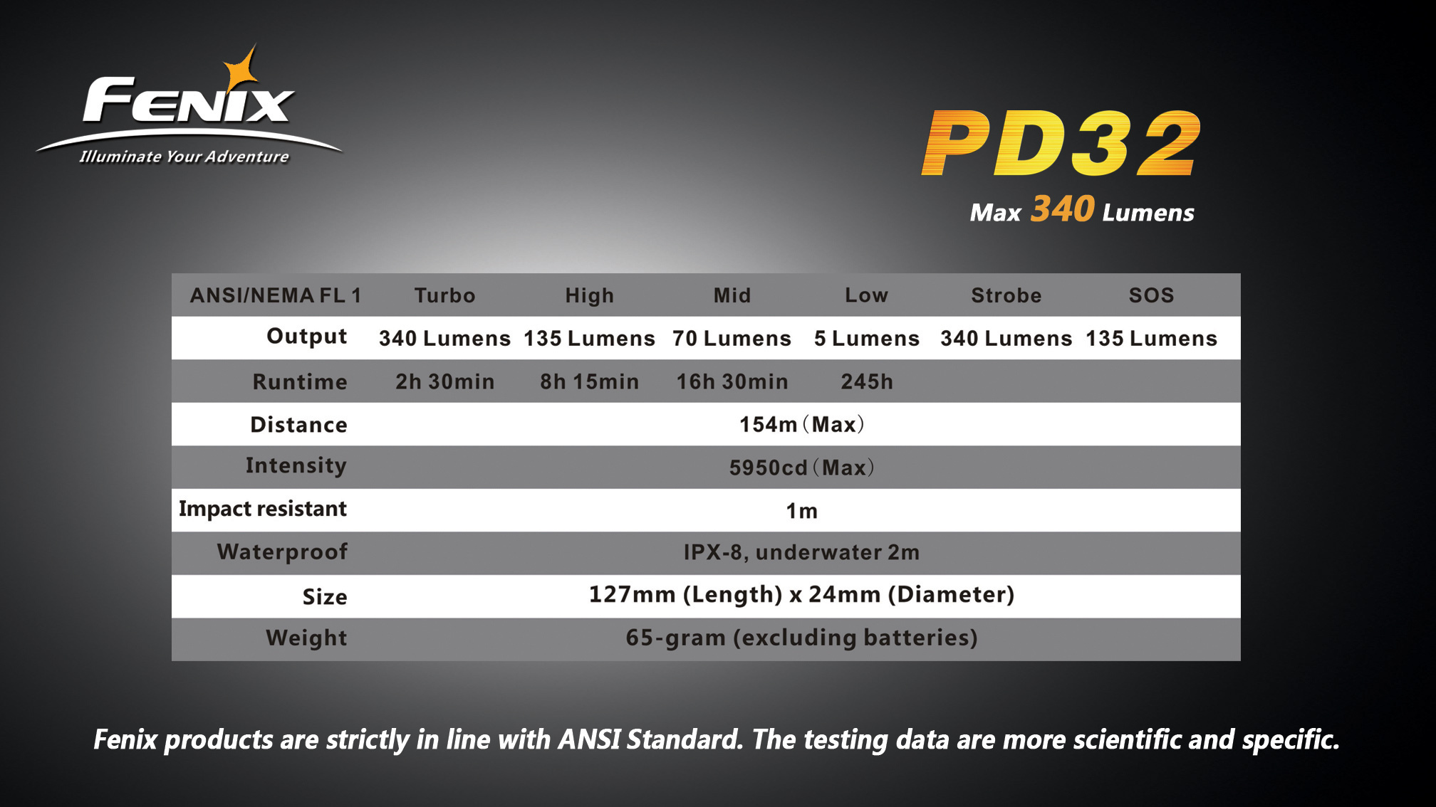 Všetky parametre baterky (svetelný tok, doba svietenia na batérie, vodotesnosť, dosvit a nárazuvzdornosť) sú merané v súlade s normou ANSI/NEMA FL 1-2009 Flashlight Basic Performance Standard.