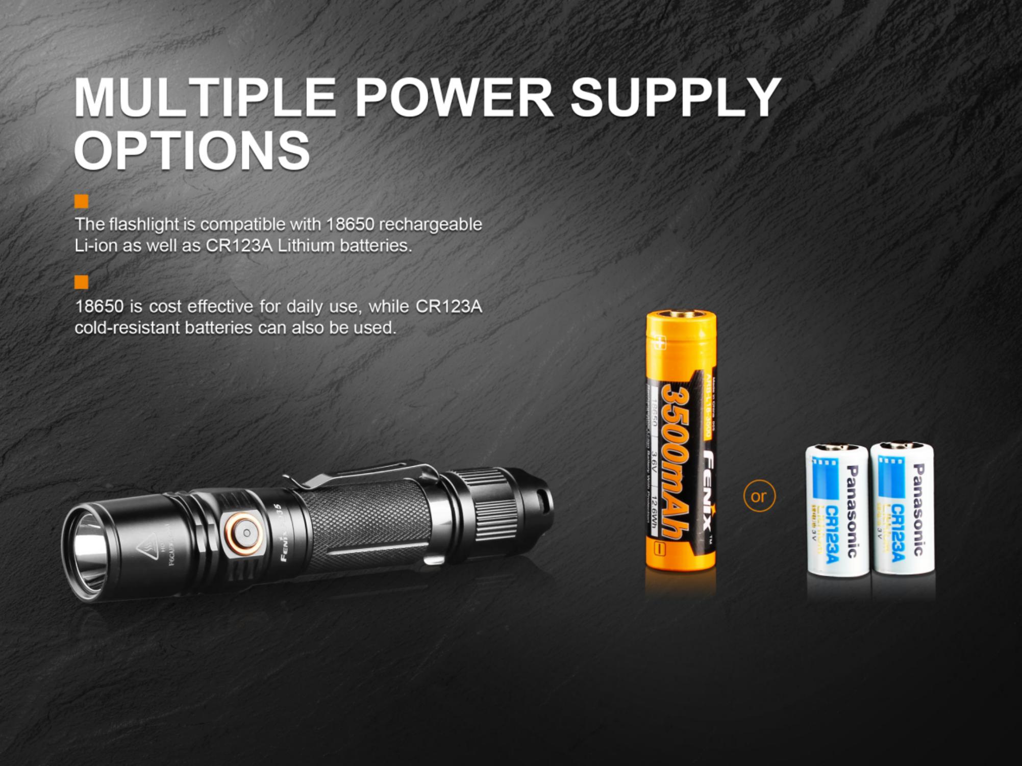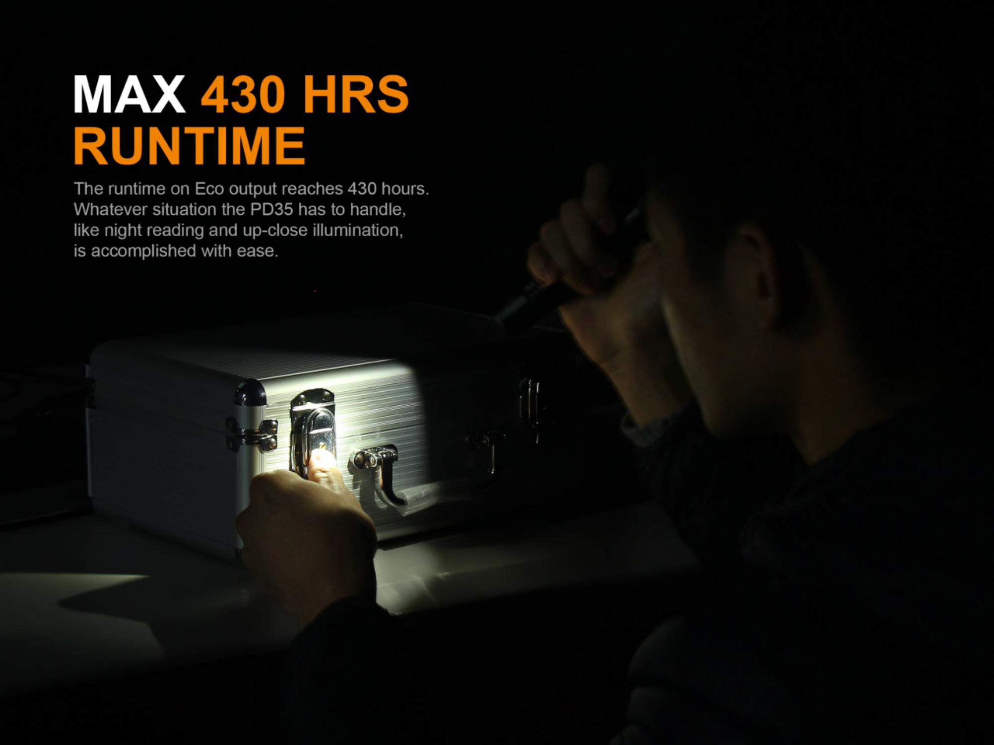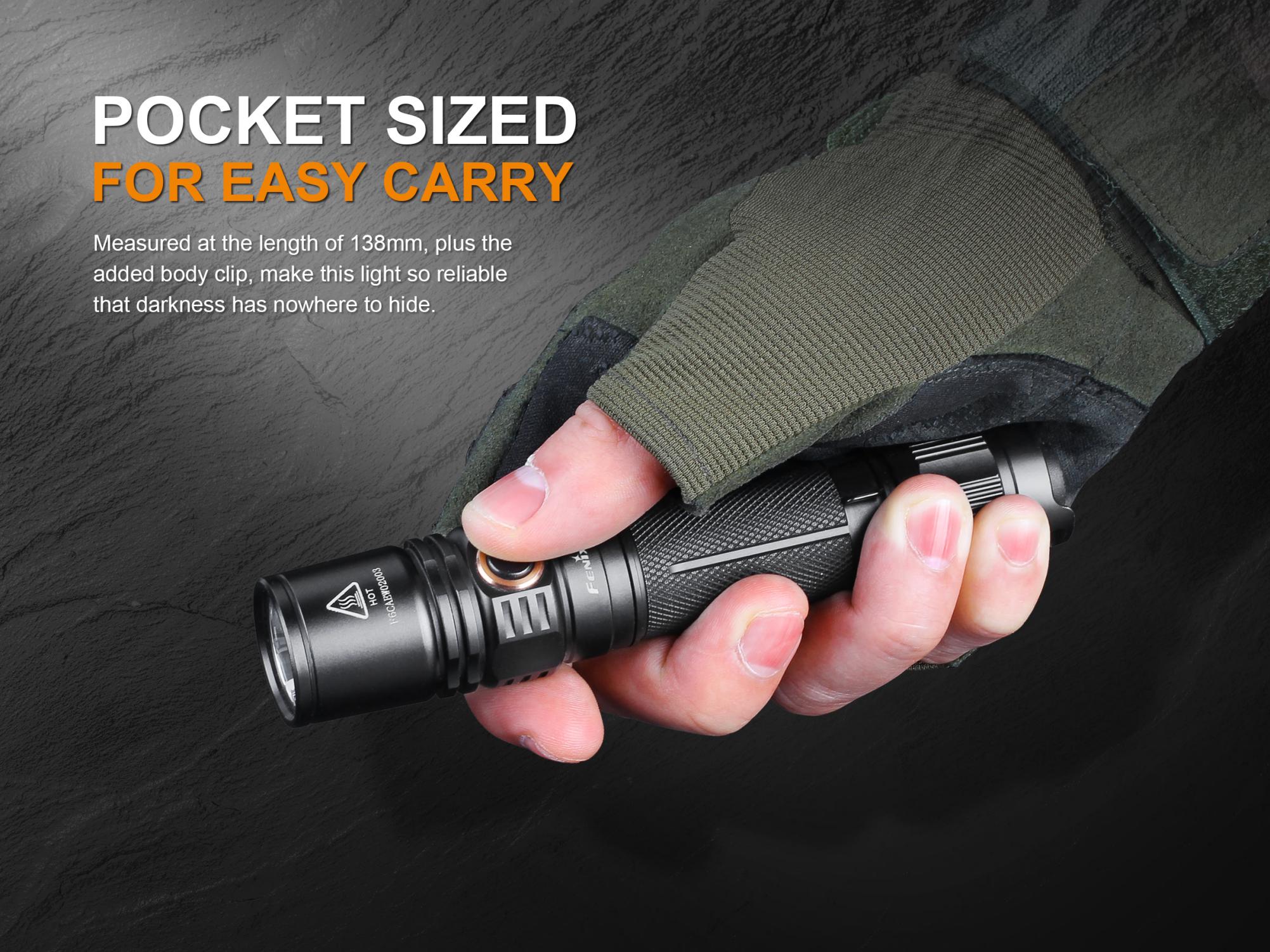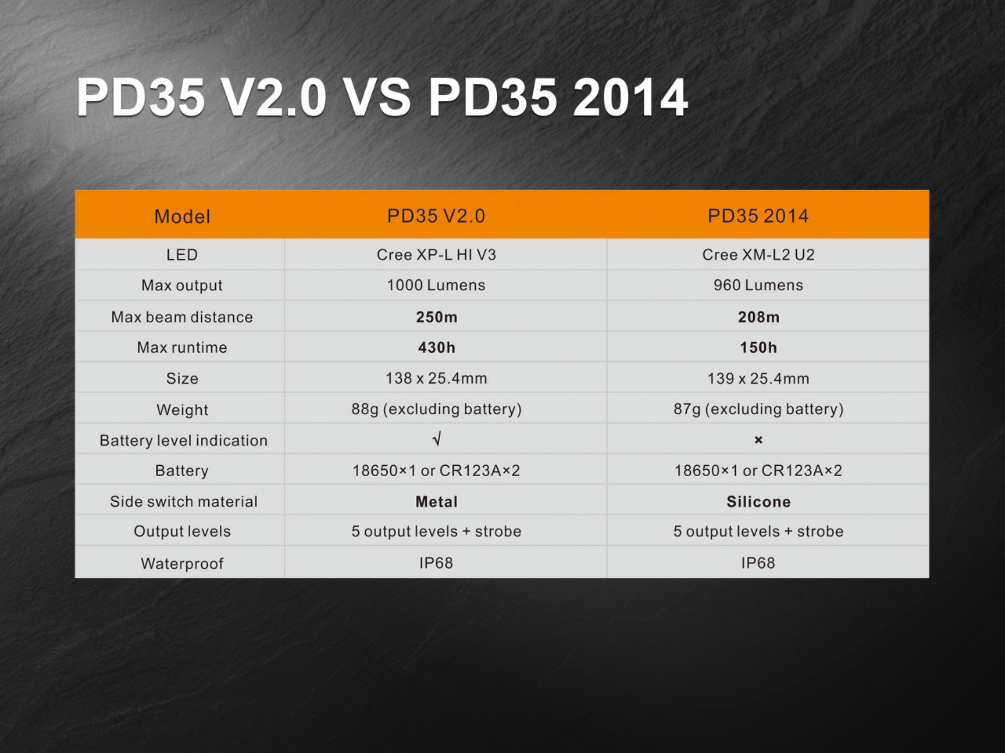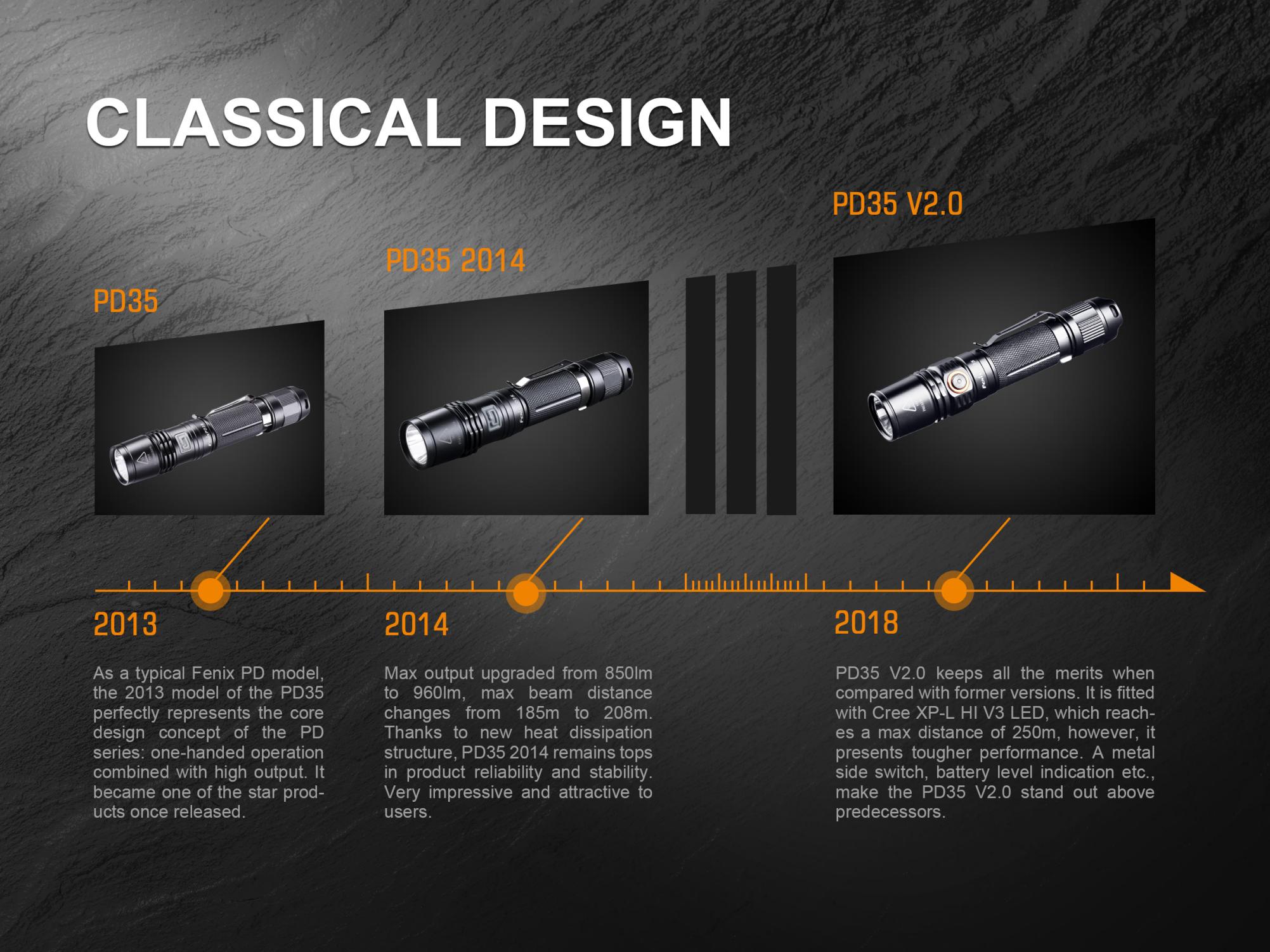 Najnovšia generácia ultra výkonnej vreckovej baterky Fenix PD35 prináša svetelný tok až 1000 lúmenov (ANSI) a dosvit až 250 metrov. Výborného svetelného výkonu bolo dosiahnuté použitím najnovšej LED Cree XP-L HI V3. Svietidlo je možné napájať z dvoch CR123A batérií alebo jedného vysokokapacitného Li-ion 18650 akumulátora. Fenix PD35 disponuje šiestimi rôznymi režimami svietenia, ktoré umožňujú voliť medzi vysokým výkonom a dlhou výdržou (až 430 hodín, čo je takmer 18 dní), nechýba ani režim stroboskopických zábleskov pre krízové situácie. Svietidlo je napájané digitálne regulovaným konštantným prúdom pre zaručenie stáleho svetelného výkonu i pri znižovaní napätia v batériách (pri ich pozvoľnom vybíjaní). Oproti minulej generácii je svietidlo vybavené indikáciou stavu nabitia batérií. PD35 V2.0 zaujme nielen malou veľkosťou a obrovským výkonom, ale aj taktickým spínačom a možnosťou pripevnenia káblového spínača. Môžeme ju preto odporučiť aj na použitie v bezpečnostných zložkách a na poľovníctvo.