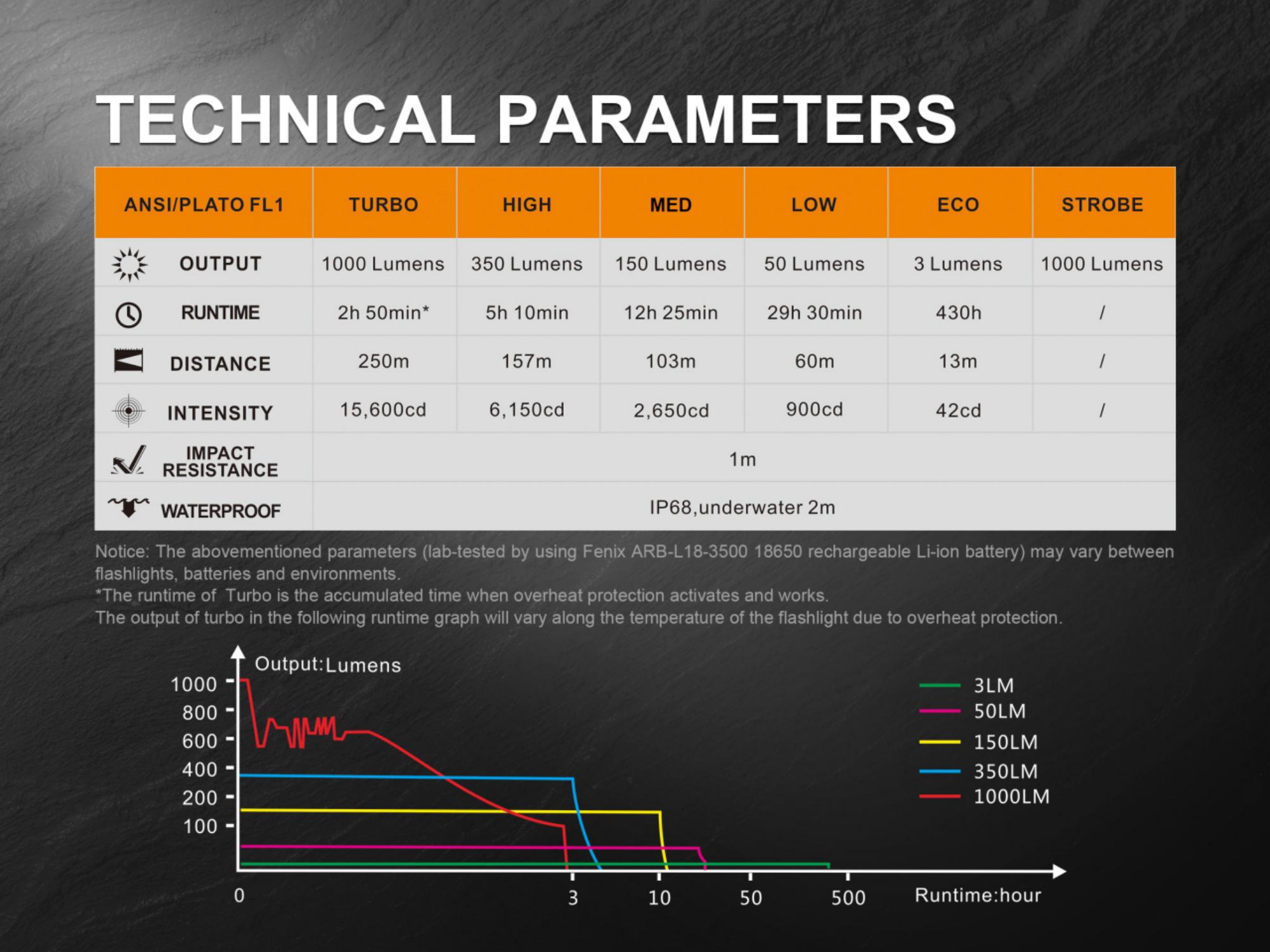 Všetky parametre baterky (svetelný tok, doba svietenia na batérie, vodotesnosť, dosvit a nárazuvzdornosť) sú merané v súlade s normou ANSI/NEMA FL 1-2009 Flashlight Basic Performance Standard.