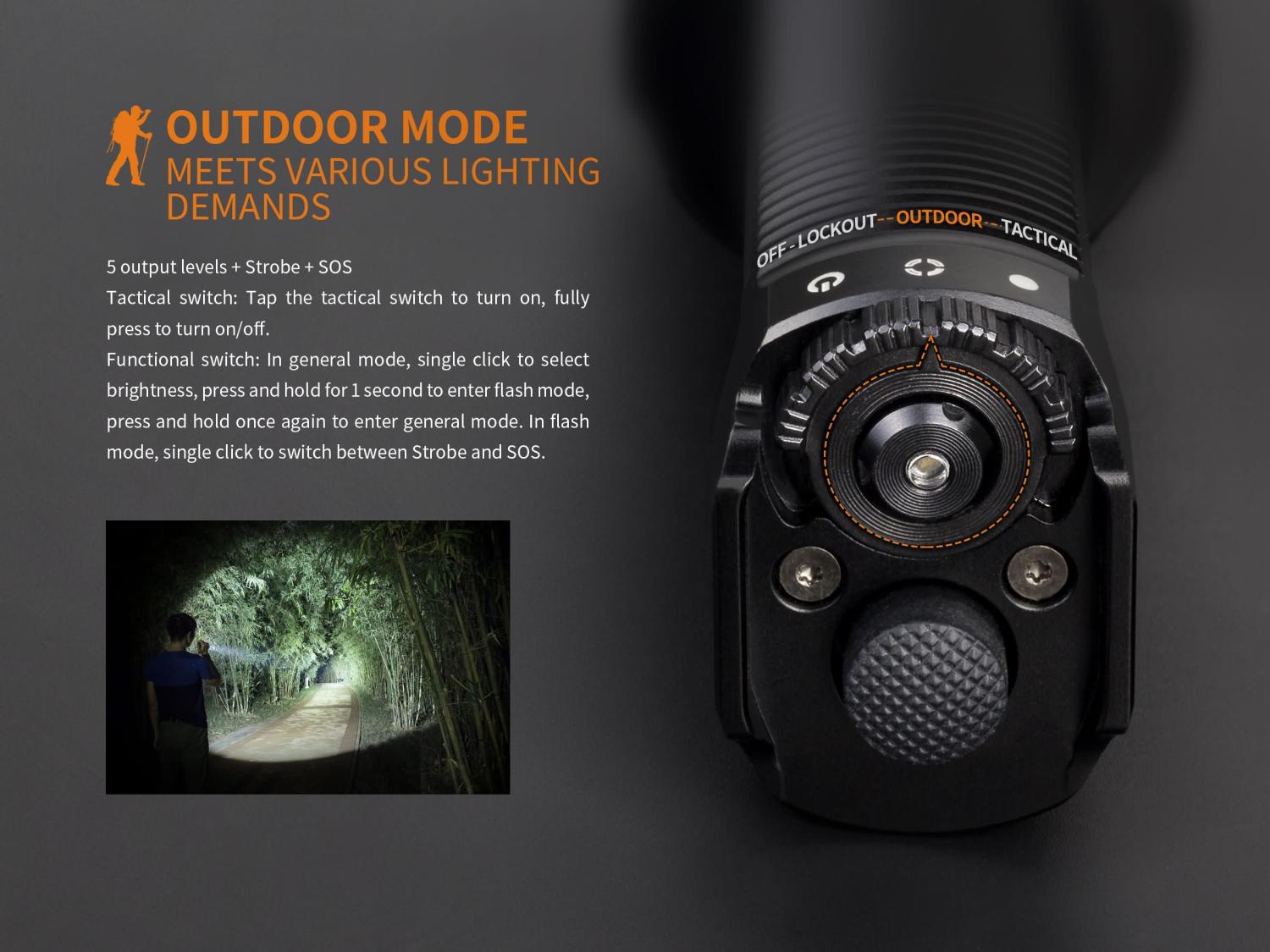 Outdoorový mód: pre zapnutie svietidla stlačte hlavný (väčší) spínač. Zmena režimov stáleho svietenia (20 – 100 – 350 – 1000 – 3200 lúmenov) sa vykonáva stlačením druhého menšieho spínača. Pre prepnutie do zábleskových režimov pridržte menšie tlačidlo približne 1 sekundu, medzi stroboskopom a SOS sa prepína stlačením menšieho tlačidla. Pre prepnutie svietidla späť do stálych režimov svietenia opäť podržte menšie tlačidlo 1 sekundu, alebo svietidlo vypnite a zapnite. V outdoorovom móde si svietidlo pamätá posledný nastavený režim, okrem zábleskových.