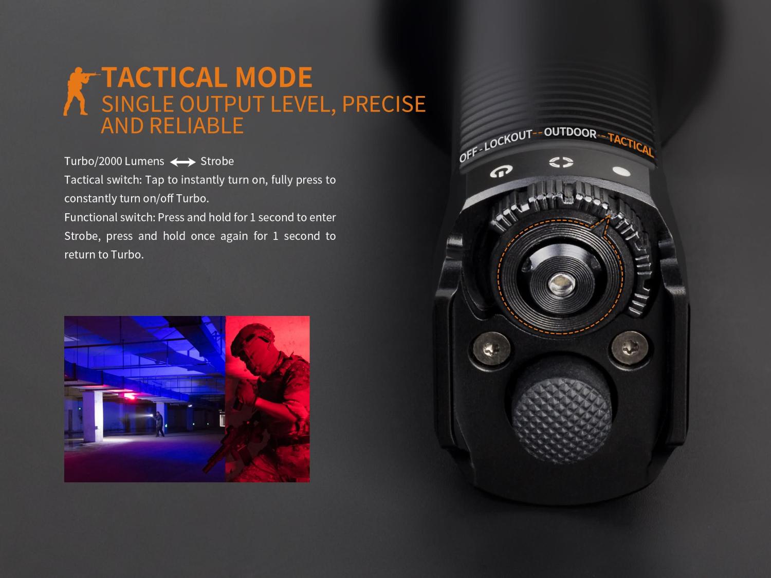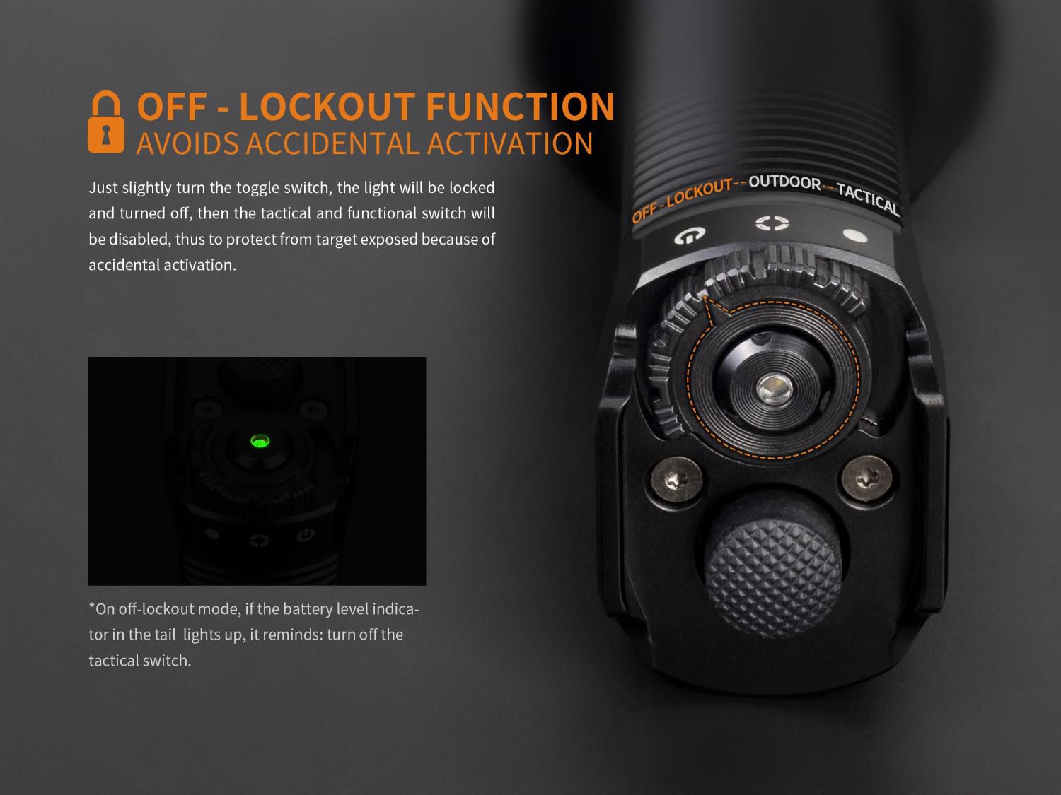 Medzi taktickým a outdoorovým módom sa prepína otočným voličom, ktorý je umiestnený na konci svietidla okolo menšieho prepínacieho tlačidla. Tretia poloha na otočnom voliči svietidlo uzamkne a nemožno ho zapnúť – vhodné napríklad pri prevoze v batožine. Ak v zamknutom stave zopnete hlavný taktický spínač, tak sa indikátor v prepínacím tlačidle rozsvieti na zeleno, čo môže pomôcť napríklad nájdeniu svietidla v tme.