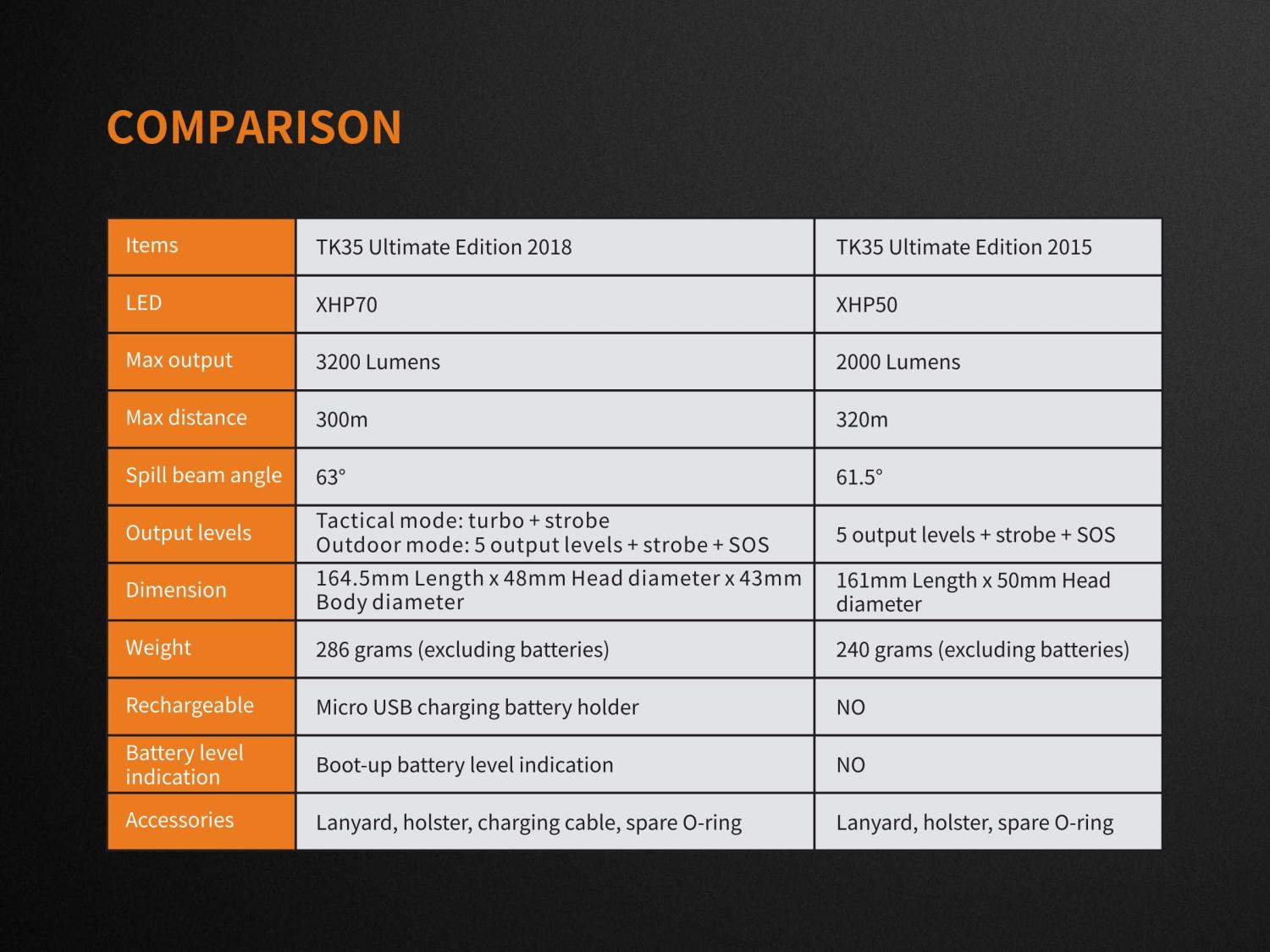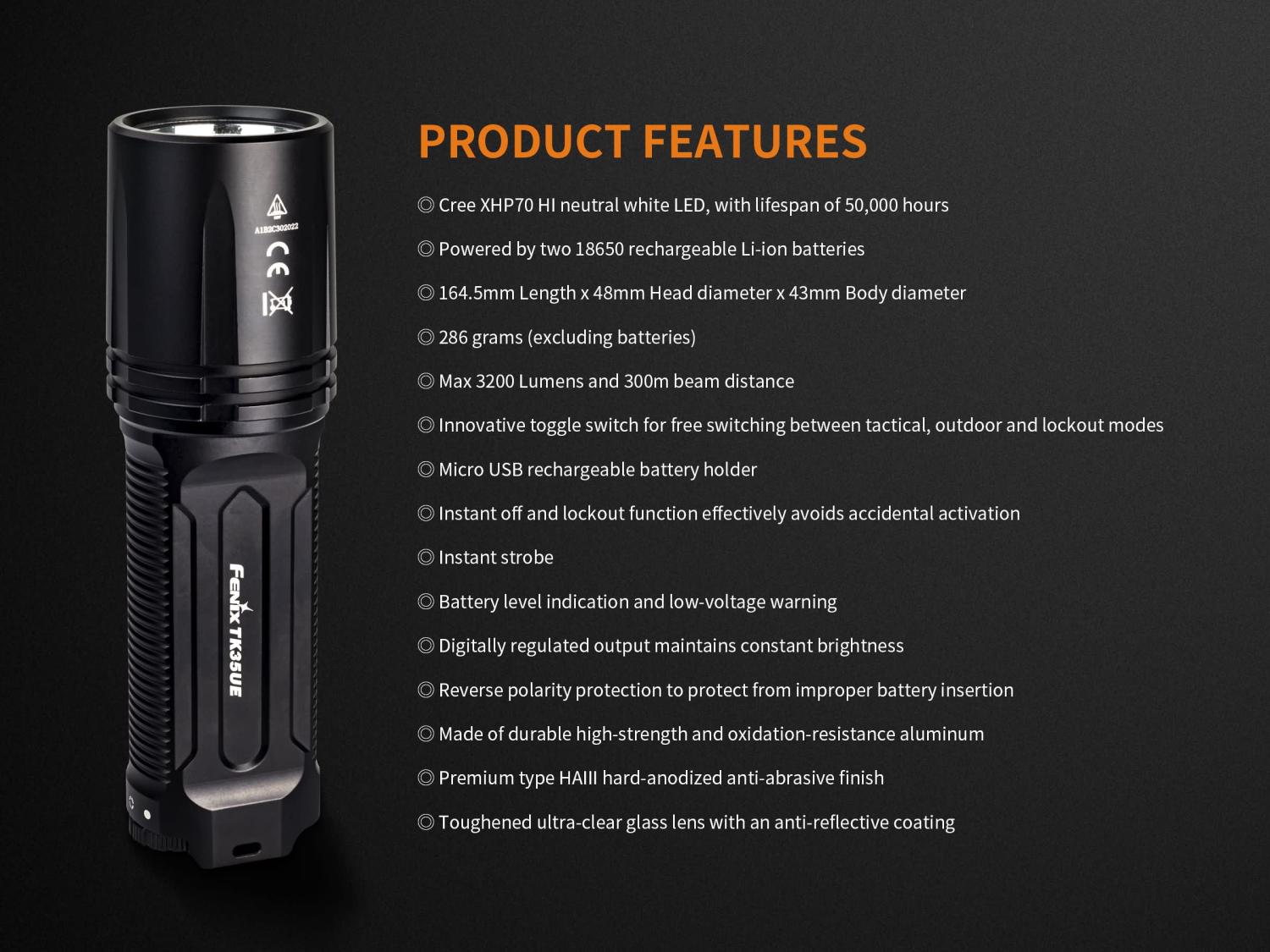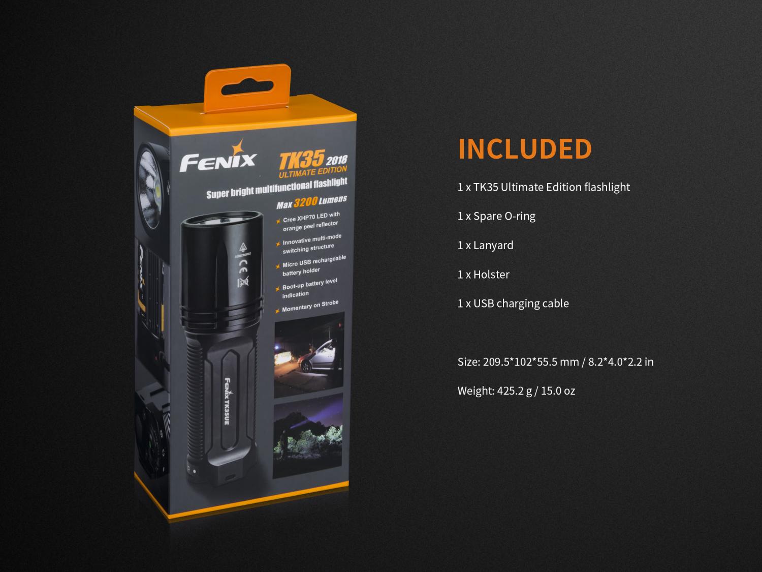 Tretia generácia baterky Fenix TK35 Ultimate Edition prináša extrémny svetelný tok až 3200 lúmenov (ANSI) a široký plynulý kužeľ s dosvitom až 300 metrov. Svietidlo je možné napájať dvoma li-ion akumulátormi typu 18650, ktoré je možné nabíjať priamo v batériovom držiaku cez micro USB konektor. Mimoriadny svetelný tok bol dosiahnutý použitím najnovšej vysoko výkonnej LED Cree XHP70. K dispozícii je päť úrovní svietenia a dva skryté zábleskové režimy strobe a SOS.