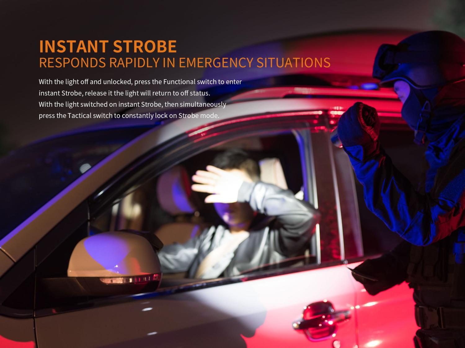 Zapnutie svietidla priamo do stroboskopického režimu: stlačte a držte menšie prepínacie tlačidlo, stroboskop bude v prevádzke po dobu jeho držania. Ak chcete nechať stroboskop trvale zapnutý, tak zároveň s držaním prepínacieho tlačidla zopnite hlavný taktický spínač.