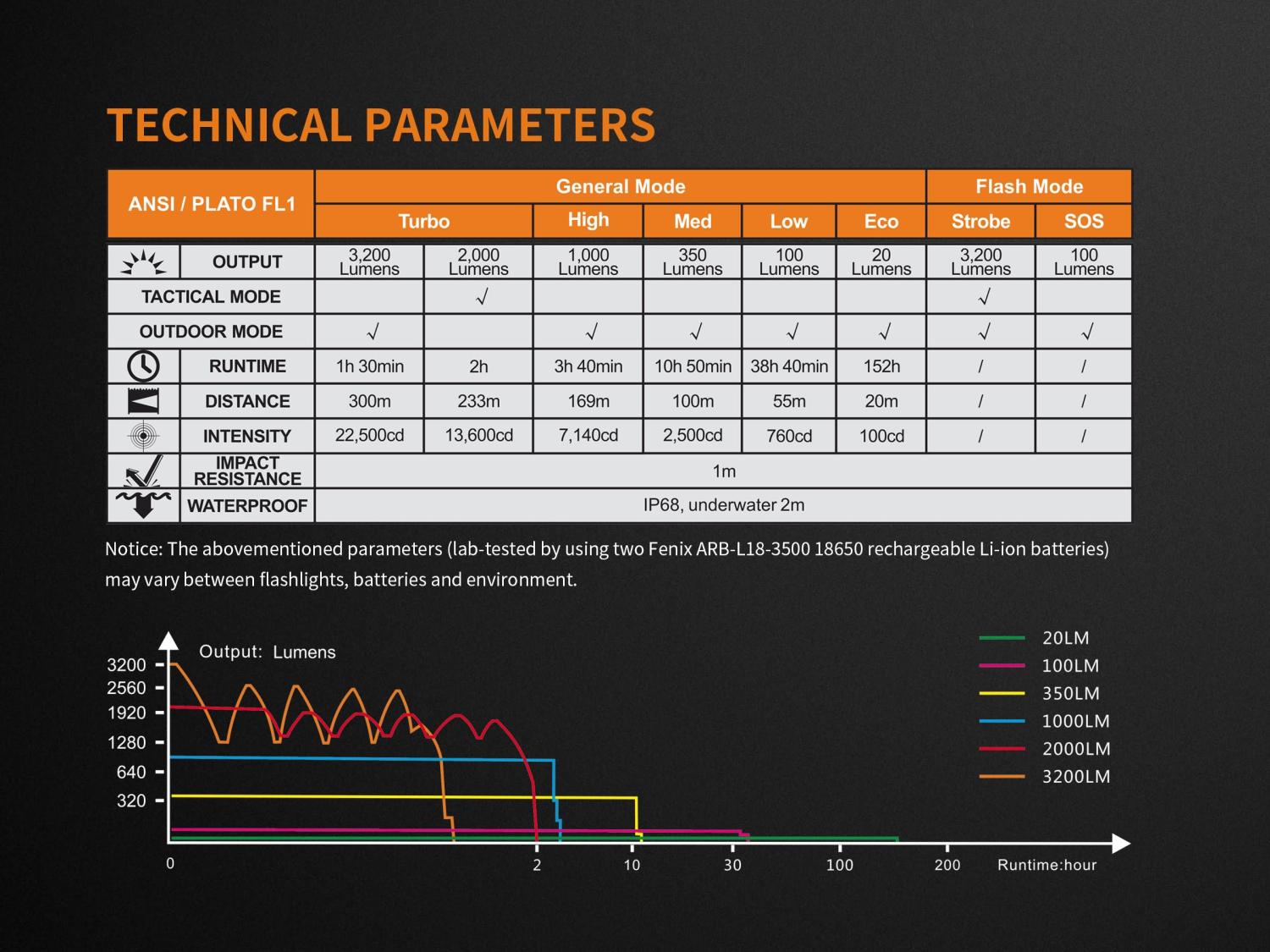 Všetky parametre baterky (svetelný tok, doba svietenia na batérie, vodotesnosť, dosvit a nárazuvzdornosť) sú merané v súlade s normou ANSI/NEMA FL 1-2009 Flashlight Basic Performance Standard.