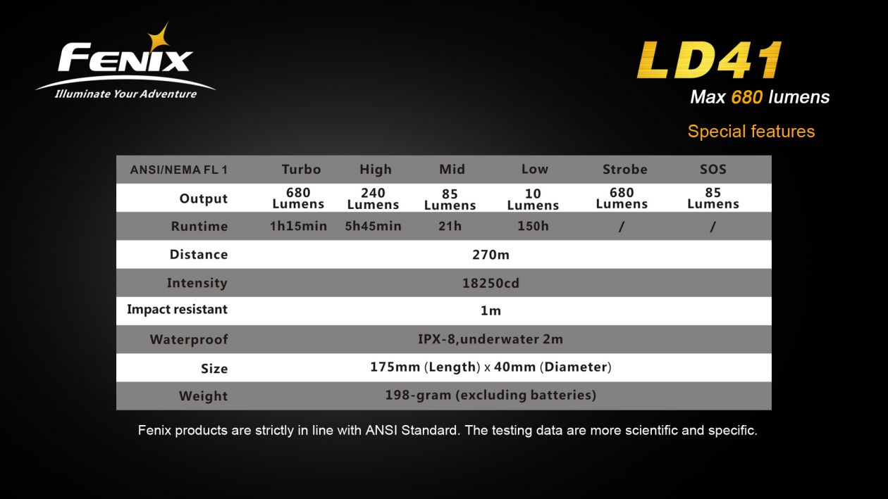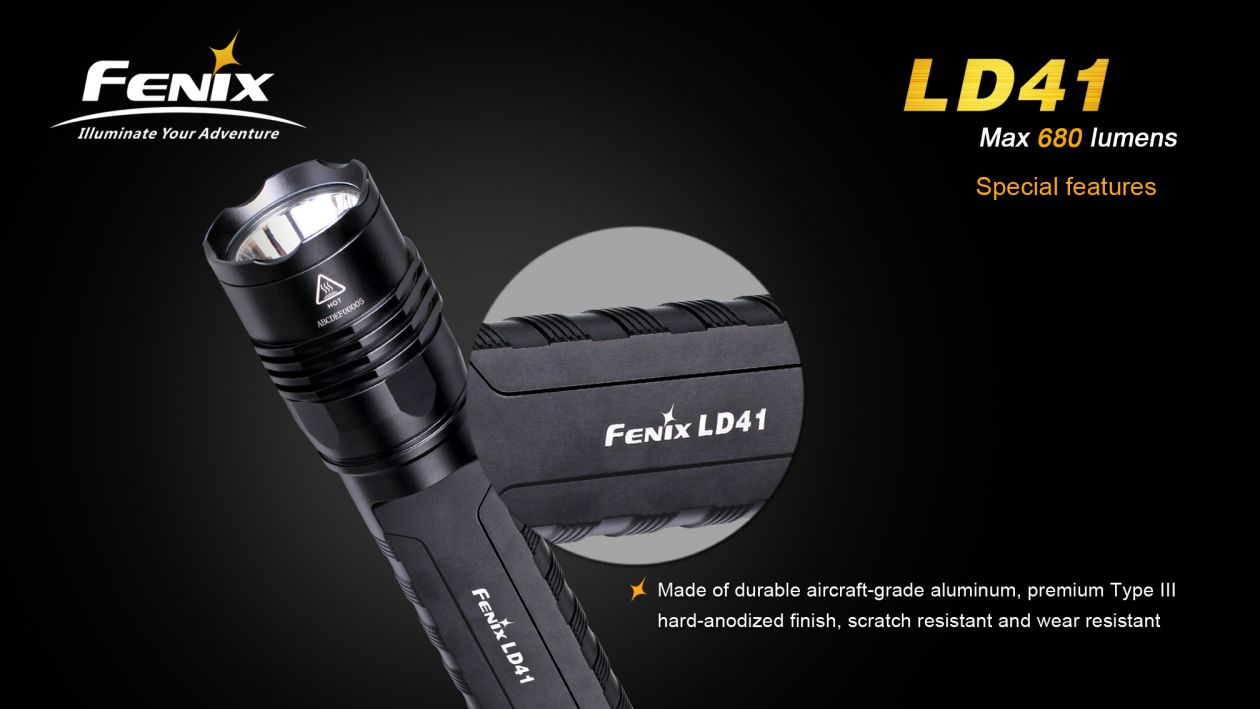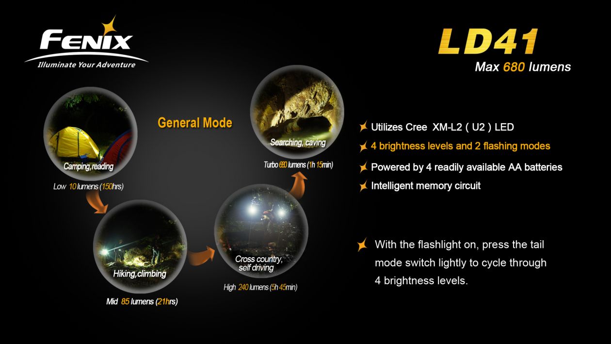 Ručné LED svietidlo Fenix LD41 XM-L2 je osadené špičkovou svetelnou diódou Cree XM-L2 U2 a ponúka šesť režimov svietenia. Svetlo používa digitálnu elektroniku s konštantnou reguláciou pre zaručenie stáleho svetelného výkonu i pri znižovaní napätia v batériách, nechýba ani indikácia vybitých batérií. Ovládanie je pohodlné a rýchle vďaka systému dvoch tlačidiel, hlavným tlačidlom sa svietidlo zapína a druhým menším sa prepína medzi režimami výkonu. Ručné svetlo Fenix LD41 je robustné vysoko výkonné vhodné na turistiku, dohľadávku, pátracie akcie, jaskyniarov a ďalšie použitie.