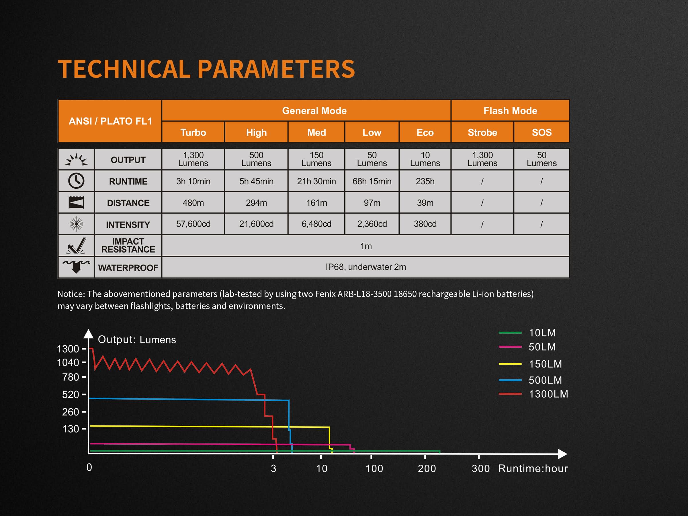 Všetky parametre baterky (svetelný tok, doba svietenia na batérie, vodotesnosť, dosvit a nárazuvzdornosť) sú merané v súlade s normou ANSI/NEMA FL 1-2009 Flashlight Basic Performance Standard.