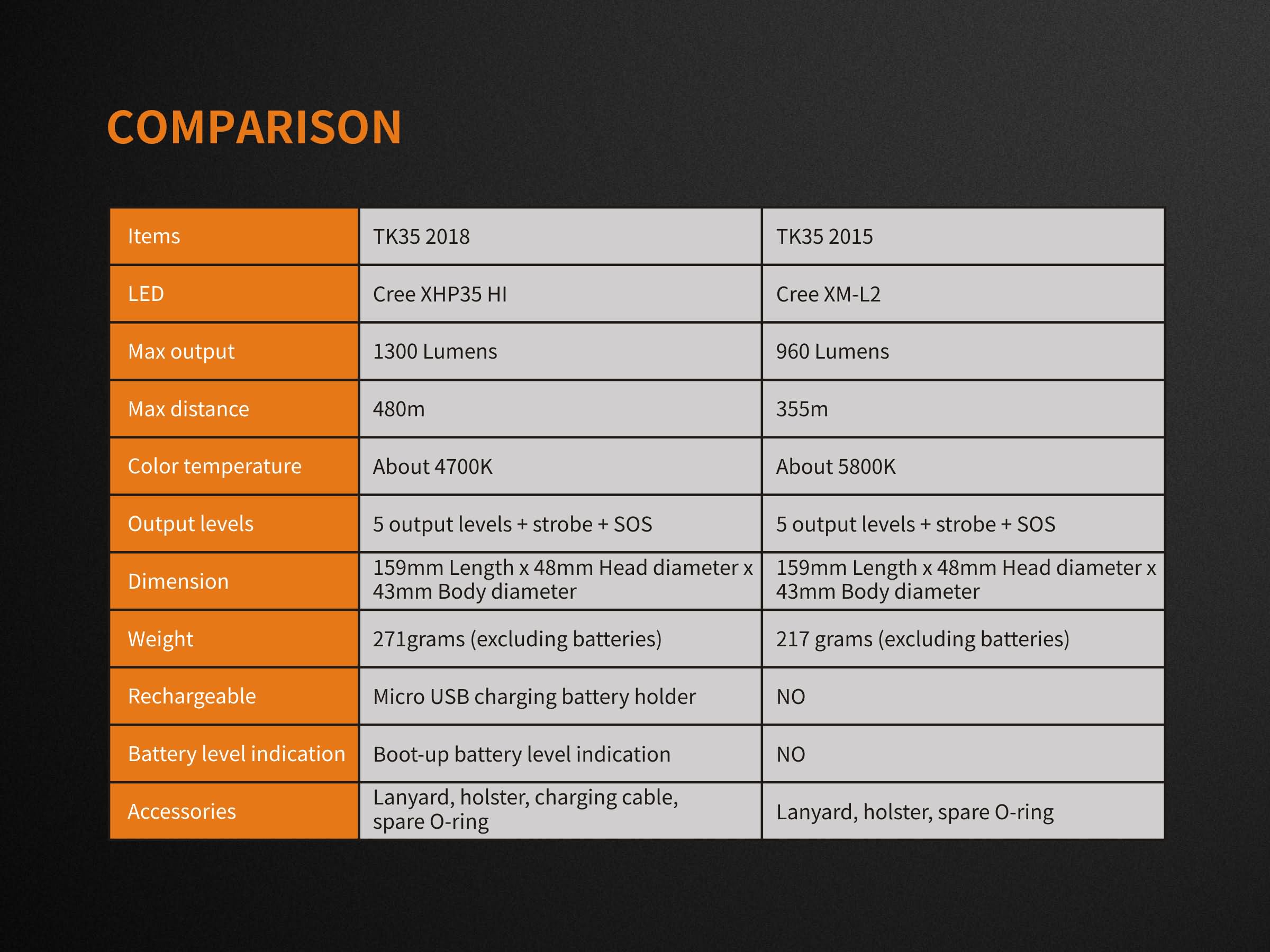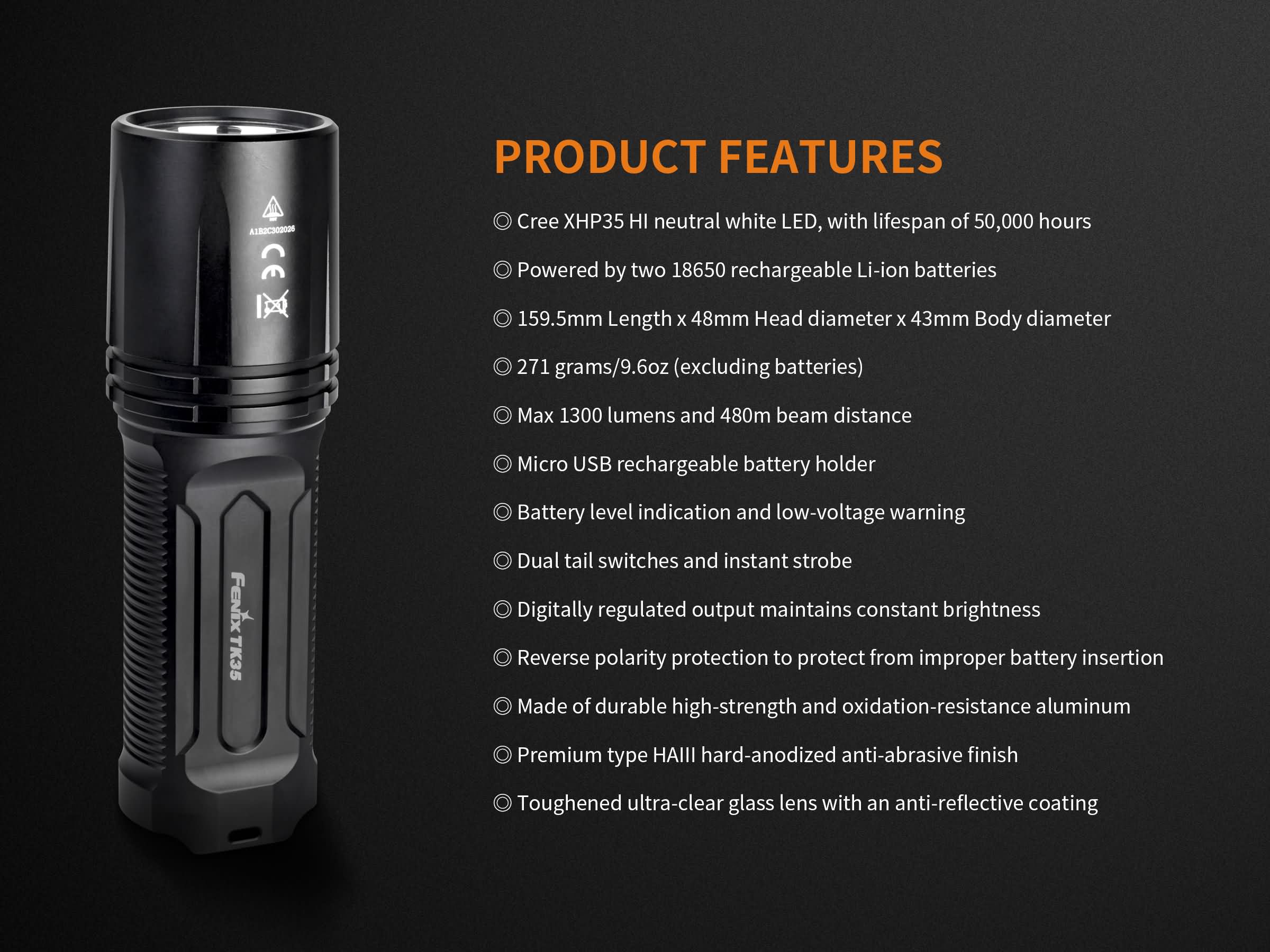 Štvrtá generácia svietidla Fenix TK35 prináša svetelný tok až 1300 lúmenov (ANSI) a dosvit až 480 metrov. Okrem navýšenia výkonu a dosvitu svietidlo ponúka možnosť nabíjania v držiaku batérií cez micro USB konektor. Na napájanie je možné použiť dva Li-ion akumulátory typu 18650 (nie sú súčasťou balenia). Dosvitu 480 metrov bolo dosiahnuté použitím najnovšej vysoko výkonnej LED Cree XHP35 HI s teplejším odtieňom svetla. Svietidlo používa duálny taktický spínač, ktorý umožňuje rýchlejšie a spoľahlivejšie ovládanie v krízových situáciach. Možno ju napríklad ľahko zapnúť priamo do stroboskopického režimu. Celkom sedem konštantne regulovaných úrovní výkonu pre možnosť voľby medzi maximálnym výkonom a výdržou (až 235 hodín), nechýbajú ani dva zábleskové režimy strobe a SOS.
