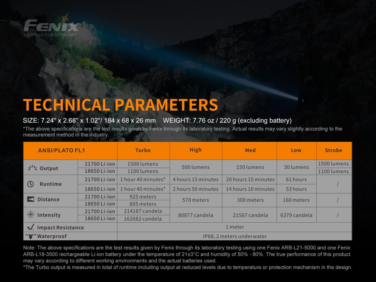 Všetky parametre baterky (svetelný tok, doba svietenia na batérie, vodotesnosť, dosvit a nárazuvzdornosť) sú merané v súlade s normou ANSI/NEMA FL 1-2009 Flashlight Basic Performance Standard.