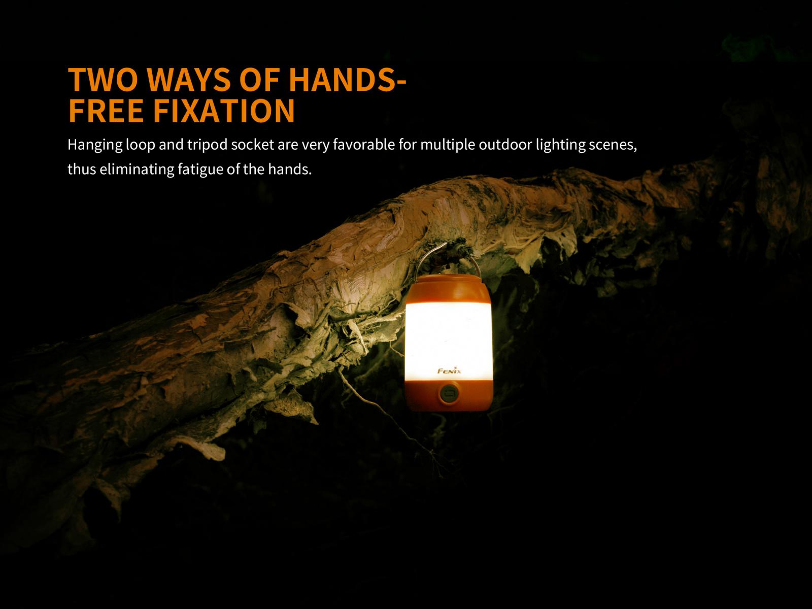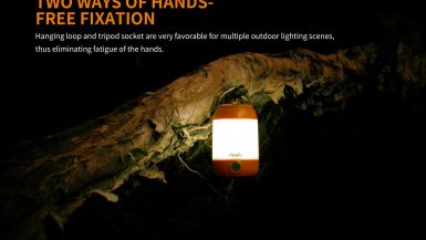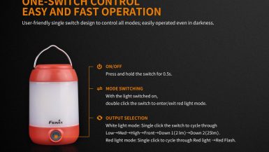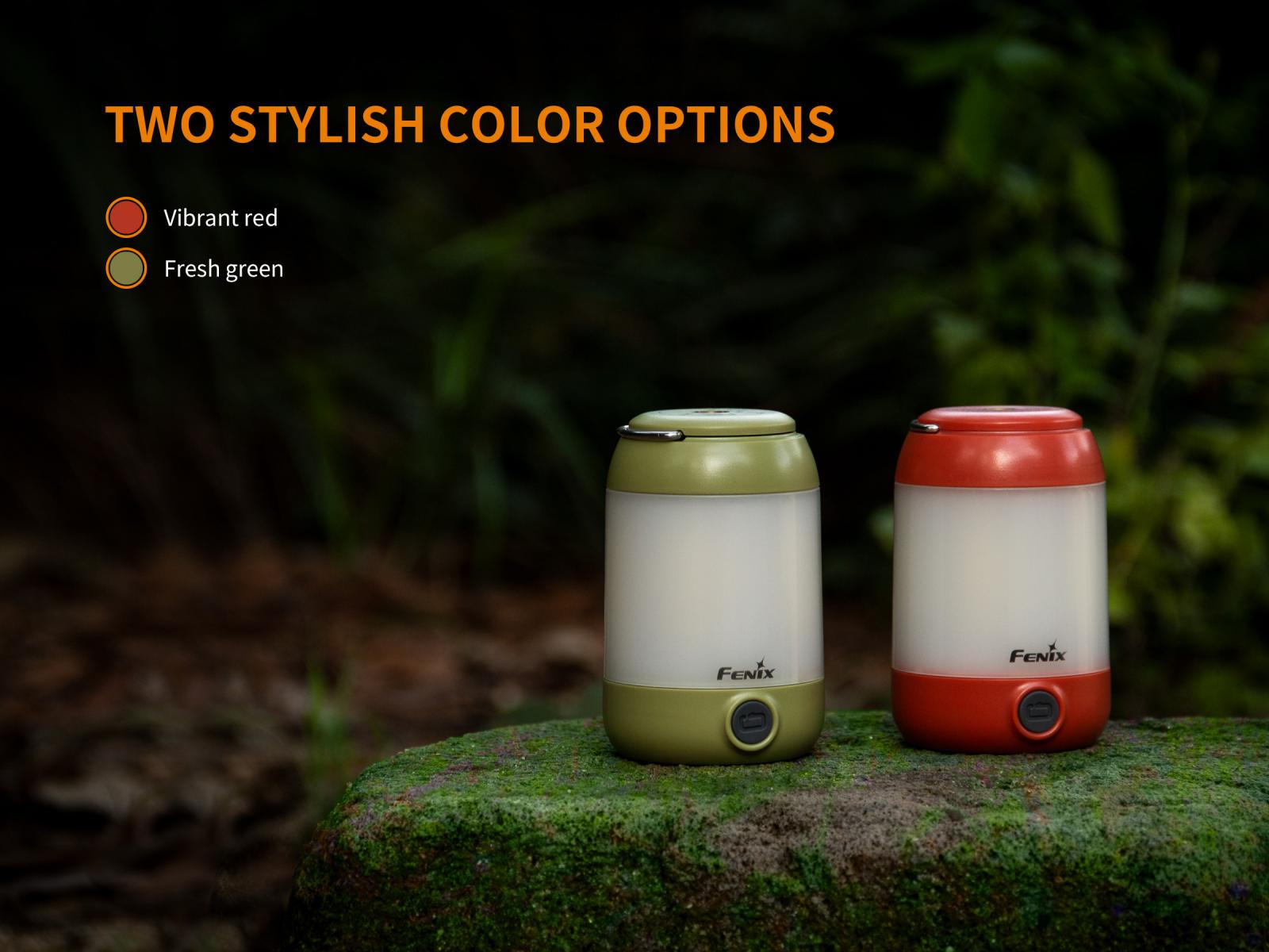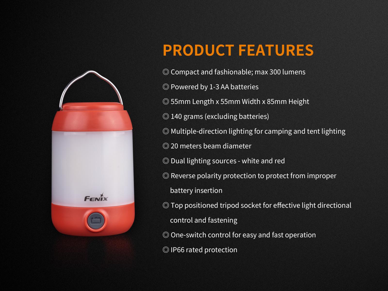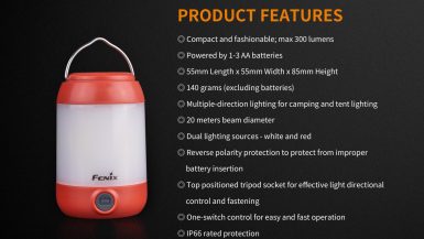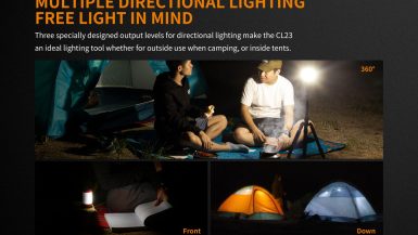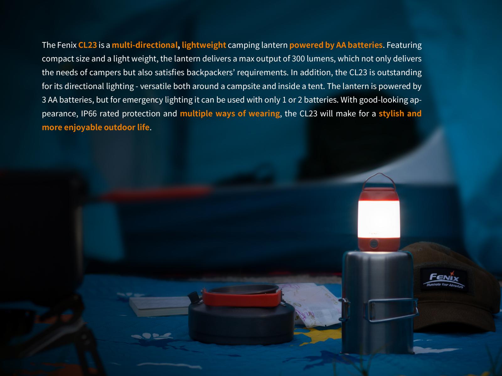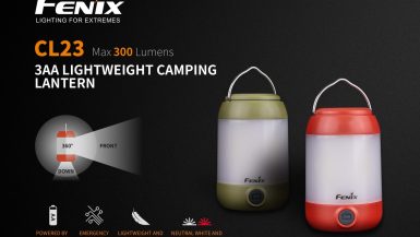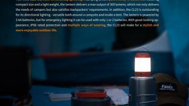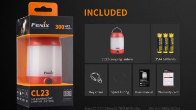 Fenix CL23 je praktická prenosná lucerna, ktorú môžete použiť na osvetlenie miestnosti, stanu, táboriska či pracovného stola. Vysoko jasné SMD diódy ukryté pod valcovým difuzérom poskytujú svetelný tok až 300 lúmenov (ANSI) s neutrálnym odtieňom bieleho svetla. Výhodou tohto odtieňa svetla je prirodzenejšie a kontrastnejšie podanie farieb v prírode. O napájanie sa starajú tri tužkové AA batérie. V núdzi je možné použiť dve alebo aj len jednu batériu, vyššie režimy však nebudú dostupné. Lucerna ponúka celkom osem režimov svietenia vrátane spodného a bočného svietenia a nechýba ani červené svetlo, ktoré nenarušuje adaptáciu očí na tmu.