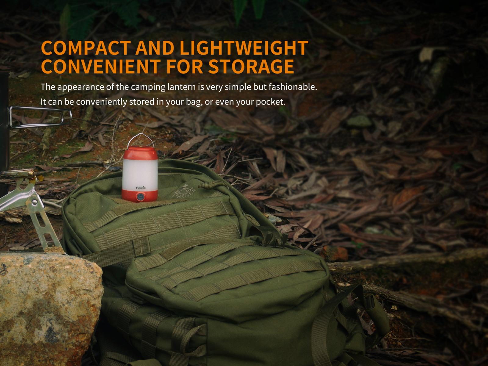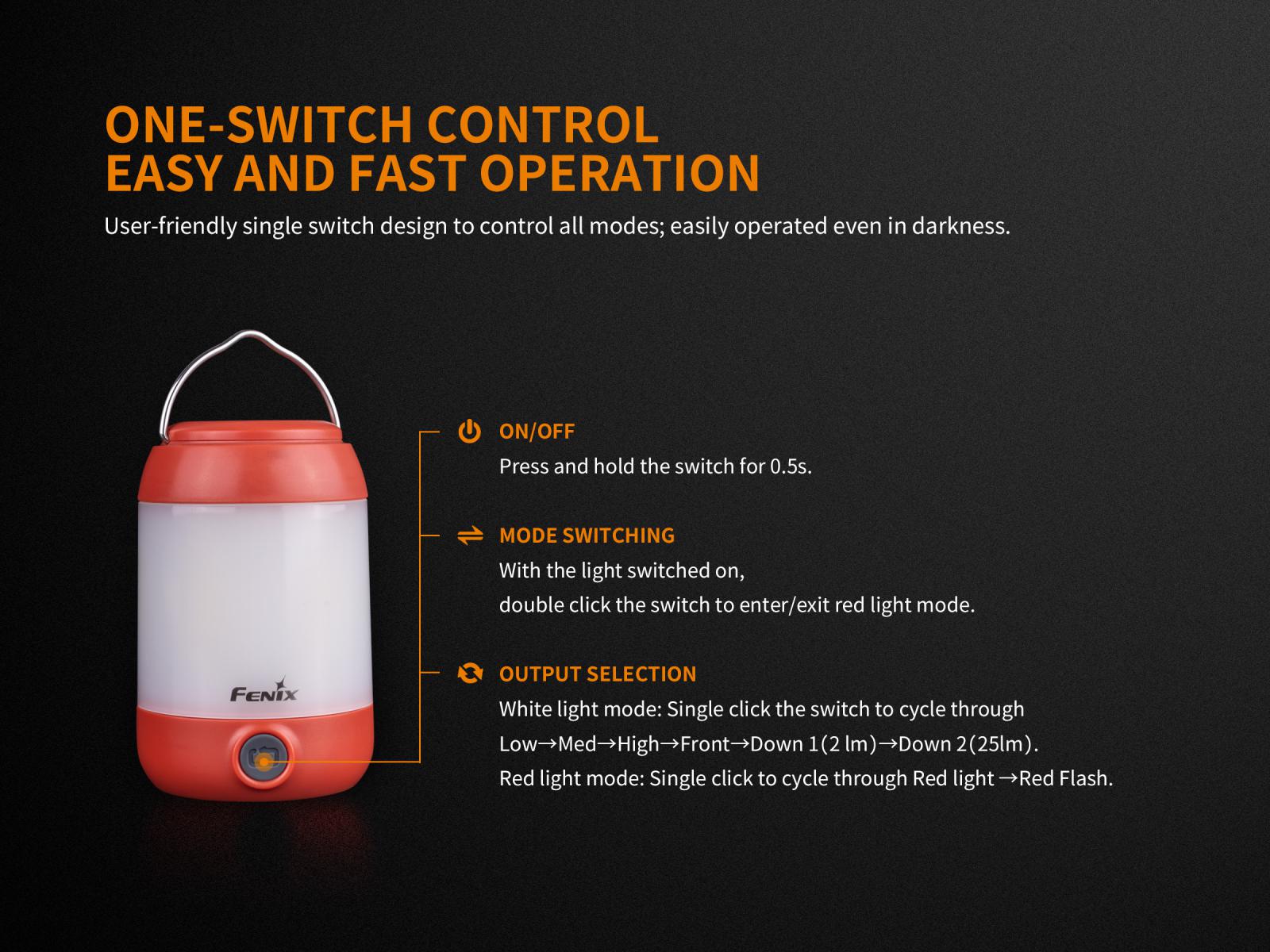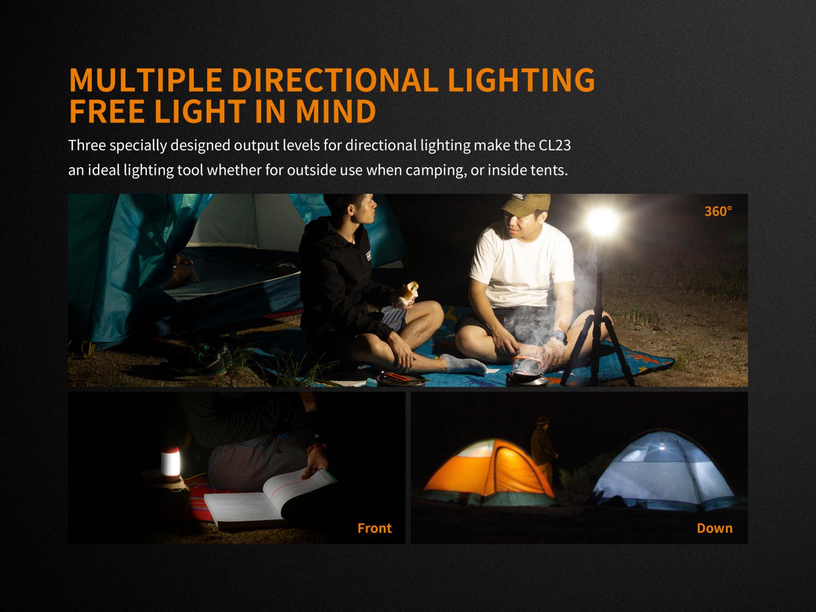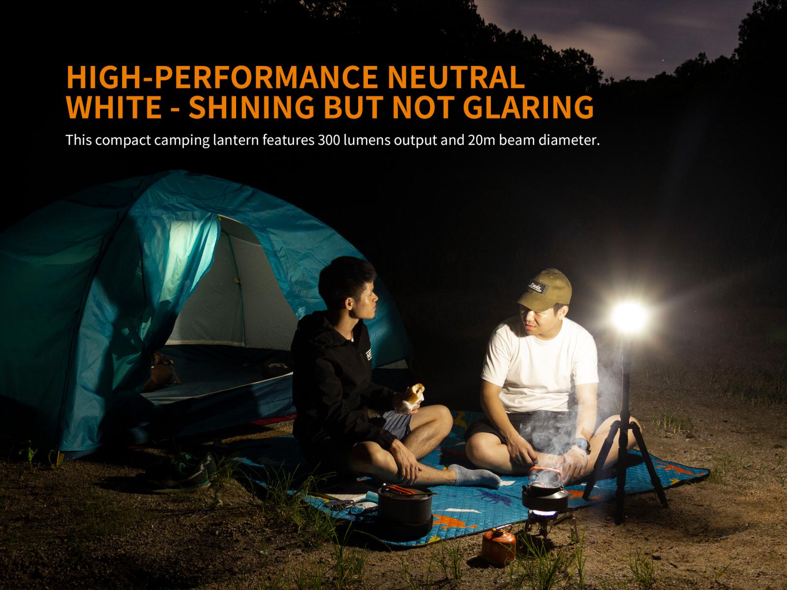 Fenix CL23 je praktická prenosná lucerna, ktorú môžete použiť na osvetlenie miestnosti, stanu, táboriska či pracovného stola. Vysoko jasné SMD diódy ukryté pod valcovým difuzérom poskytujú svetelný tok až 300 lúmenov (ANSI) s neutrálnym odtieňom bieleho svetla. Výhodou tohto odtieňa svetla je prirodzenejšie a kontrastnejšie podanie farieb v prírode. O napájanie sa starajú tri tužkové AA batérie. V núdzi je možné použiť dve alebo aj len jednu batériu, vyššie režimy však nebudú dostupné. Lucerna ponúka celkom osem režimov svietenia vrátane spodného a bočného svietenia a nechýba ani červené svetlo, ktoré nenarušuje adaptáciu očí na tmu.