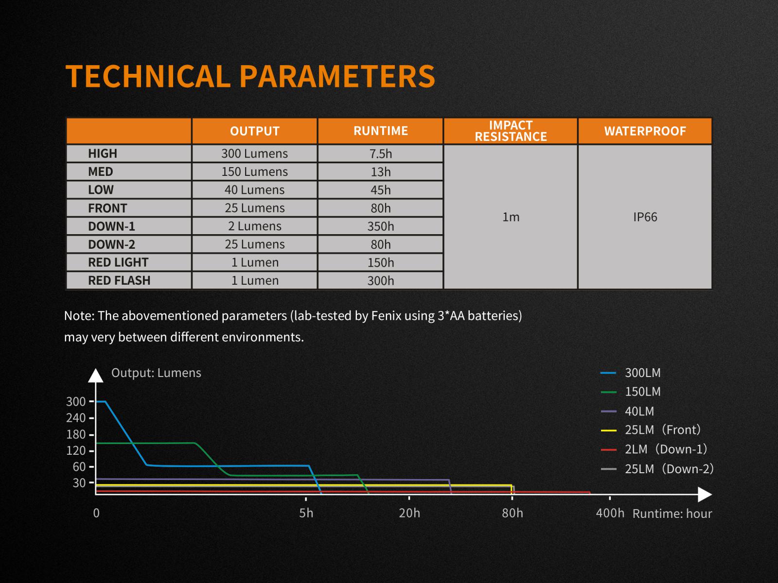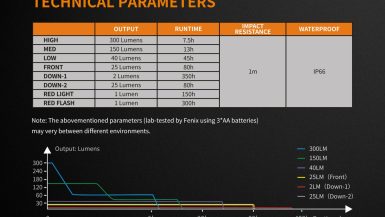 Všetky parametre baterky (svetelný tok, doba svietenia na batérie, vodotesnosť, dosvit a nárazuvzdornosť) sú merané v súlade s normou ANSI/NEMA FL 1-2009 Flashlight Basic Performance Standard.