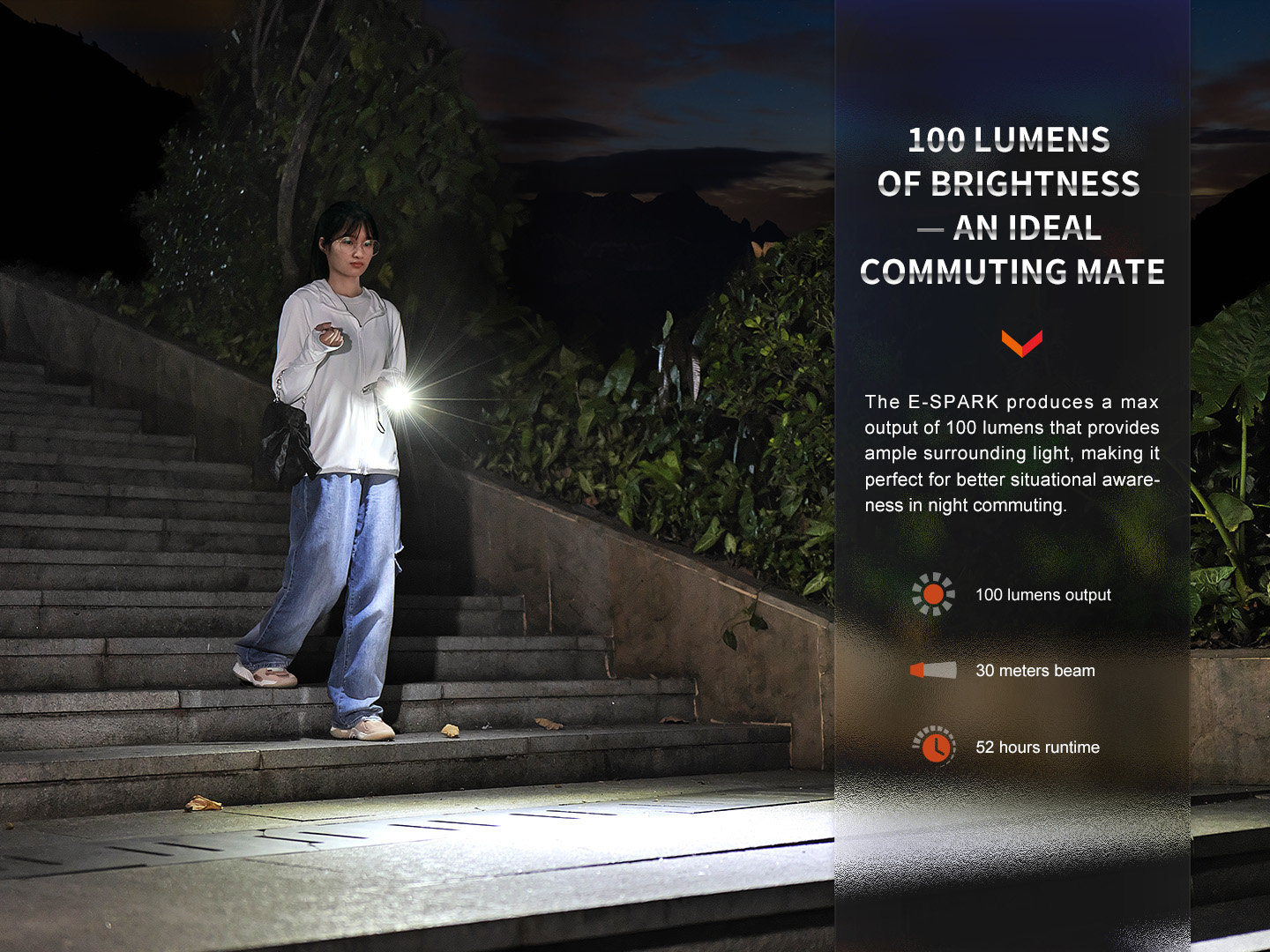 Fenix E-SPARK je dobíjateľná minilucerna s výkonom až 100 lúmenov a možnosťou pripnutia na kľúče. Kombinuje v sebe funkciu svietidla a USB-C powebanky na núdzové použitie, napr. na dobitie telefónu. Napájanie zaisťuje vstavaný Li-pol akumulátor s kapacitou 800 mAh, ktorý sa dobíja prostredníctvom moderného USB-C konektora. Okrem bieleho svetla s dosahom až 30 metrov ponúka svietidlo aj stále červené svetlo a červené blikanie, ktoré môžete použiť na signalizáciu v núdzi alebo zvýšenie svojej viditeľnosti v cestnej premávke. Vďaka plochému tvaru a malej veľkosti môžete mať Fenix E-SPARK stále pri sebe na kľúčoch, vo vrecku či v kabelke.