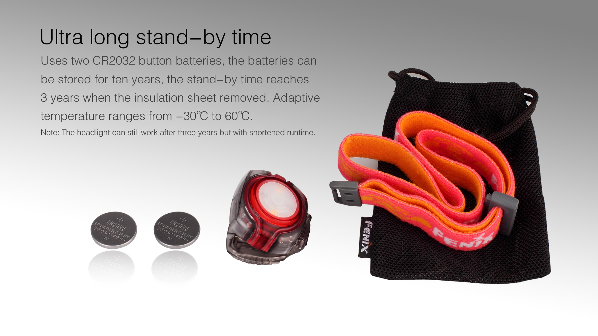 Miniatúrna LED čelovka Fenix HL05 je napájaná dvomi lítiovými batériami CR2032 a prináša štyri svetelné módy vrátane červeného svetla a blikania. Široký svetelný kužeľ, s plynulým rozložením jasu, rovnomerne osvetlí priestor pred vami až do vzdialenosti 4,5 metra. Čelovka je preto obzvlášť vhodná na prácu, pri ktorej potrebujete svietiť na ruky a tiež na kempovanie.