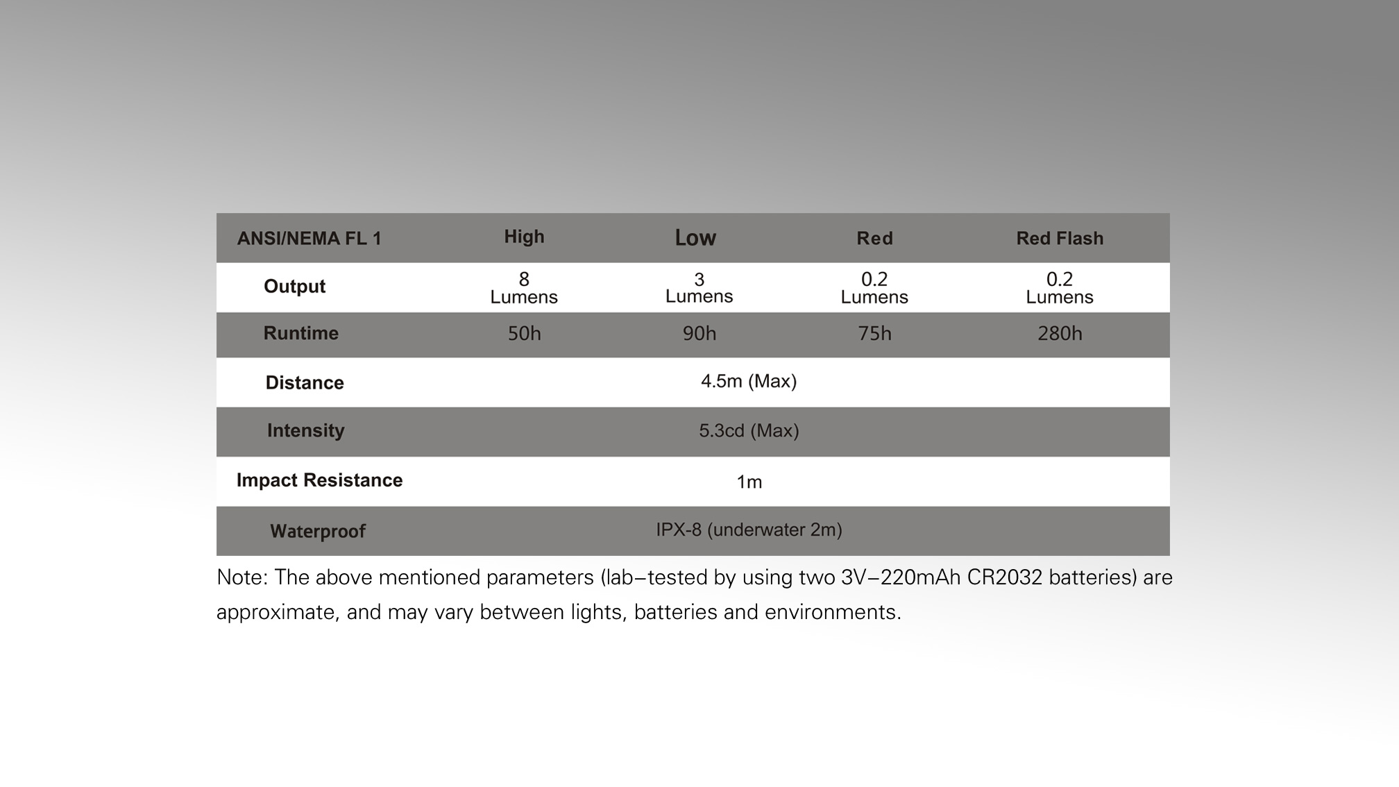 Všetky parametre svietidla (svetelný tok, doba svietenia na batérie, vodotesnosť, dosvit a nárazuvzdornosť) sú merané v súlade s normou ANSI/NEMA FL 1-2009 Flashlight Basic Performance Standard.