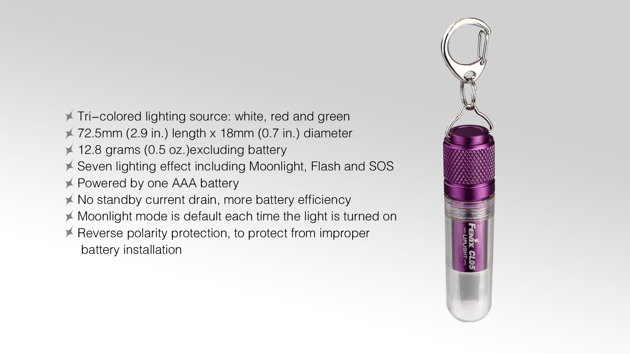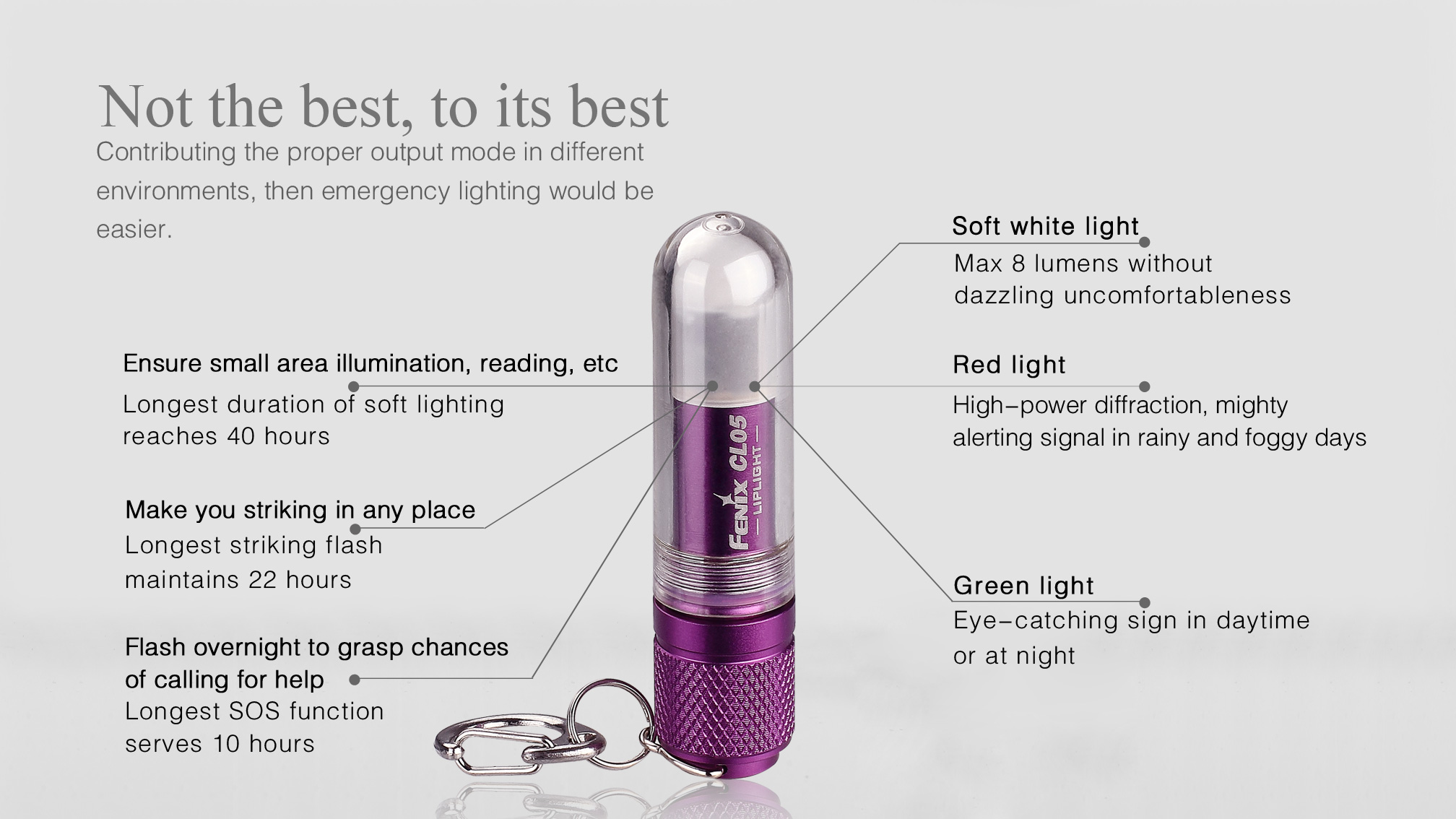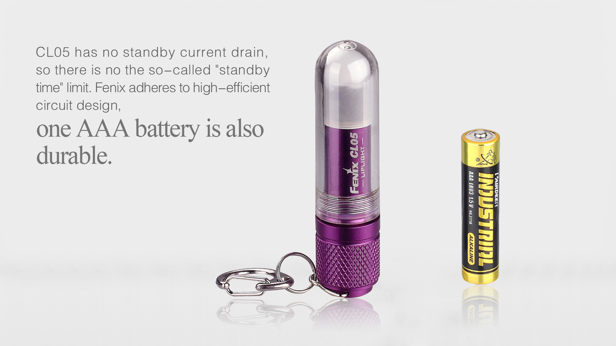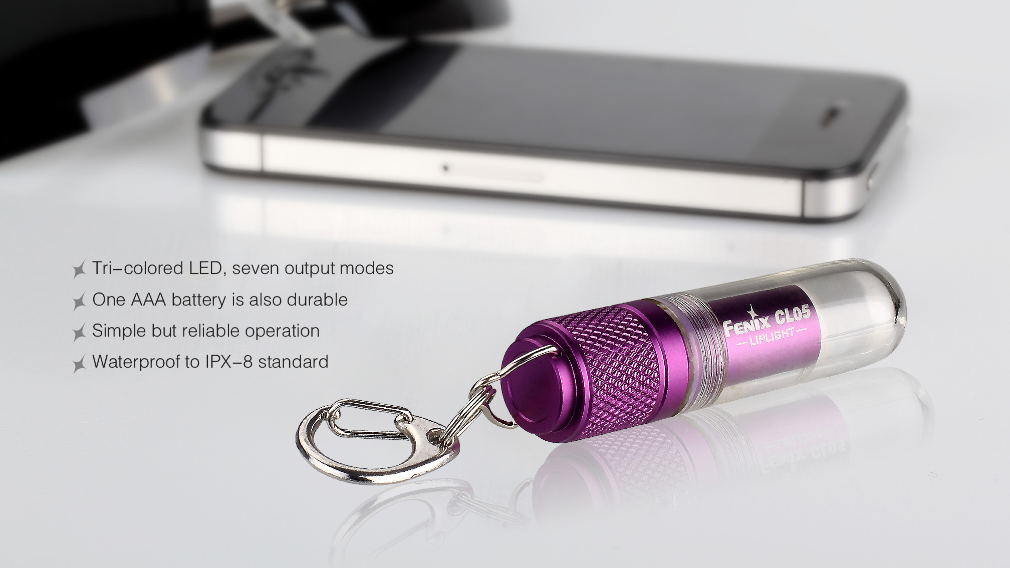 Minilampáš Fenix CL05 je vybavený trojfarebnou LED s bielym, červeným a zeleným svetlom. Vďaka svojim zanedbateľným rozmerom a hmotnosti je vhodný pre EDC a môže byť nosený v podstave kdekoľvek. Pripnete si ho na kľúče, ruksak, alebo ho použijete ako sviečku. Vďaka zábleskovým režimom je možné ho používať aj ako signalizačné a pozičné svetlo. Svietidlo nie je o moc väčšie než mikrotužková batéria z ktorej je napájané. Samozrejmosťou je vysoká kvalita vyhotovenia, odolnosť a vodotesnosť. Svietidlo je svojimi vlastnosťami predurčené na to, aby slúžilo ako ideálny malý spoľahlivý spoločník, ktorý je vždy po ruke.