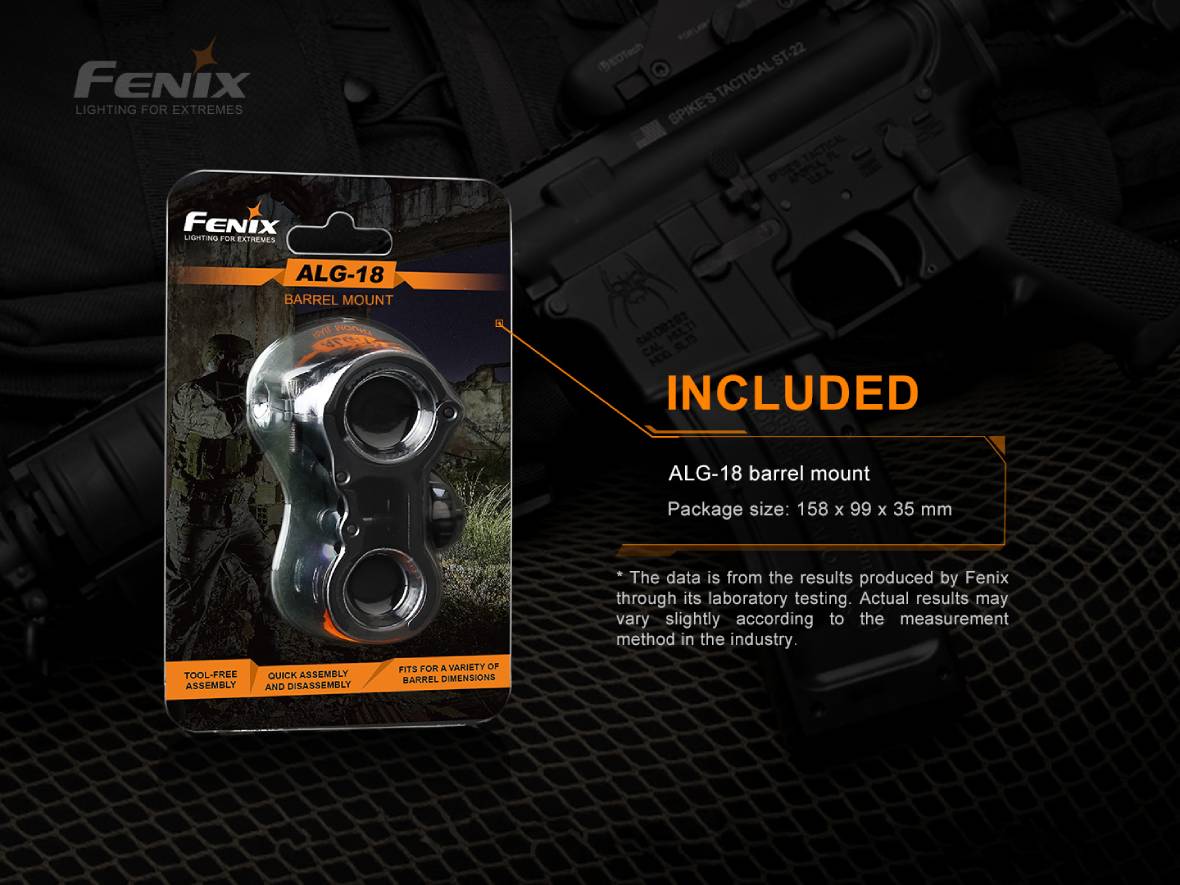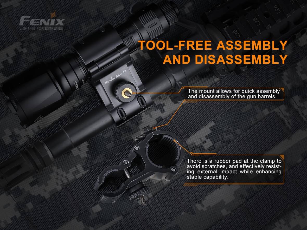 Rýchloupínacia kovová montáž Fenix ALG-18 umožňuje pripevniť svietidlo na hlaveň dlhej zbrane. Vhodná na zbrane s priemerom hlavne 18,0 – 23,0 milimetrov a svietidlá s priemerom tela 23,5 – 28,0 mm. Vhodná napríklad pre svietidlá Fenix TK11 TAC, TK16 V2.0, TK22 V2.0, TK22 UE, TK25 IR, TK25 R&B, TK25 Red, TK25 UV, TK26R, HT18, PD32 V2.0, PD35, UC35, FD41.