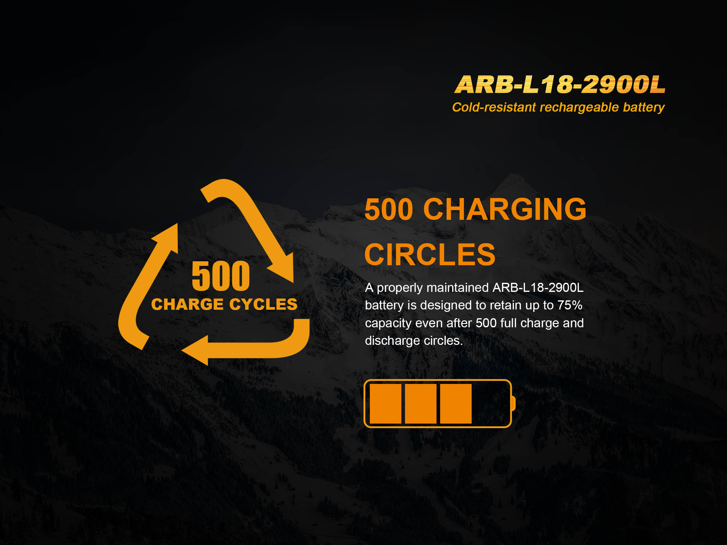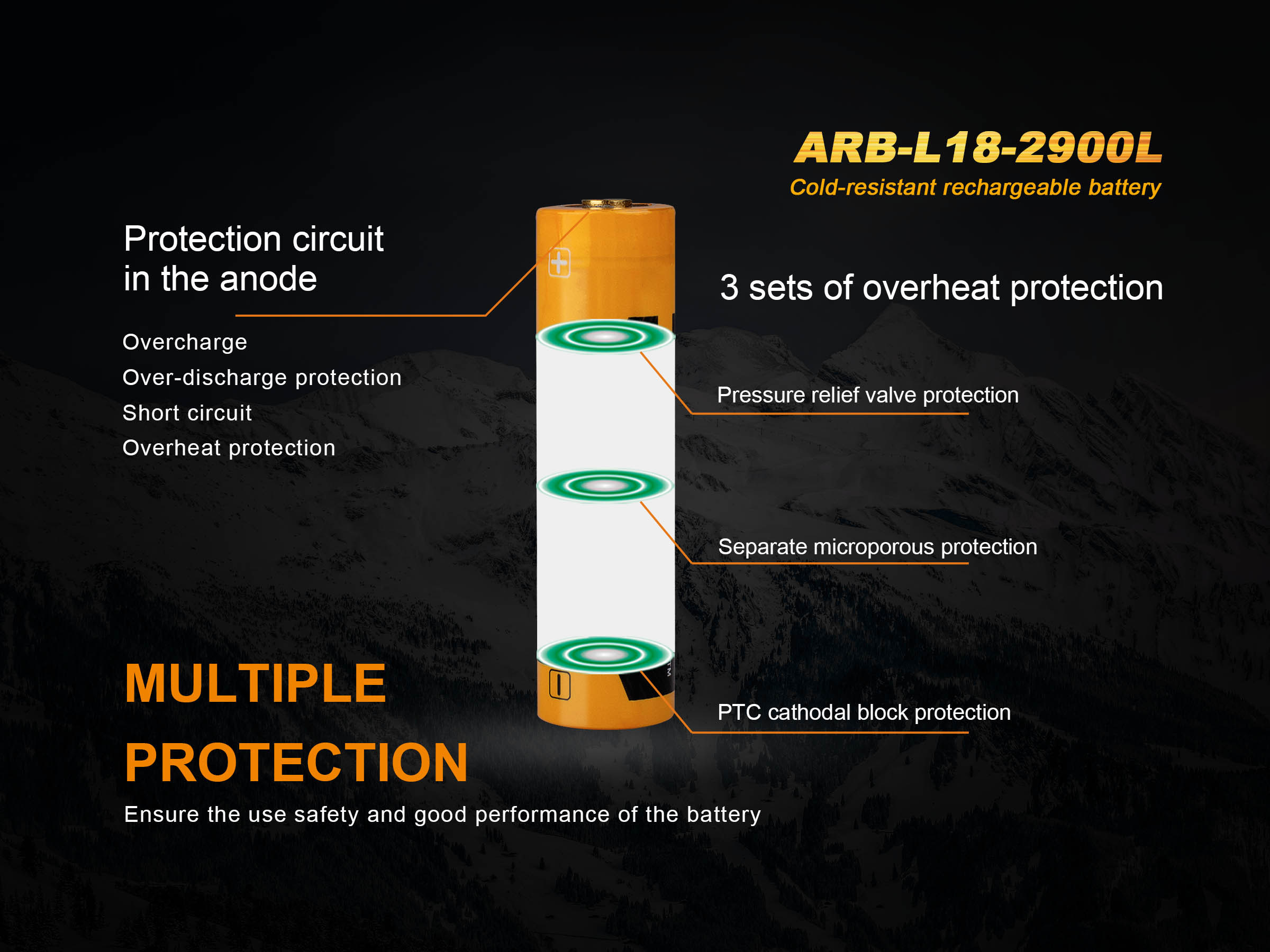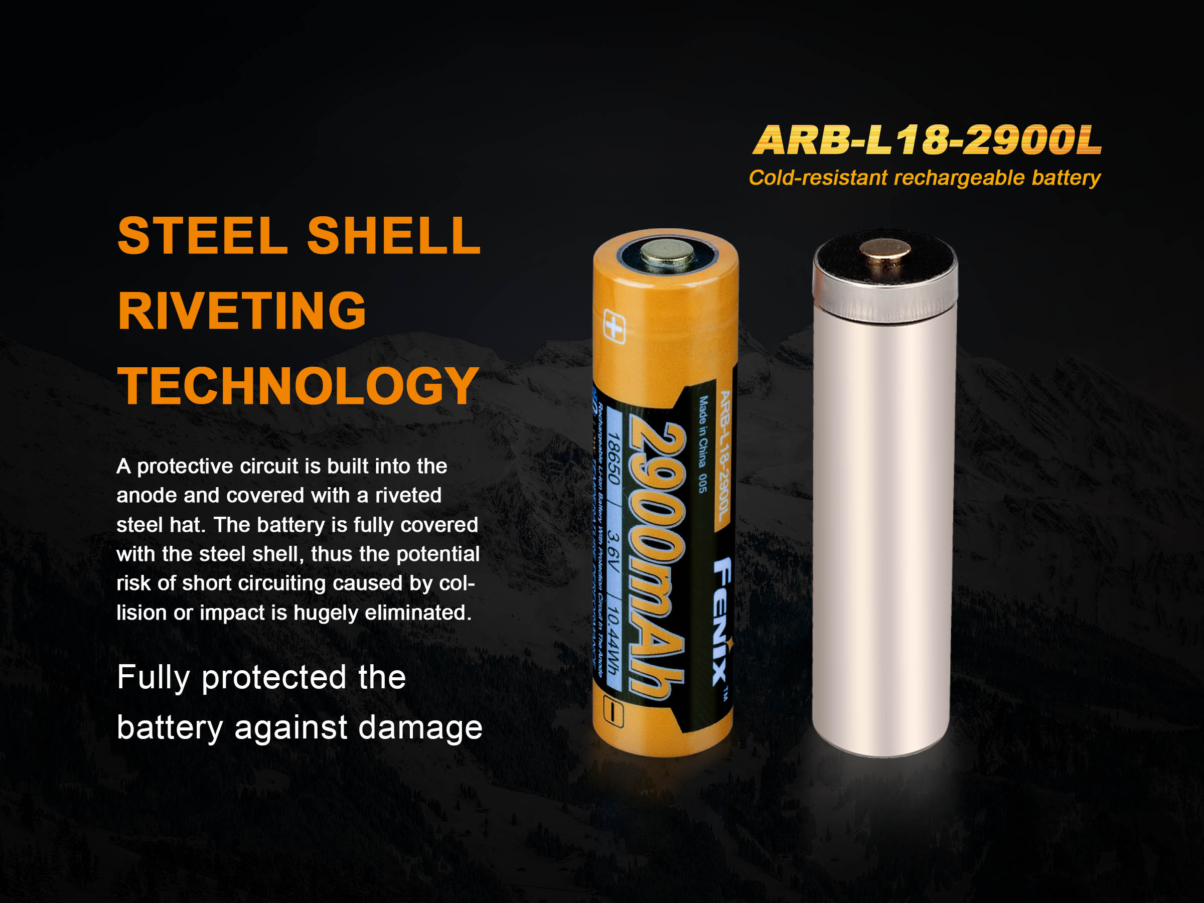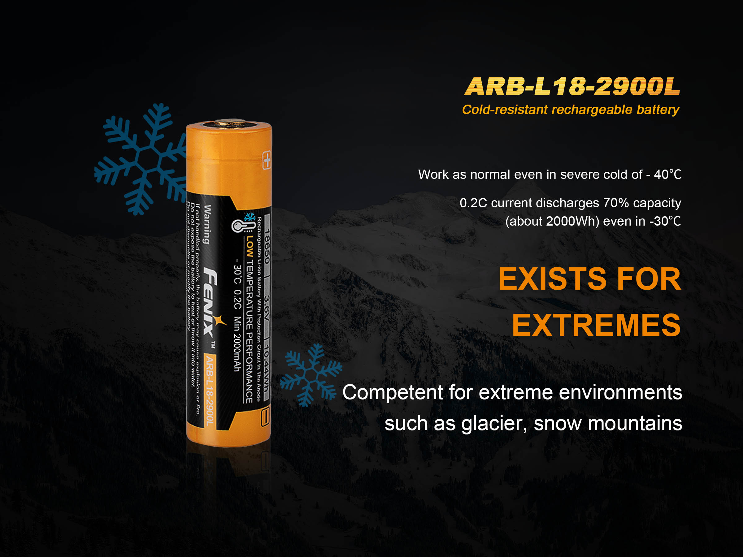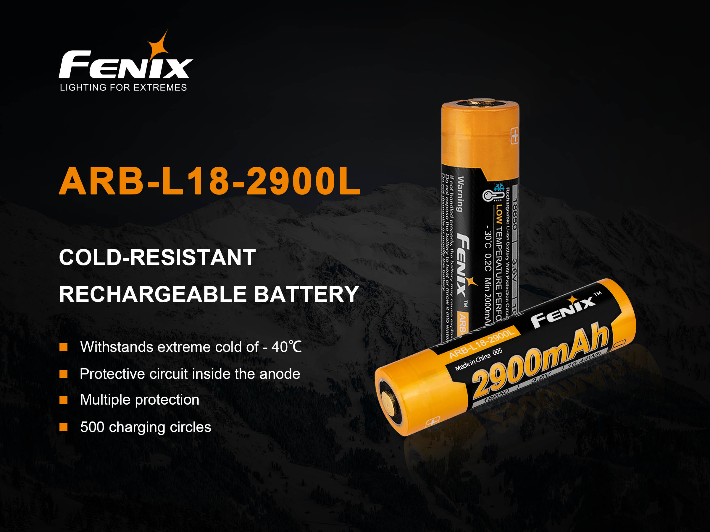 Špeciálna verzia nabíjateľnej batérie Fenix 18650 2900 mAh (ARB-L18-2900L) s ochranou (protected) je založená na článku Panasonic NCR18650F, ktorý bol vyvinutý špeciálne pre použitie v lekárskych a vojenských zariadeniach. Hlavnou prednosťou tohto článku je schopnosť fungovať aj za teplôt hlboko pod nulou až do -40°C. Podľa meraní výrobcu dodá akumulátor cca 70% (2000 mAh) kapacity pri teplote -30°C a vybíjacom prúde 0,2C (580 mA). Li-ion nabíjateľné batérie sa vyznačujú veľmi vysokou kapacitou, netrpia pamäťovým efektom a ani samovybíjaním. Li-ion vo veľkosti 18650 sú najlepšou voľbou z hľadiska uchovania energie vzhľadom k rozmerom a váhe akumulátora.