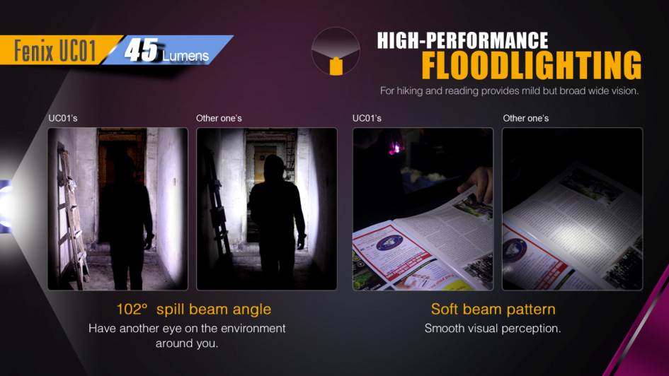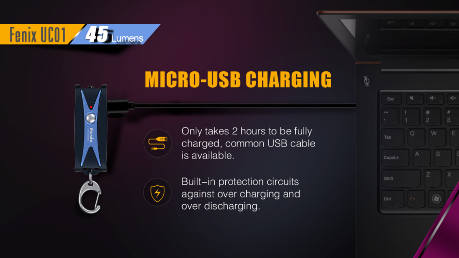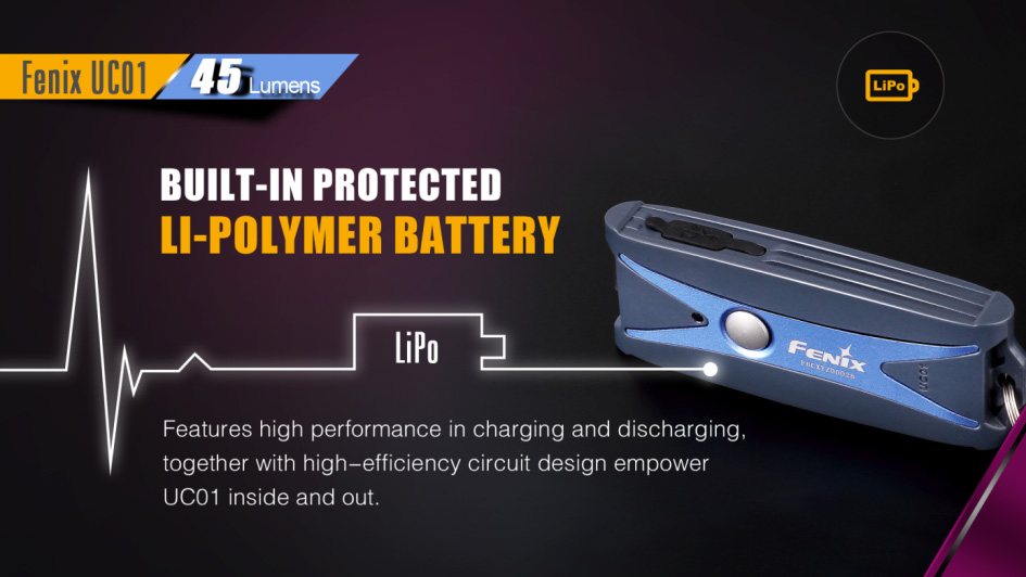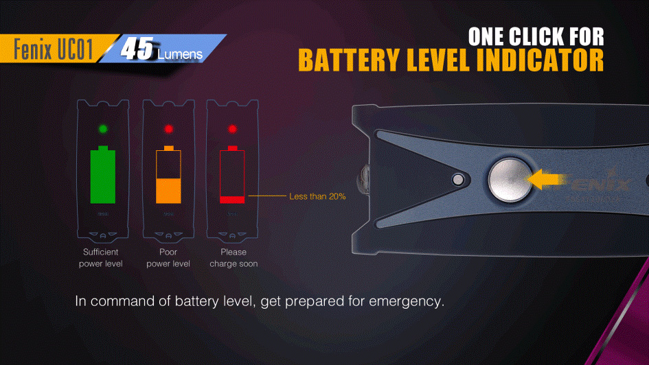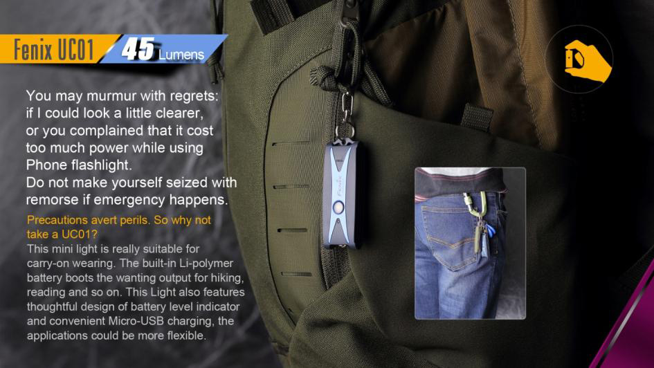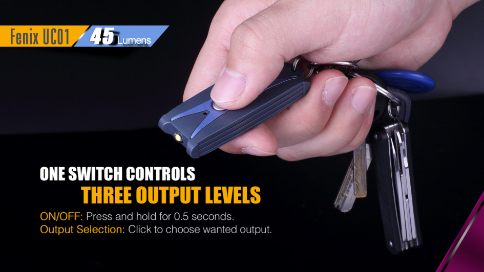 Fenix UC01 je miniatúrna nabíjacia baterka, ktoré je možné nosiť na kľúčoch. Aj napriek minimálnym rozmerom a váhe, ponúka svetelný tok až 45 lúmenov (ANSI). Svetelný kužeľ rovnomerne osvetľuje široký priestor. Na napájanie slúži integrovaný Li-pol akumulátor, ktorý sa nabíja cez micro-USB konektor na boku baterky. K dispozícii sú celkovo tri režimy intenzity s výdržou až 50 hodín v najnižšom režime. Zapnutie aj prepínanie svetelných funkcií sa vykonáva bočným tlačidlom. Baterka je dodávaná spolu s karabínkou na zavesenie na kľúče, takže ho môžete ľahko nosiť stále pri sebe. Praktický je aj indikátor stavu nabitia batérie. S týmto užitočným darčekom urobíte vždy radosť.