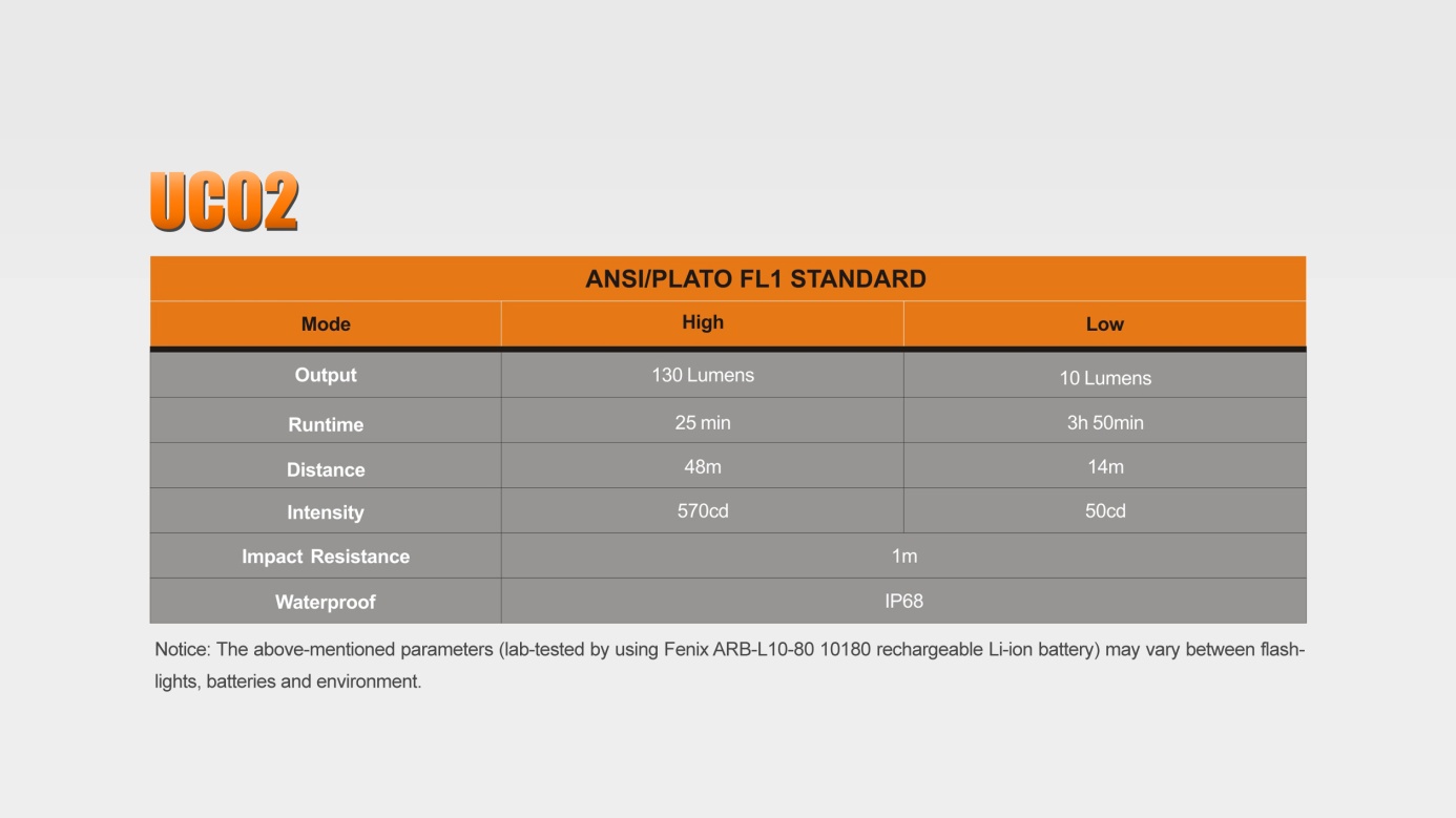 Všetky parametre svietidla (svetelný tok, doba svietenia na batérie, vodotesnosť, dosvit a nárazuvzdornosť) sú merané v súlade s normou ANSI/NEMA FL 1-2009 Flashlight Basic Performance Standard.