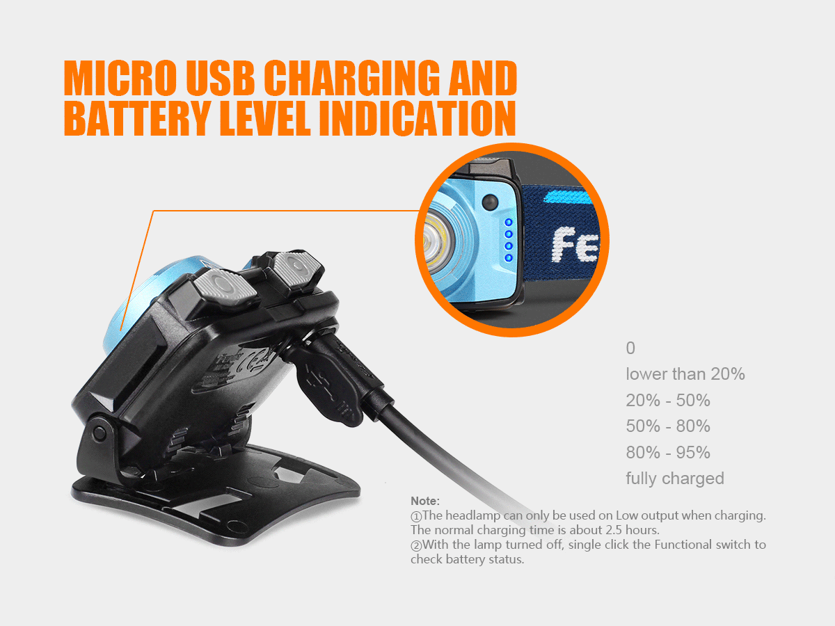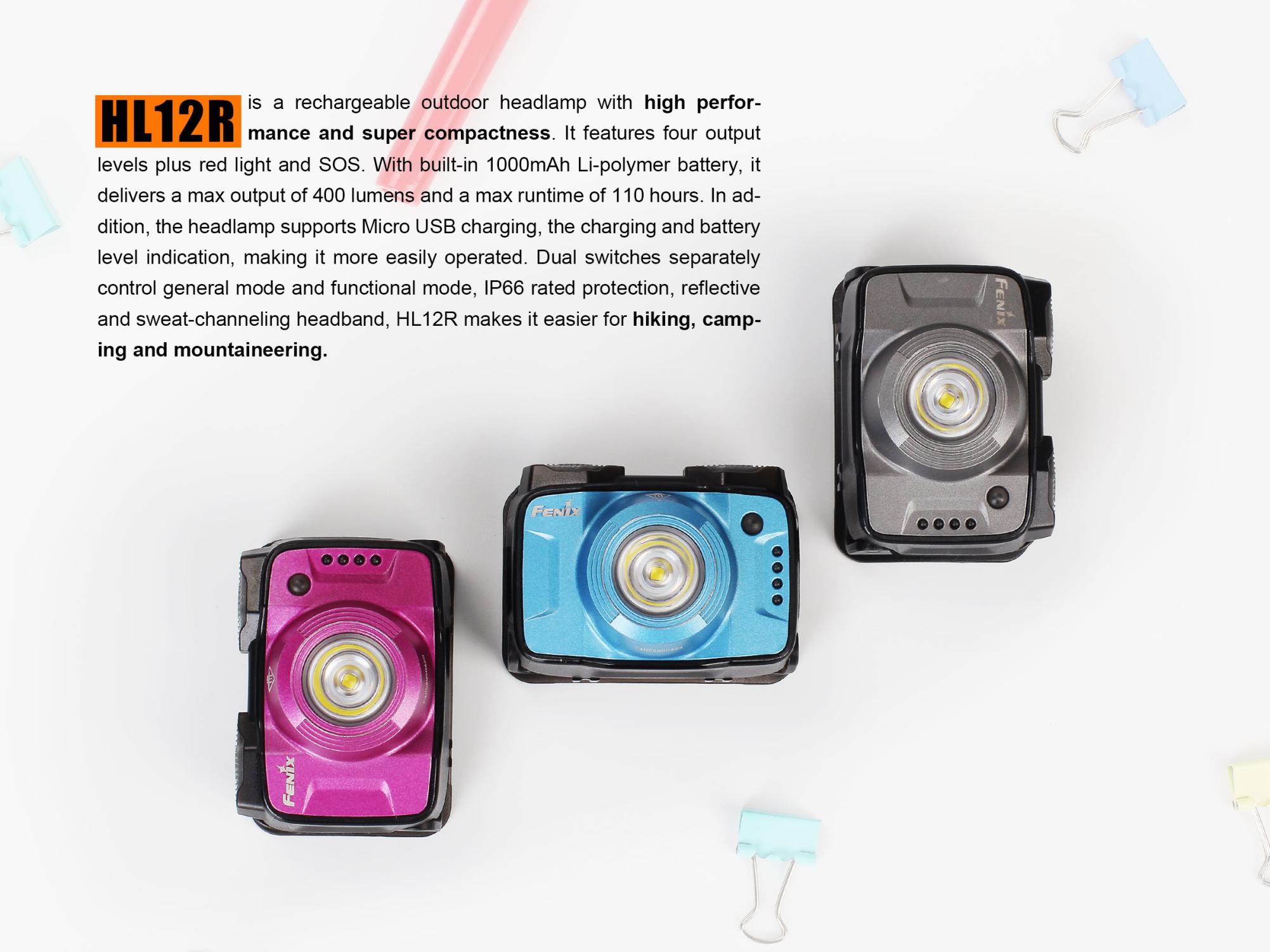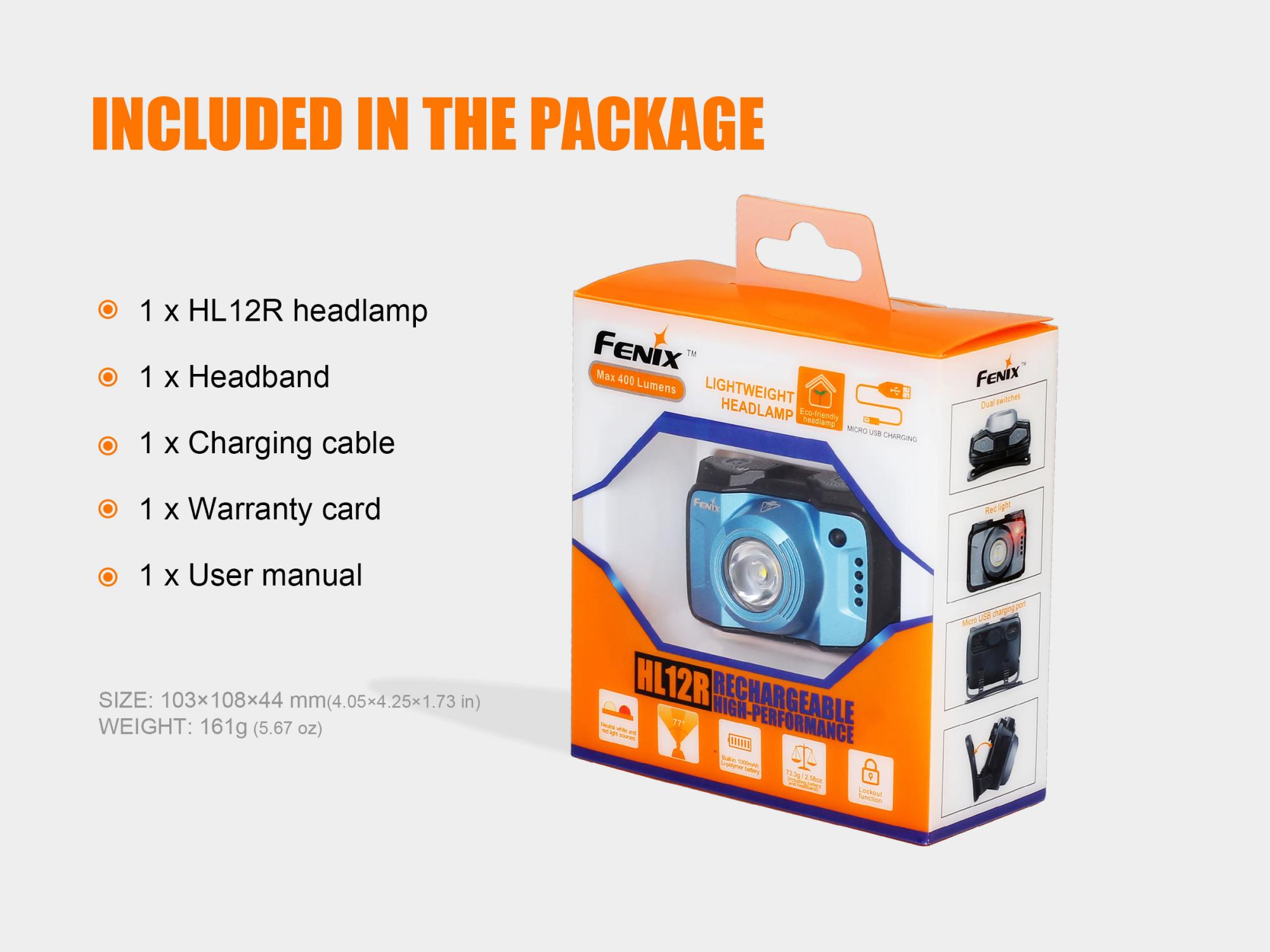 Kompaktná nabíjateľná čelovka Fenix HL12R prináša svetelný tok až 400 lúmenov (ANSI) a dosvit až 64 metrov. Napájanie zabezpečuje zabudovaný lítium-polymérový akumulátor s kapacitou 1000 mAh, ktorý sa nabíja cez micro-USB konektor priamo v čelovke. Zdrojom svetla je moderná LED Cree XP-G2 s teplejším odtieňom svetla (neutral white) a červená LED Nichia. Výhodou neutrálneho odtieňa svetla je prirodzenejšie a kontrastnejšie podanie farieb v prírode. Hlavná LED je usadená v optike, ktorá vytvára široký plynulý kužeľ svetla, ideálny napríklad na turistiku, horolezectvo, pracovné použitie i beh.