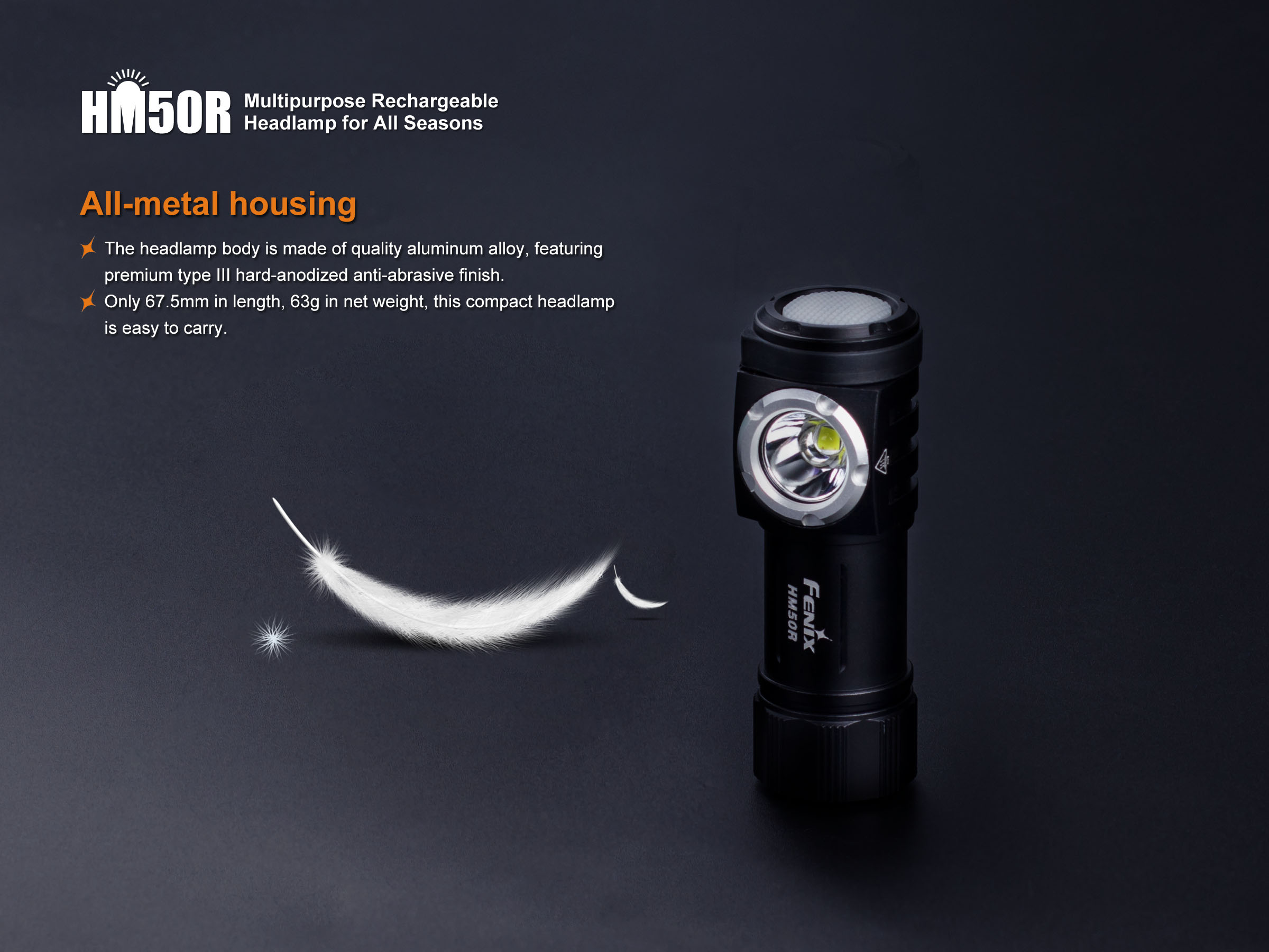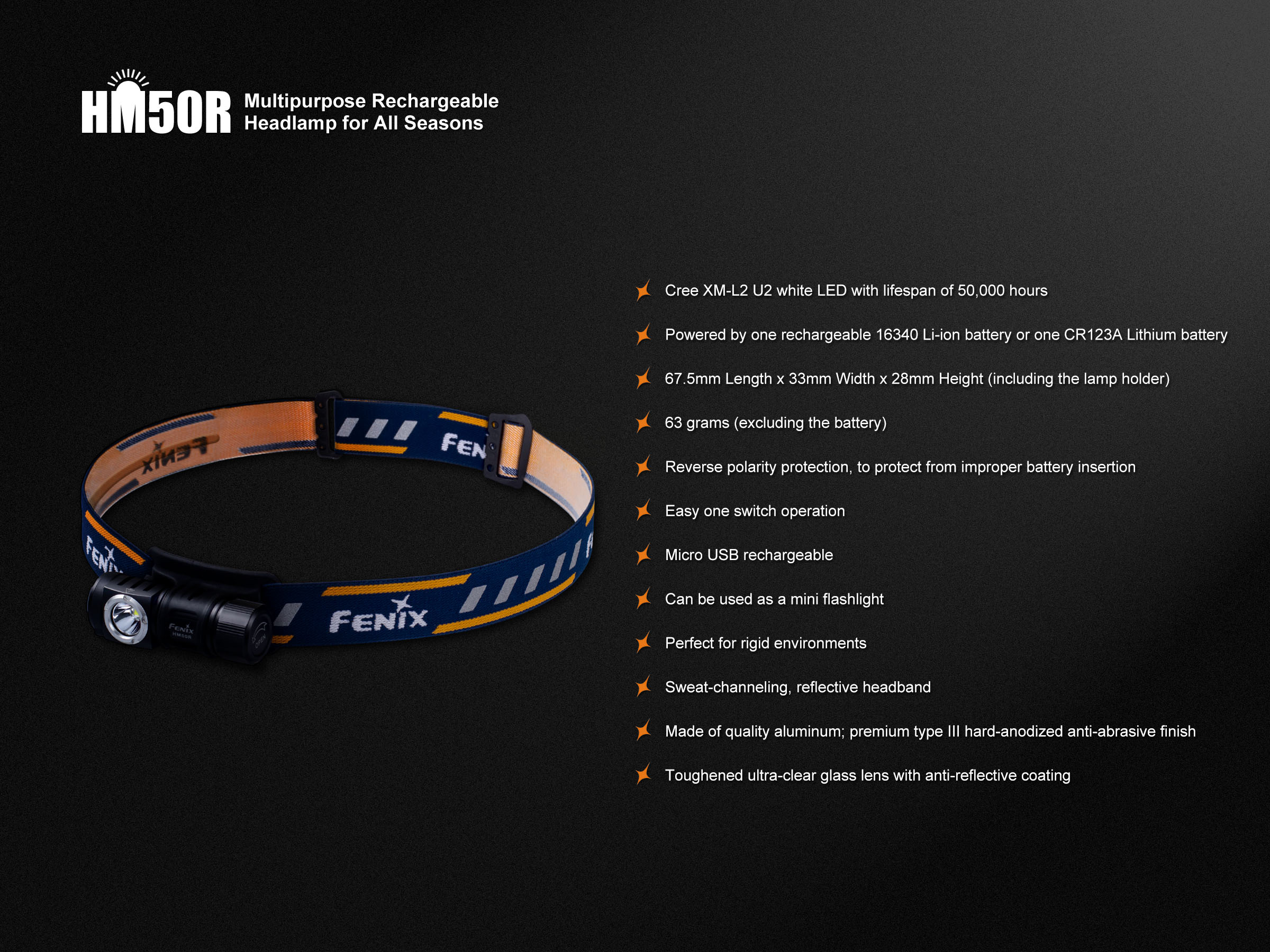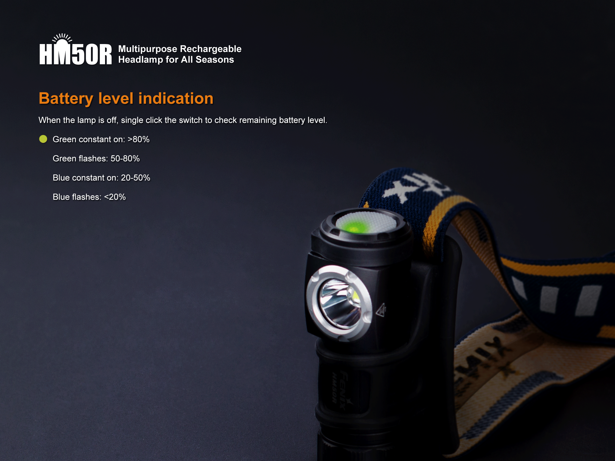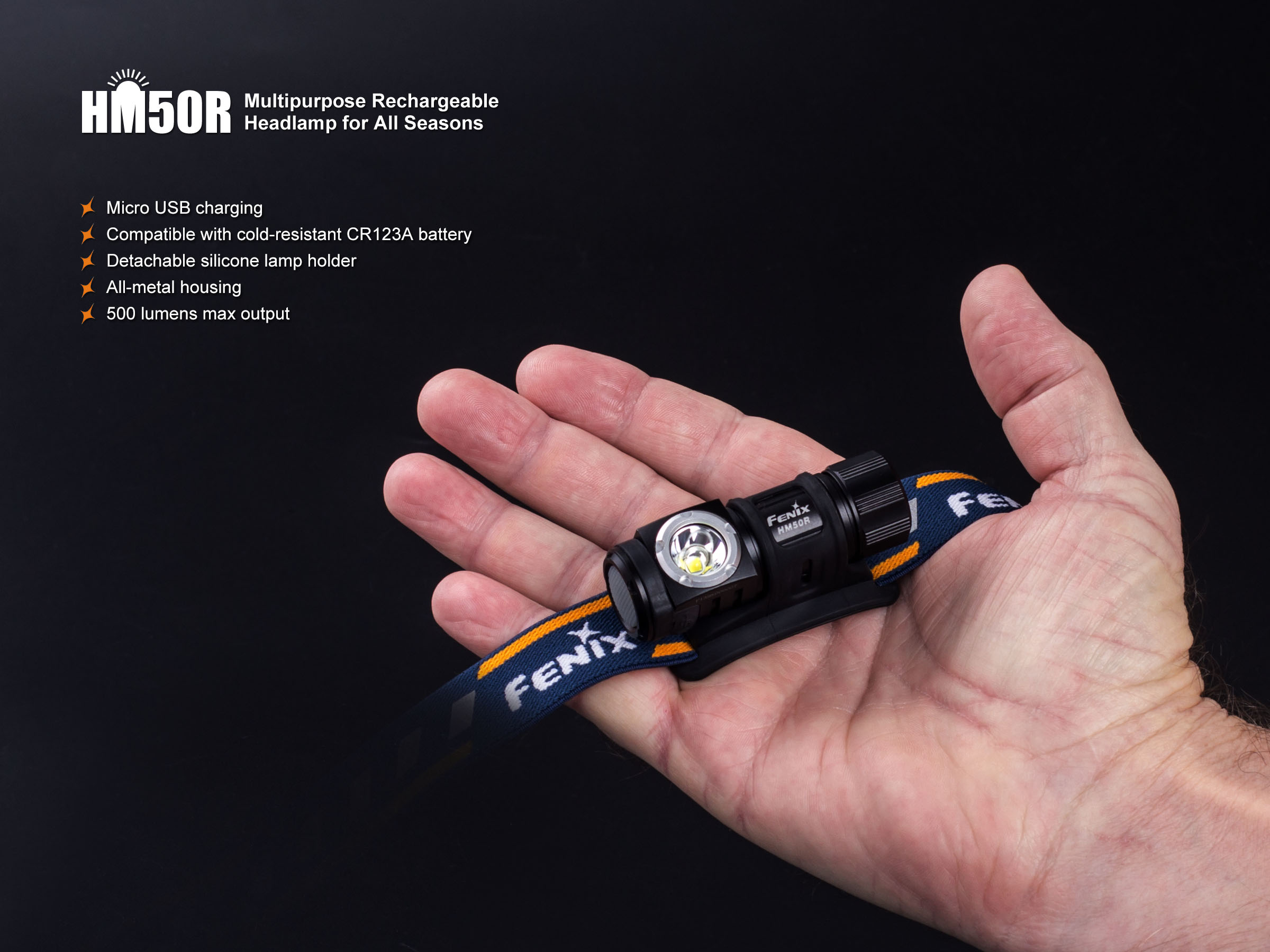 Fenix HM50R je malá, vysoko výkonná nabíjateľná čelovka s funkciou predlžujúcou výdrž. Na napájanie je možné použiť buď Li-ion akumulátor RCR123 (je súčasťou balenia), alebo jednorázovú batériu CR123A. Akumulátor RCR123A možno dobíjať cez micro USB konektor priamo v čelovke. Cez svoje kompaktné rozmery ponúka úctyhodný svetelný tok až 500 lúmenov a dosvit až 80 metrov. Svetelným zdrojom je špičková LED Cree XM-L2 U2. V ovládacom tlačidle na boku čelovky je zabudovaná indikačná dióda, ktorá po stlačení ukazuje stav nabitia batérie.