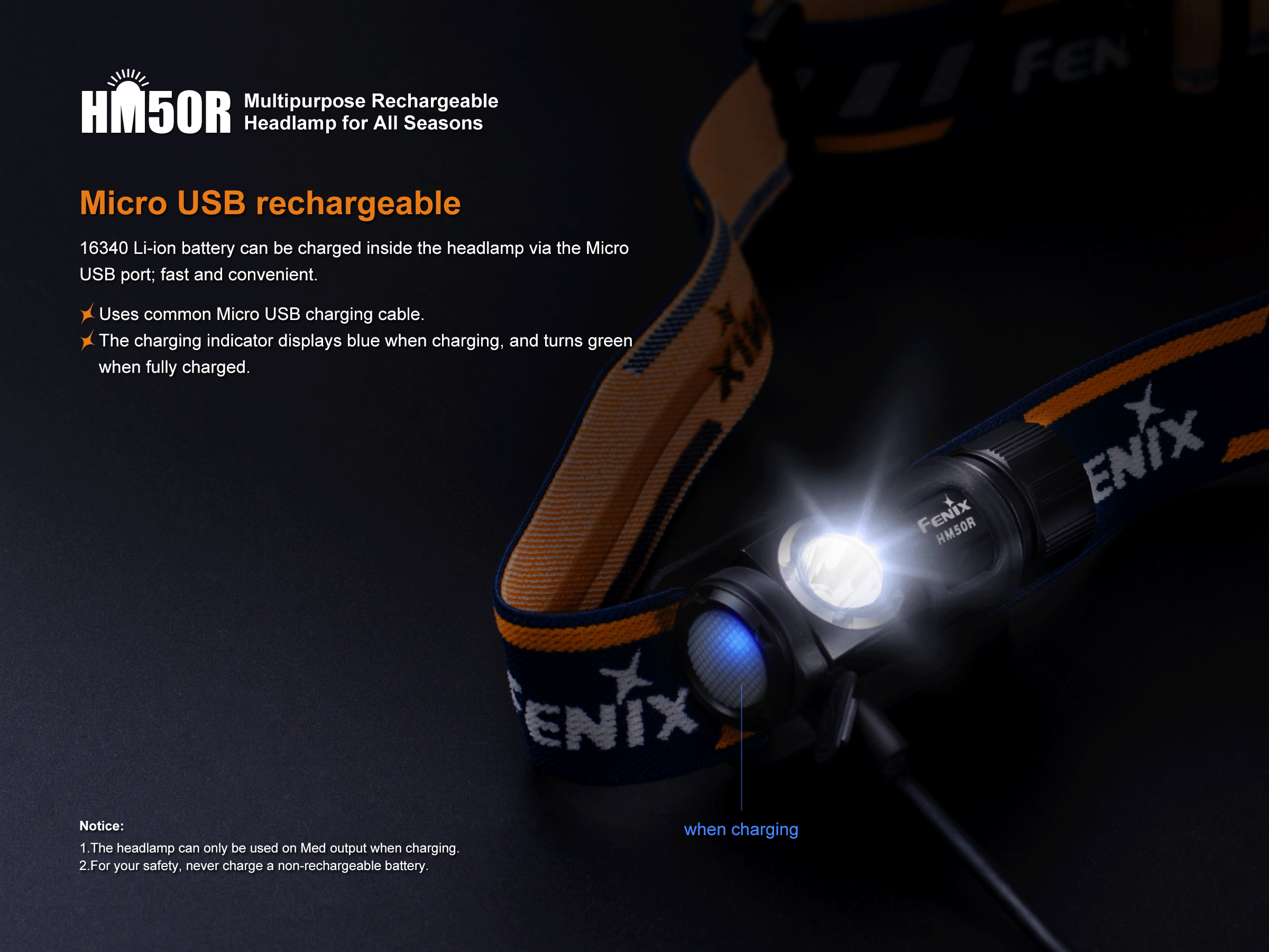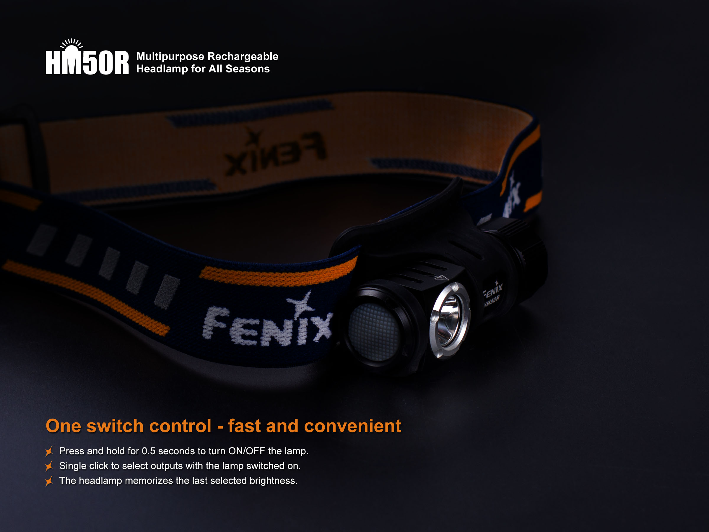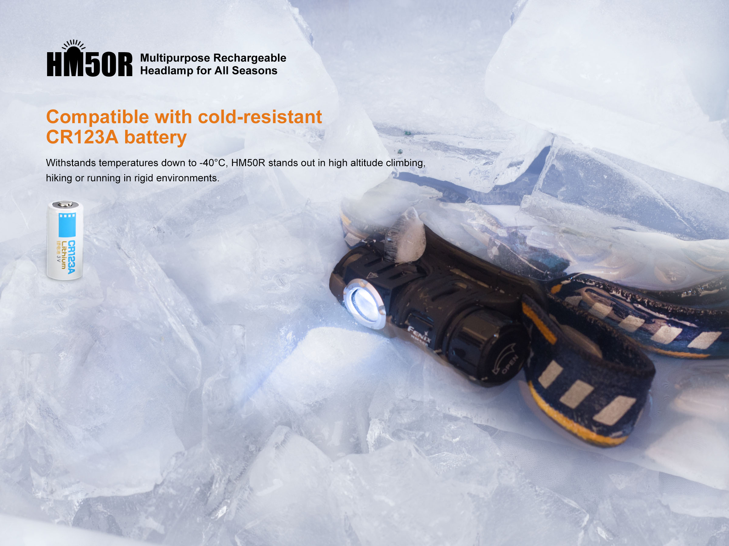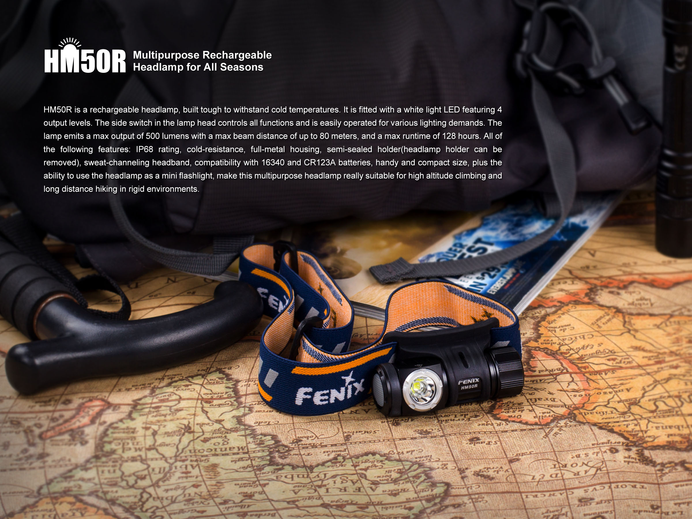 Fenix HM50R je malá, vysoko výkonná nabíjateľná čelovka s funkciou predlžujúcou výdrž. Na napájanie je možné použiť buď Li-ion akumulátor RCR123 (je súčasťou balenia), alebo jednorázovú batériu CR123A. Akumulátor RCR123A možno dobíjať cez micro USB konektor priamo v čelovke. Cez svoje kompaktné rozmery ponúka úctyhodný svetelný tok až 500 lúmenov a dosvit až 80 metrov. Svetelným zdrojom je špičková LED Cree XM-L2 U2. V ovládacom tlačidle na boku čelovky je zabudovaná indikačná dióda, ktorá po stlačení ukazuje stav nabitia batérie.