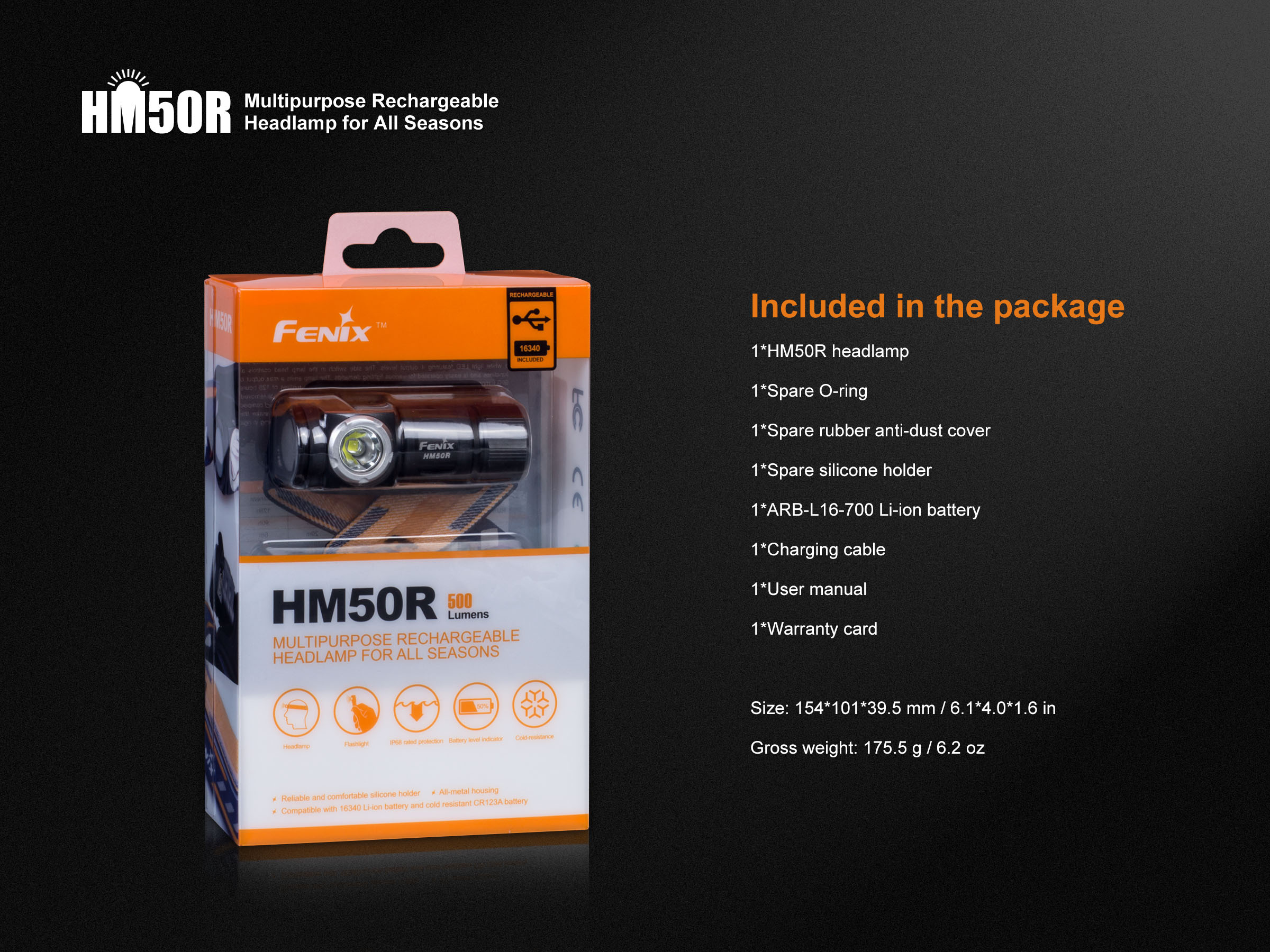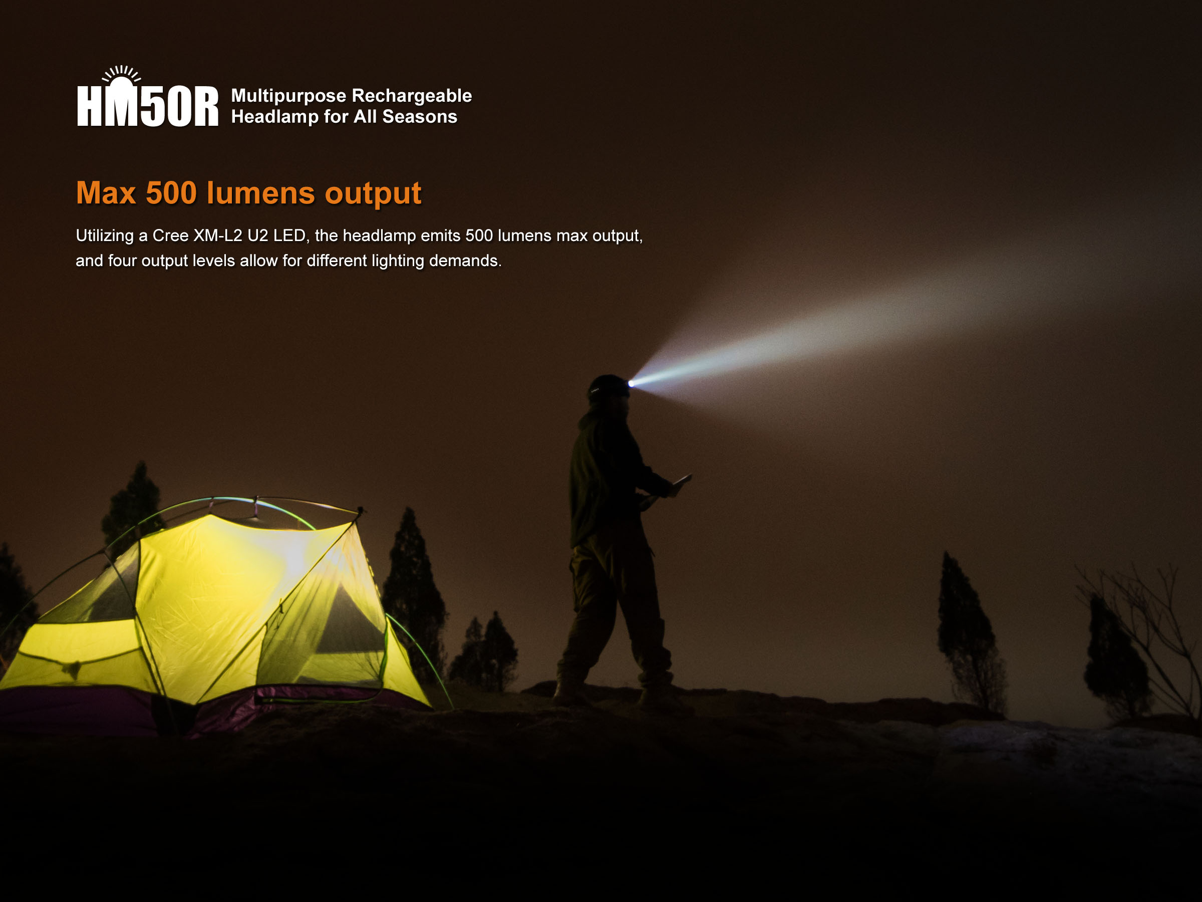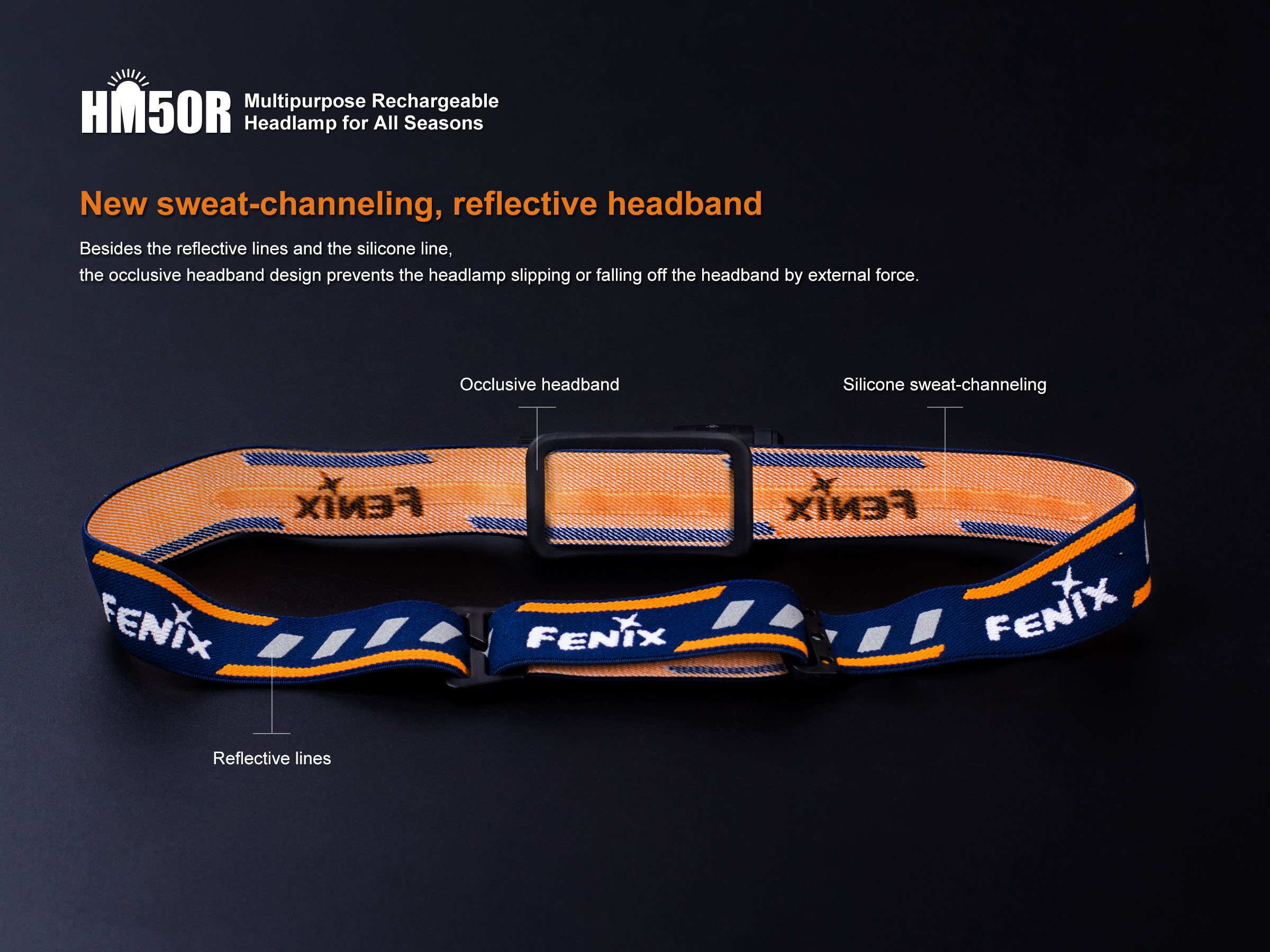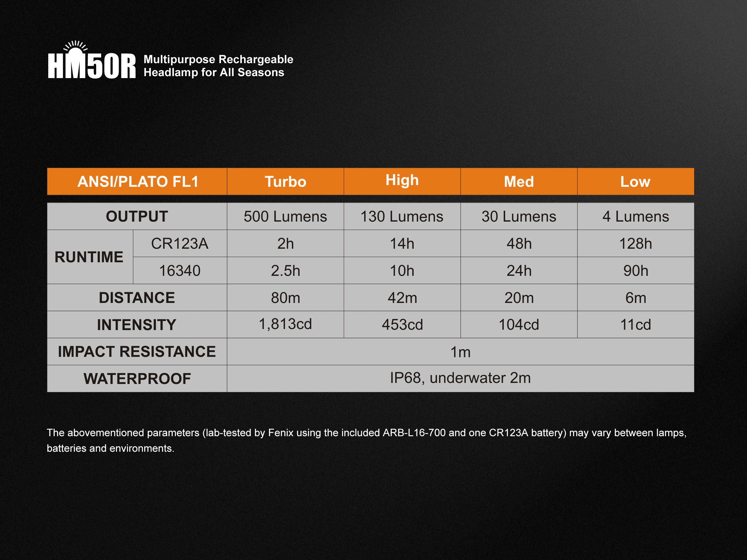 Fenix HM50R je malá, vysoko výkonná nabíjateľná čelovka s funkciou predlžujúcou výdrž. Na napájanie je možné použiť buď Li-ion akumulátor RCR123 (je súčasťou balenia), alebo jednorázovú batériu CR123A. Akumulátor RCR123A možno dobíjať cez micro USB konektor priamo v čelovke. Cez svoje kompaktné rozmery ponúka úctyhodný svetelný tok až 500 lúmenov a dosvit až 80 metrov. Svetelným zdrojom je špičková LED Cree XM-L2 U2. V ovládacom tlačidle na boku čelovky je zabudovaná indikačná dióda, ktorá po stlačení ukazuje stav nabitia batérie.