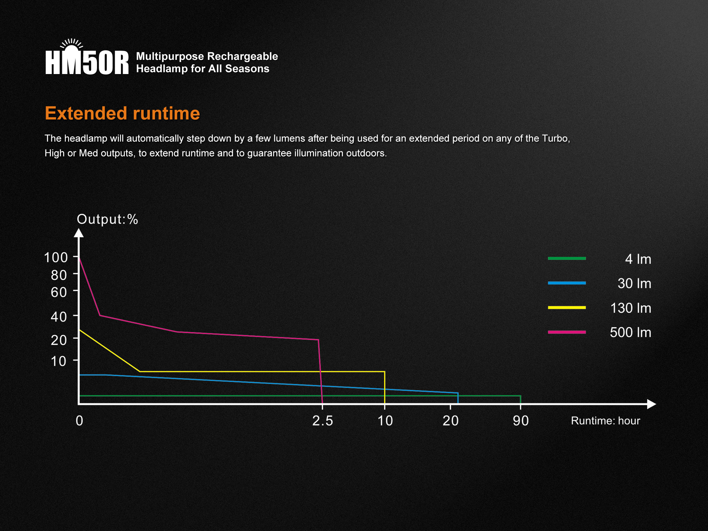 Čelovka je tiež vybavená funkciou predĺžujúcou výdrž. Pri dlhšom použití v režimoch turbo (500 lúmenov), vysokom (130 lúmenov) a strednom (30 lúmenov) čelovka postupne znižuje výkon v malých krokoch pre dosiahnutie dlhšej doby svietenia (viz. Graf výdrže).