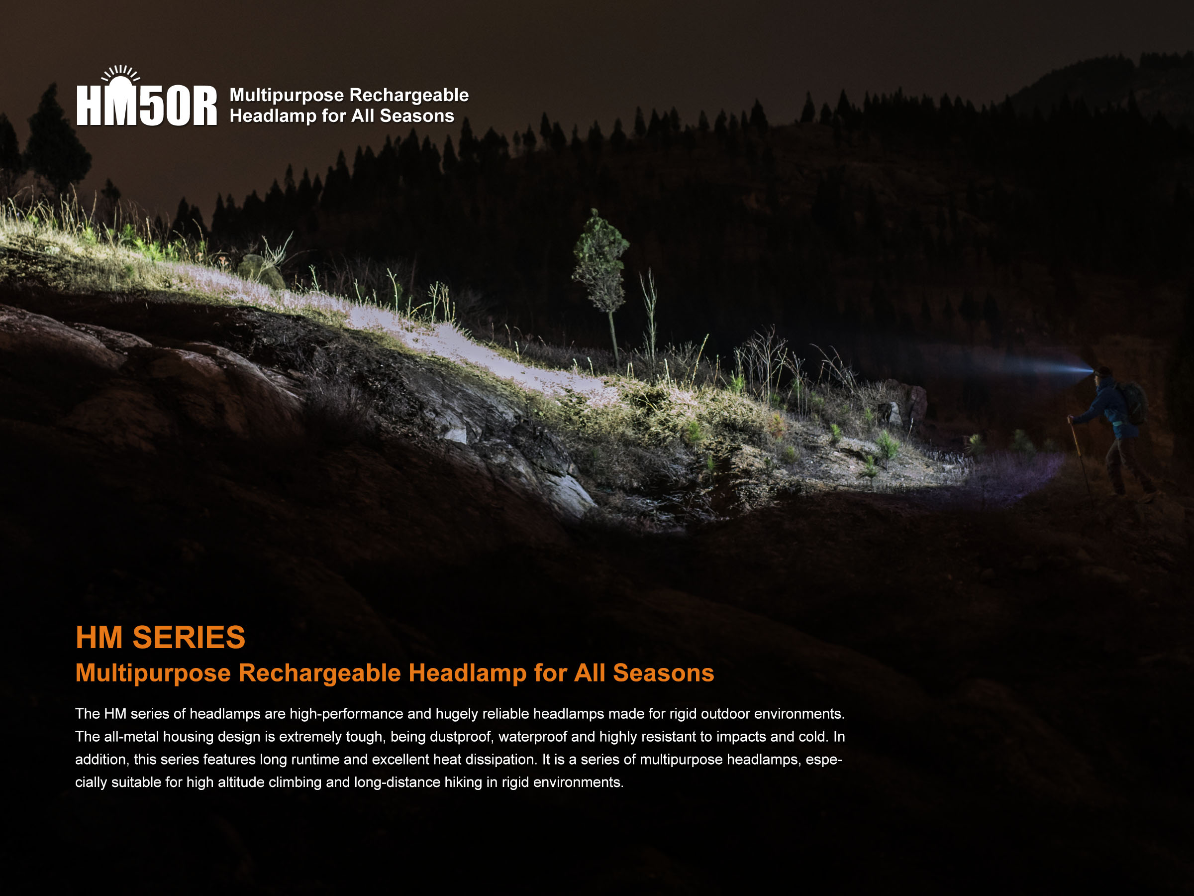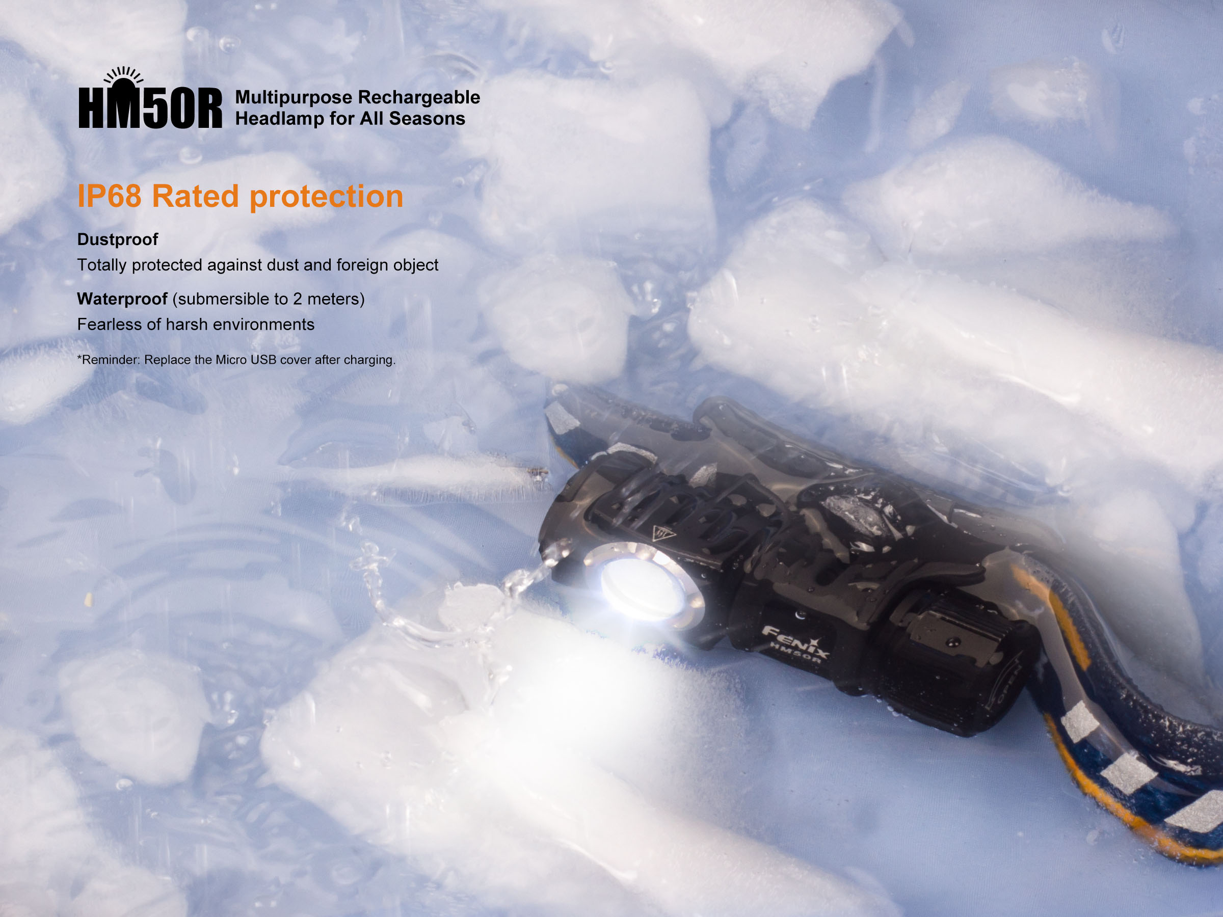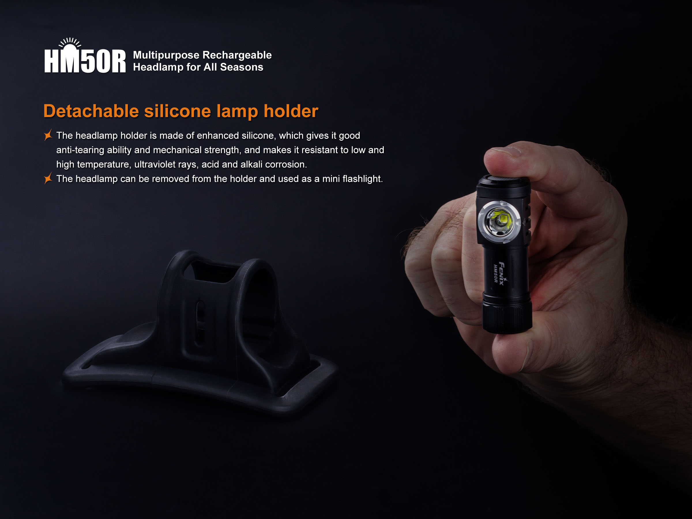 Celokovová konštrukcia zaisťuje vysokú odolnosť, optimálne chladenie a zároveň je plne vodotesná podľa štandardu IP68 až do hĺbky 2 metre pod vodou. Praktickosť čelovky sa zvyšuje možnosťou vyňať svetlo z hlavového držiaka a používať ho aj ako malú vreckovú baterku. Čelovka Fenix HM50R je ideálnym spoločníkom pre rôznorodé športové aktivity, výlety do prírody i do domácnosti a na prácu.