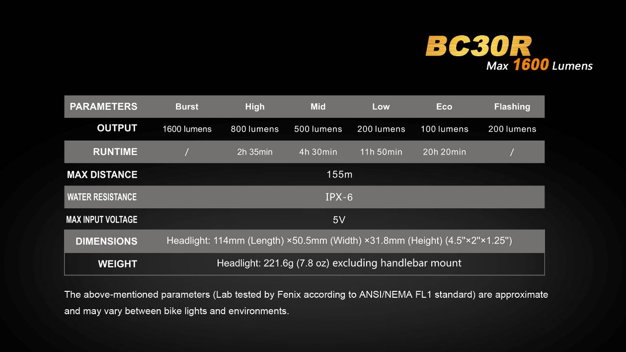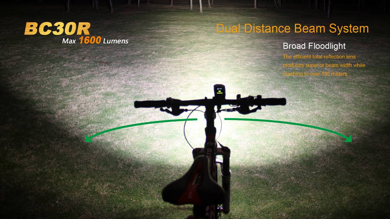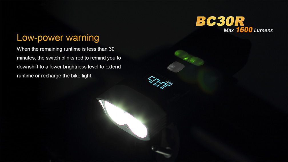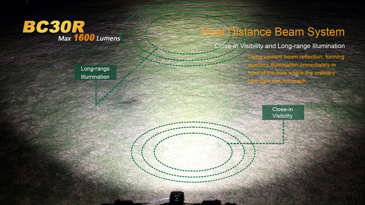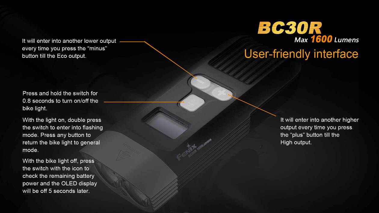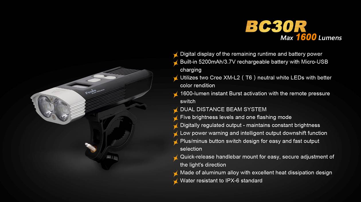 Kompaktné nabíjacie cyklo svietidlo BC30R je vybavené OLED displejom, ktorý zobrazuje aktuálne zvolený režim výkonu a zostávajúcu výdrž akumulátora. Svietidlo je osadené dvojicou najmodernejších LED Cree XM-L T6 s teplejším odtieňom svetla (neutral white). Používa novo vyvinutú technológiu dvojitého smerovania svetla Dual Distance Beam System, umožňujúcu vidieť do miest, ktoré iné svietidlá neosvietia. Vstavaný akumulátor je možné nabíjať prostredníctvom micro-USB portu na spodnej strane svietidla. Cyklo svietidlo disponuje šiestimi režimami výkonu, vrátane krátkodobého BURST režimu a blikania. BC30R vám výborne osvieti cestu pri nočných tréningoch, dochádzaní do práce, aj vytrvalostných pretekoch.