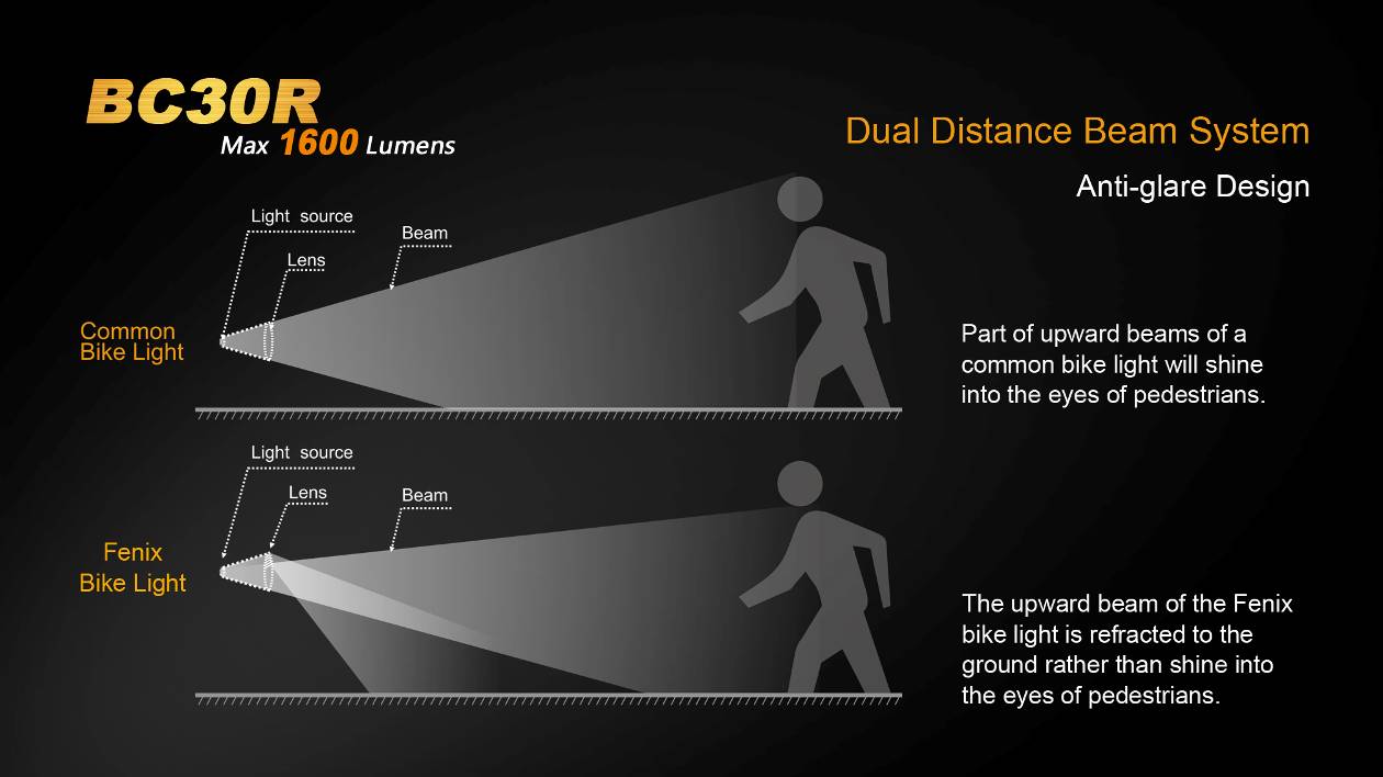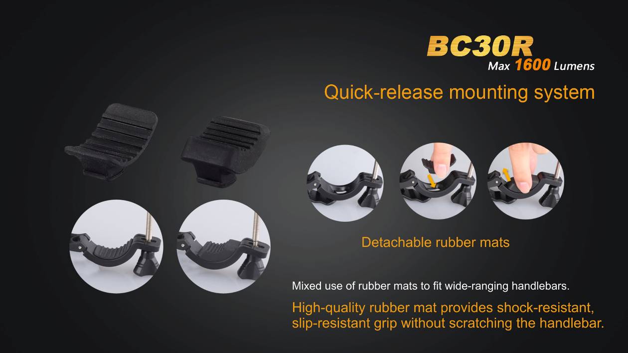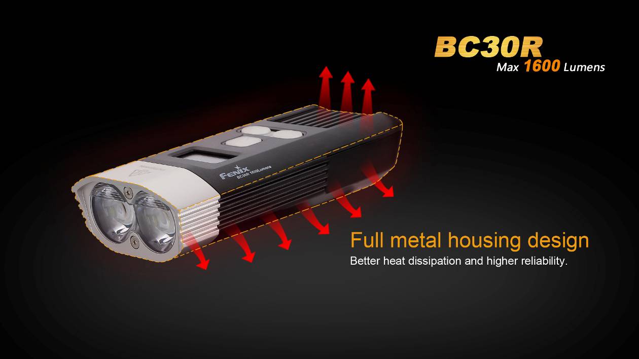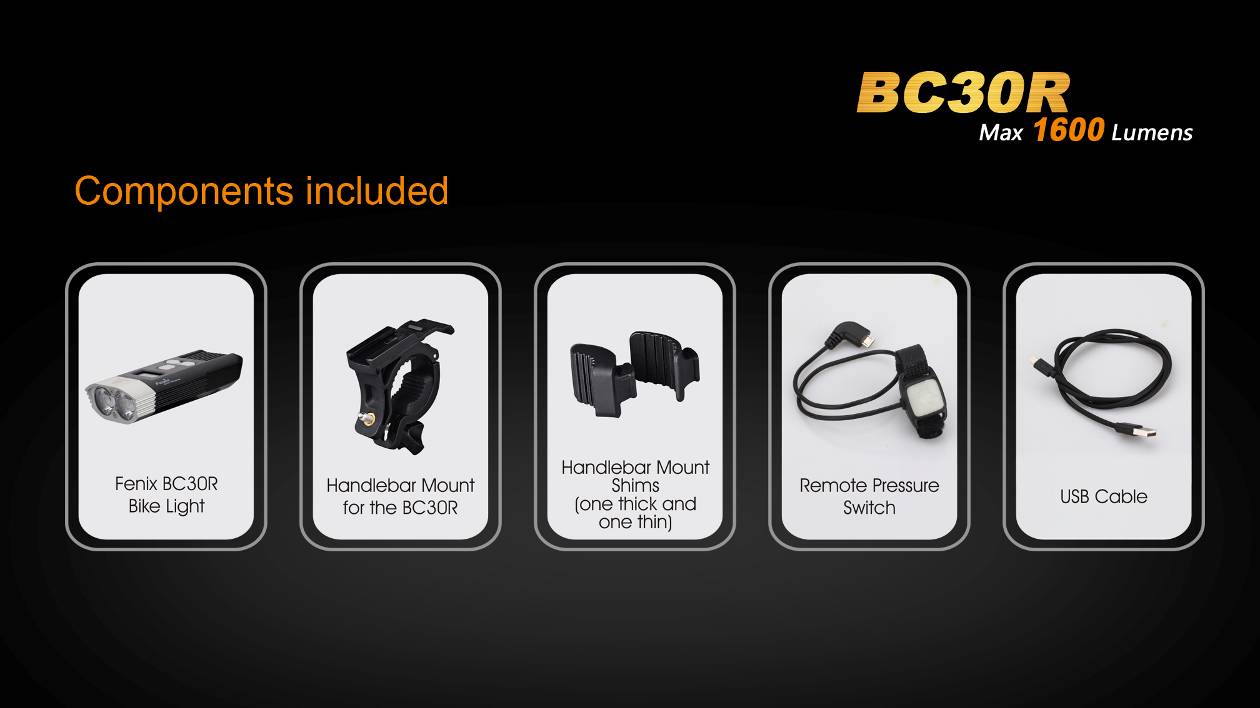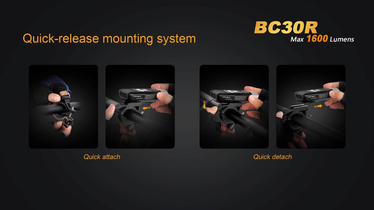 Kompaktné nabíjacie cyklo svietidlo BC30R je vybavené OLED displejom, ktorý zobrazuje aktuálne zvolený režim výkonu a zostávajúcu výdrž akumulátora. Svietidlo je osadené dvojicou najmodernejších LED Cree XM-L T6 s teplejším odtieňom svetla (neutral white). Používa novo vyvinutú technológiu dvojitého smerovania svetla Dual Distance Beam System, umožňujúcu vidieť do miest, ktoré iné svietidlá neosvietia. Vstavaný akumulátor je možné nabíjať prostredníctvom micro-USB portu na spodnej strane svietidla. Cyklo svietidlo disponuje šiestimi režimami výkonu, vrátane krátkodobého BURST režimu a blikania. BC30R vám výborne osvieti cestu pri nočných tréningoch, dochádzaní do práce, aj vytrvalostných pretekoch.