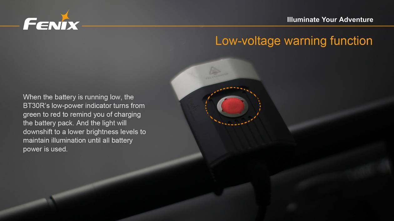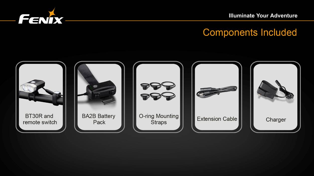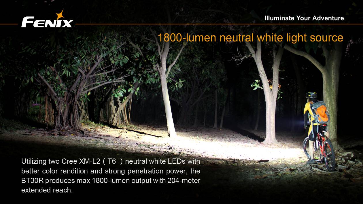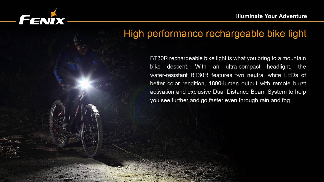 Nabíjacie cyklo svietidlo Fenix BT30R, so svetelným tokom až 1800 lúmenov, je napájané externým li-ion akumulátorom s kapacitou 19,2 Wh (2600 mAh, 7,4 V). Svetelným zdrojom sú dve diódy Cree XM-L2 s teplejším odtieňom bieleho svetla. Výhodou tohto odtieňa je prirodzenejšie a kontrastnejšie podanie farieb v teréne. Špeciálne tvarovaná optika Dual Distance Beam System vytvára svetelný kužeľ kombinujúci široké periférne osvetlenie a dosvit až do vzdialenosti 170 metrov. Fenix BT30R ponúka dokopy šesť režimov výkonu, vrátane blikajúceho režimu. Nabíjacie svietidlo Fenix BT30R vám zaistí kvalitné osvetlenie na nočných tréningoch, pri pravidelnom dochádzaní do práce, aj na vytrvalostných pretekoch.