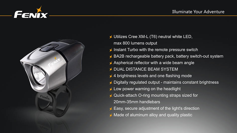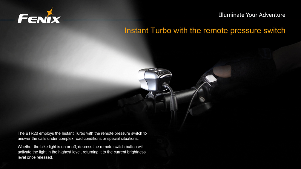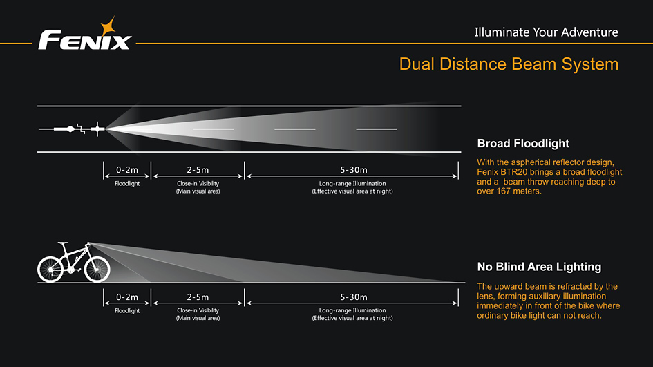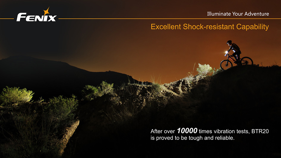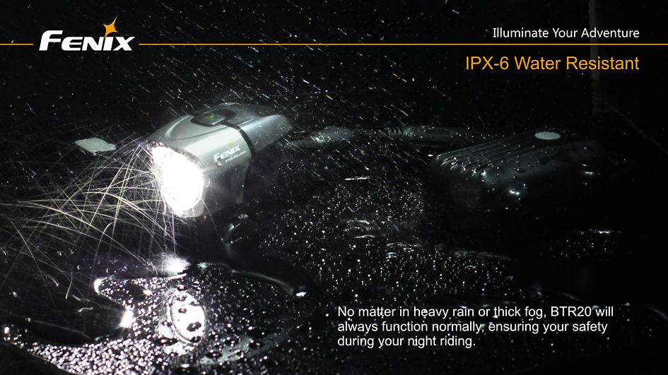 Nabíjacie cyklo svetlo Fenix BTR20 prináša svetelný tok až 800 lúmenov (ANSI), k napájaniu používa externý li-ion akumulátor s kapacitou 19,2 Wh (2600 mAh, 7,4V). Ako svetelný zdroj využíva modernú bielu diódu Cree XM-L s neutrálnym odtieňom svetla (neutral white), ktoré umožňuje prirodzenejšie a kontrastnejšie podanie farieb v teréne. Svietidlo používa modernú technológiu dvojitého smerovania svetla, ktorá pomáha vzniku svetelného kužeľa, plynule osvetľujúci celý priestor pred bicyklom až do vzdialenosti 167 metrov.