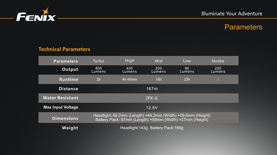 | Výkon (lúmeny) | 80 | 200 | 400 | 800 | 200 | 167 m | 6 972 cd | 1 m | IPX6, prudký dážď | 69,2 mm | 44,2 mm | 59,6 mm | 311 g (vrátane batérií) |