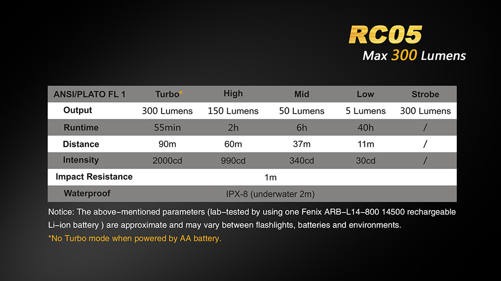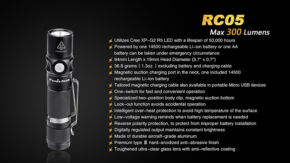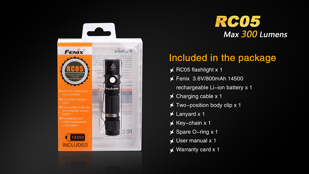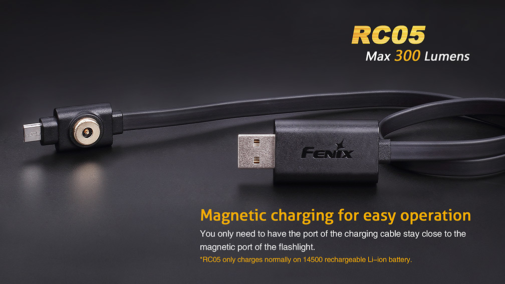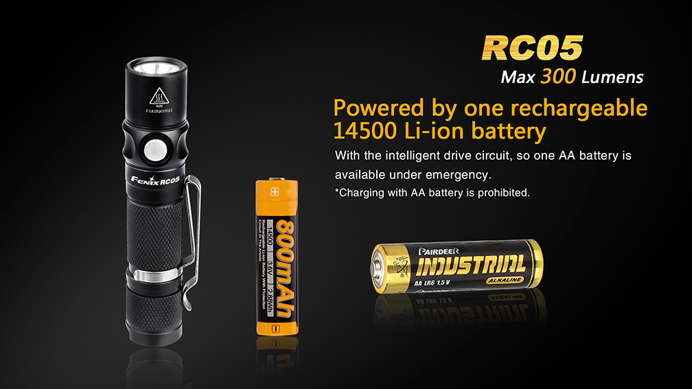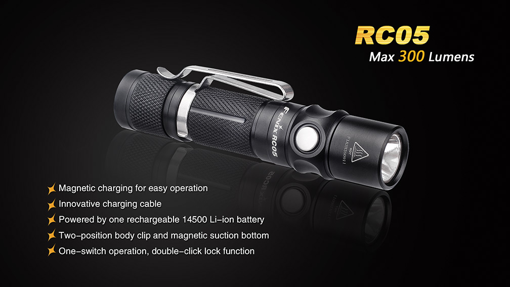 Fenix RC05 je výkonné nabíjacia vrecková baterka. Napája ju jeden nabíjací akumulátor typu Li-ion 14500, ktorý sa dobíja priamo vo svietidle cez USB kábel so špeciálnym magnetickým konektorom, alternatívne je možné k napájaniu použiť aj jednorazovú i nabíjací tužkovú batériu AA. Koncovka baterky je tiež magnetická, takže ju možno ľahko uchytiť na čokoľvek železného. Baterka disponuje piatimi rôznymi režimami osvetlenia, ktoré umožní voliť medzi vysokým výkonom a dlhou výdržou. Baterka je napájaná digitálne kontrolovaným konštantným prúdom pre zaručenie stáleho svetelného výkonu i pri znižovaní napätia v batériách (pri ich pozvoľnom vybíjaní).