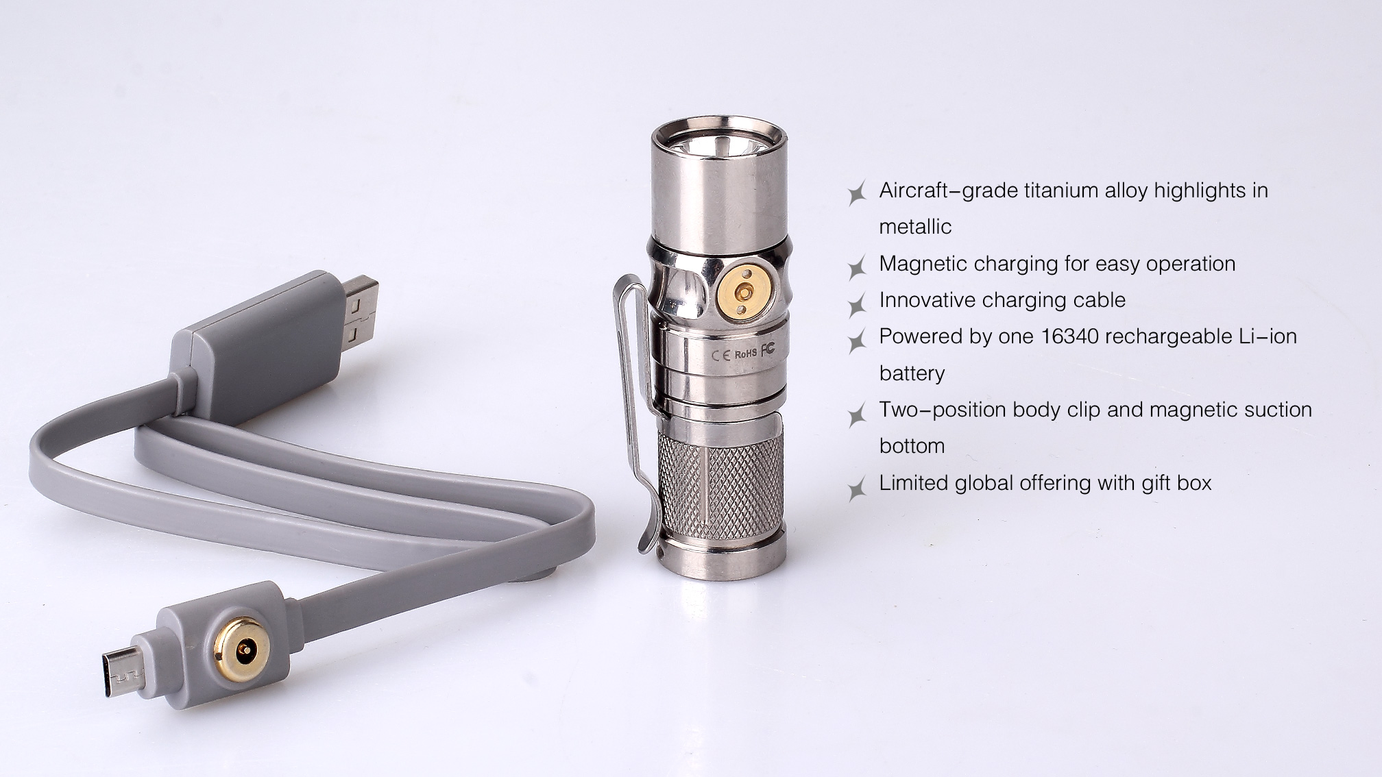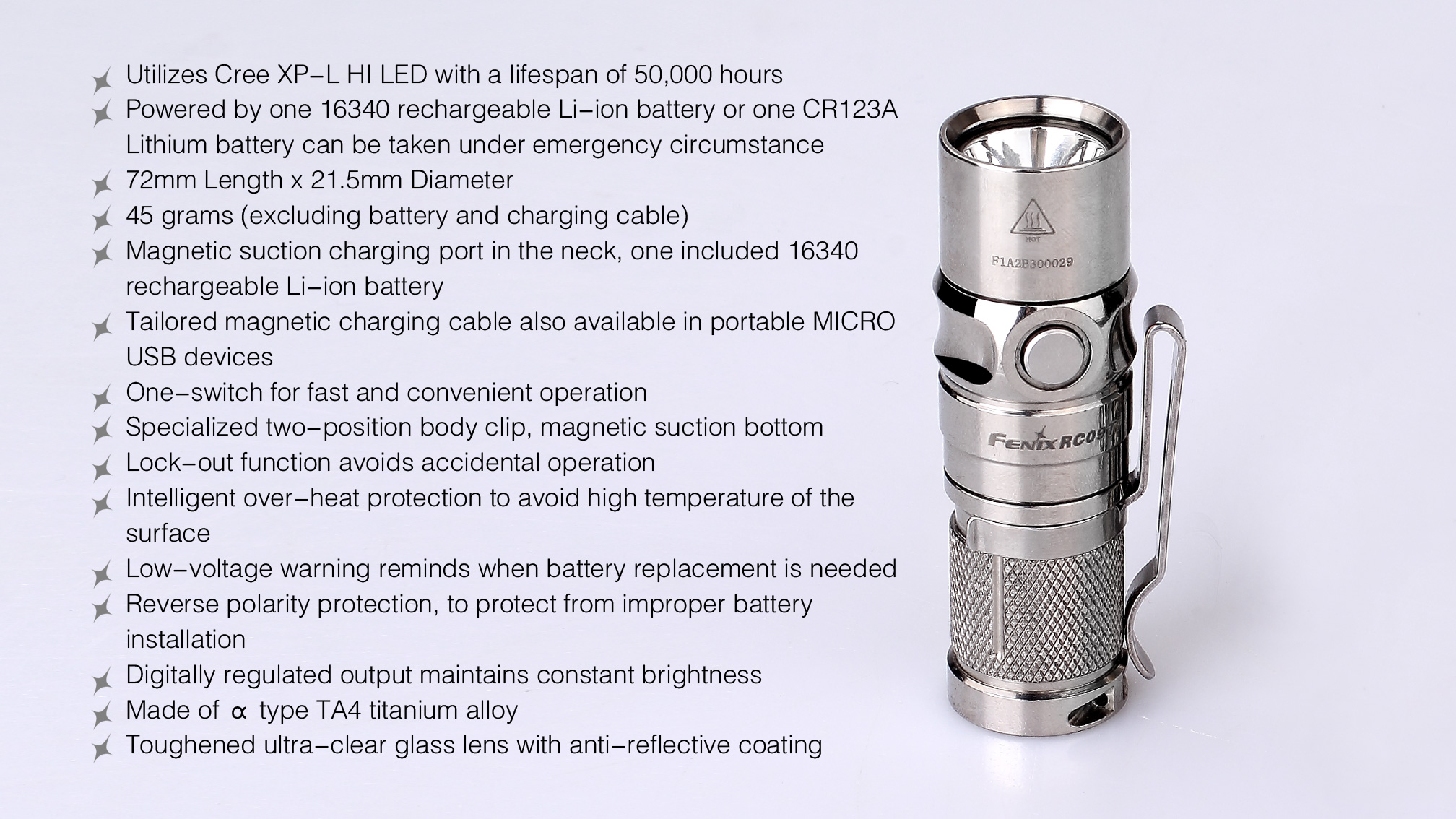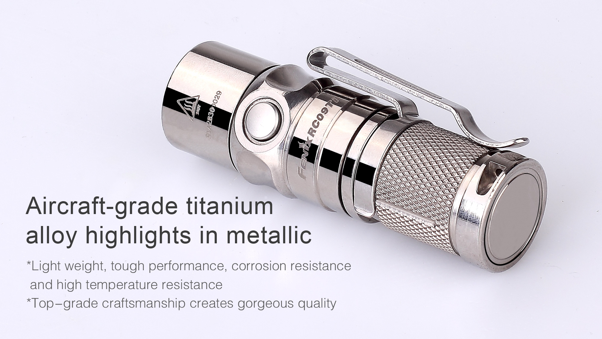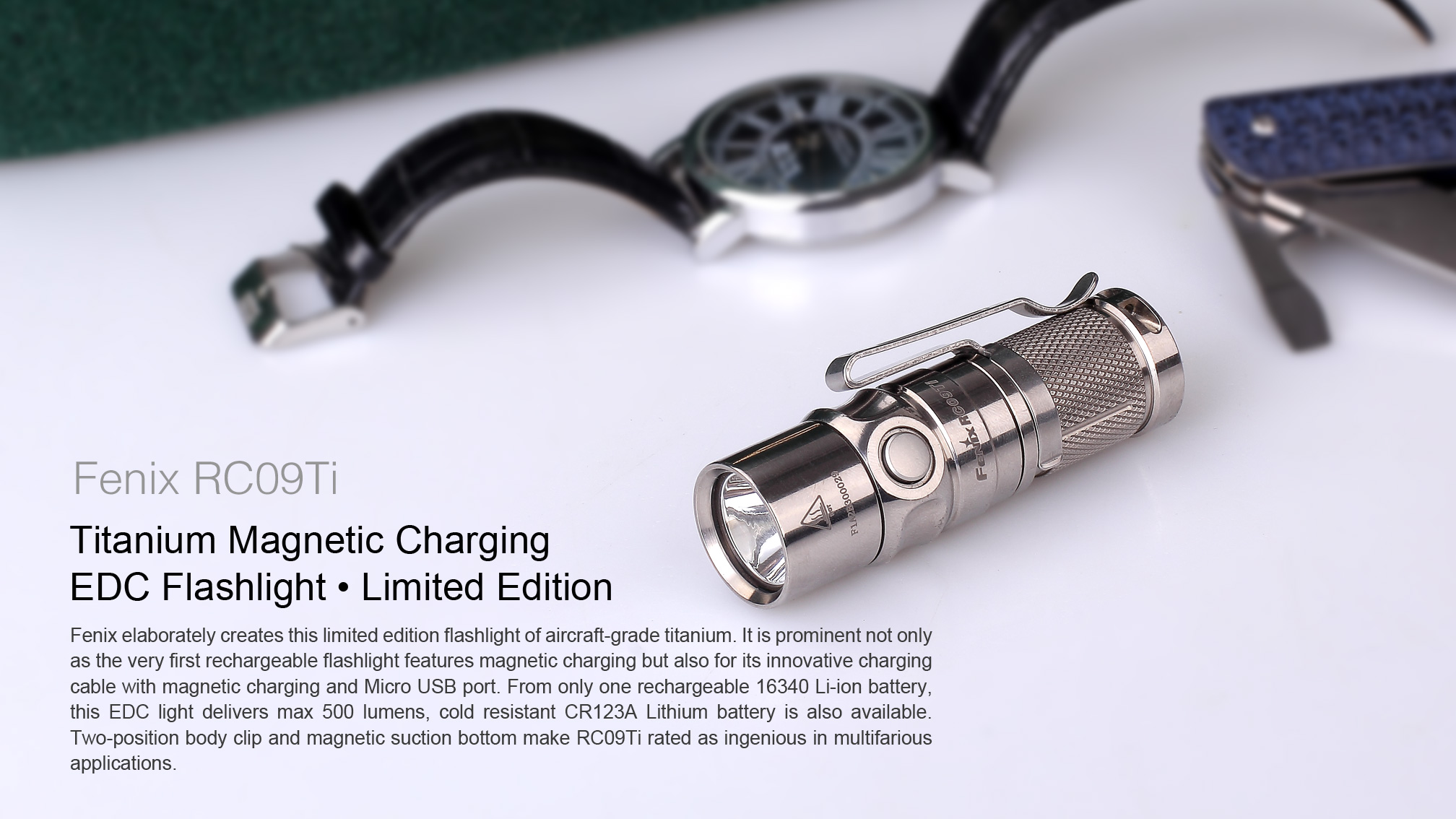 Fenix RC 09 Titanium je vysoko výkonná nabíjacia vrecková baterka s exkluzívnym prevedením z titánovej zliatiny s lešteným povrchom. Ide len o limitovanú edíciu a počet vyrobených kusov je obmedzený! RC09 ponúka svetelný tok až 550 lúmenov (ANSI) a dosvit až 145 metrov. Nadštandardného dosvitu (vzhľadom na veľkosť baterky) bolo dosiahnuté použitím špičkovej LED Cree XP-L HI (High Intensity), ktorá vytvára veľmi dobre zaostrený kužeľ. Napája ju jeden nabíjací akumulátor typu RCR123A, ktorý sa nabíja priamo vo svietidle cez špeciálny magnetický konektor.