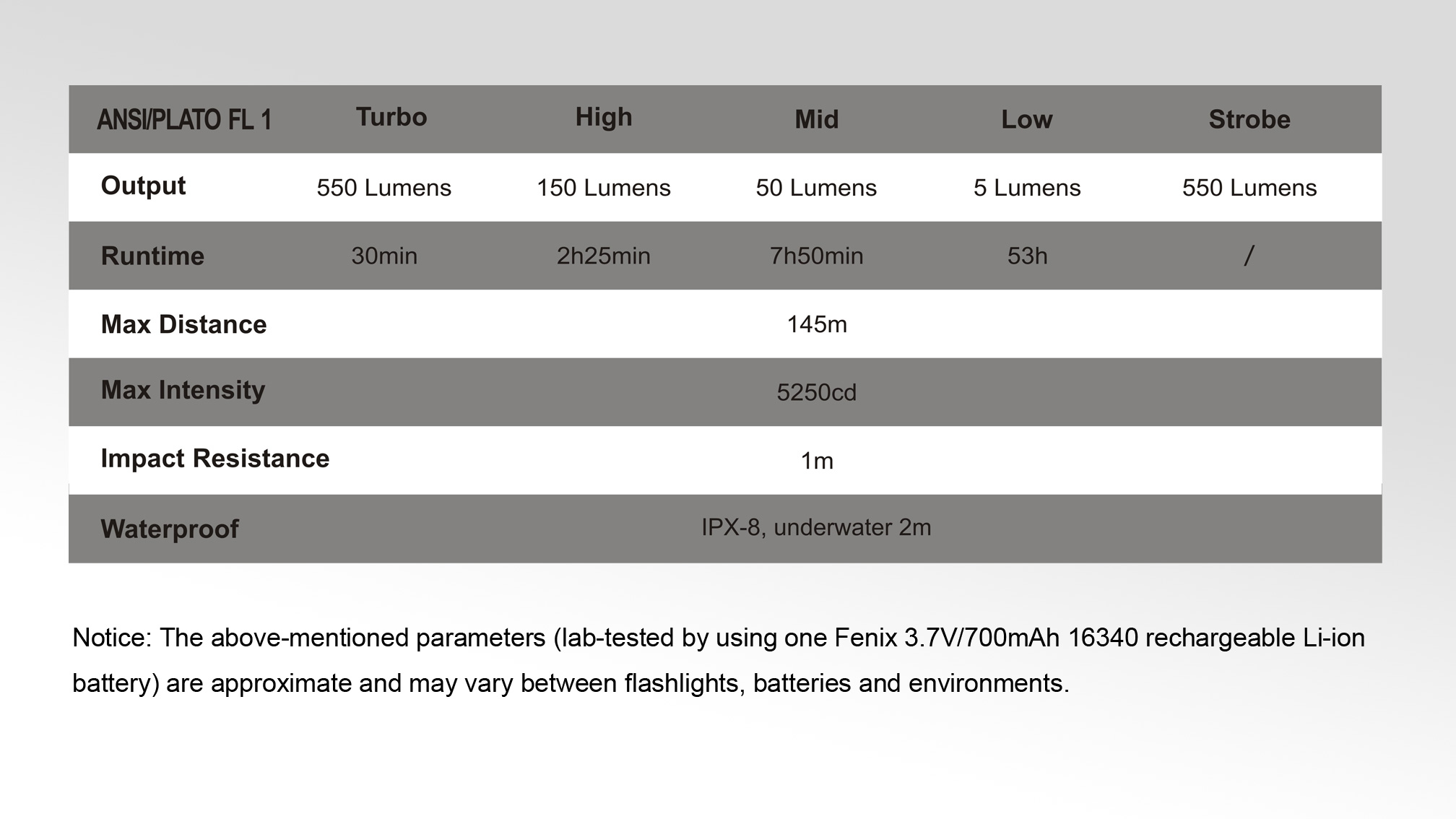 Všetky parametre baterky (svetelný tok, doba svietenia na batérie, vodotesnosť, dosvit a nárazuvzdornosť) sú merané v súlade s normou ANSI/NEMA FL 1-2009 Flashlight Basic Performance Standard.