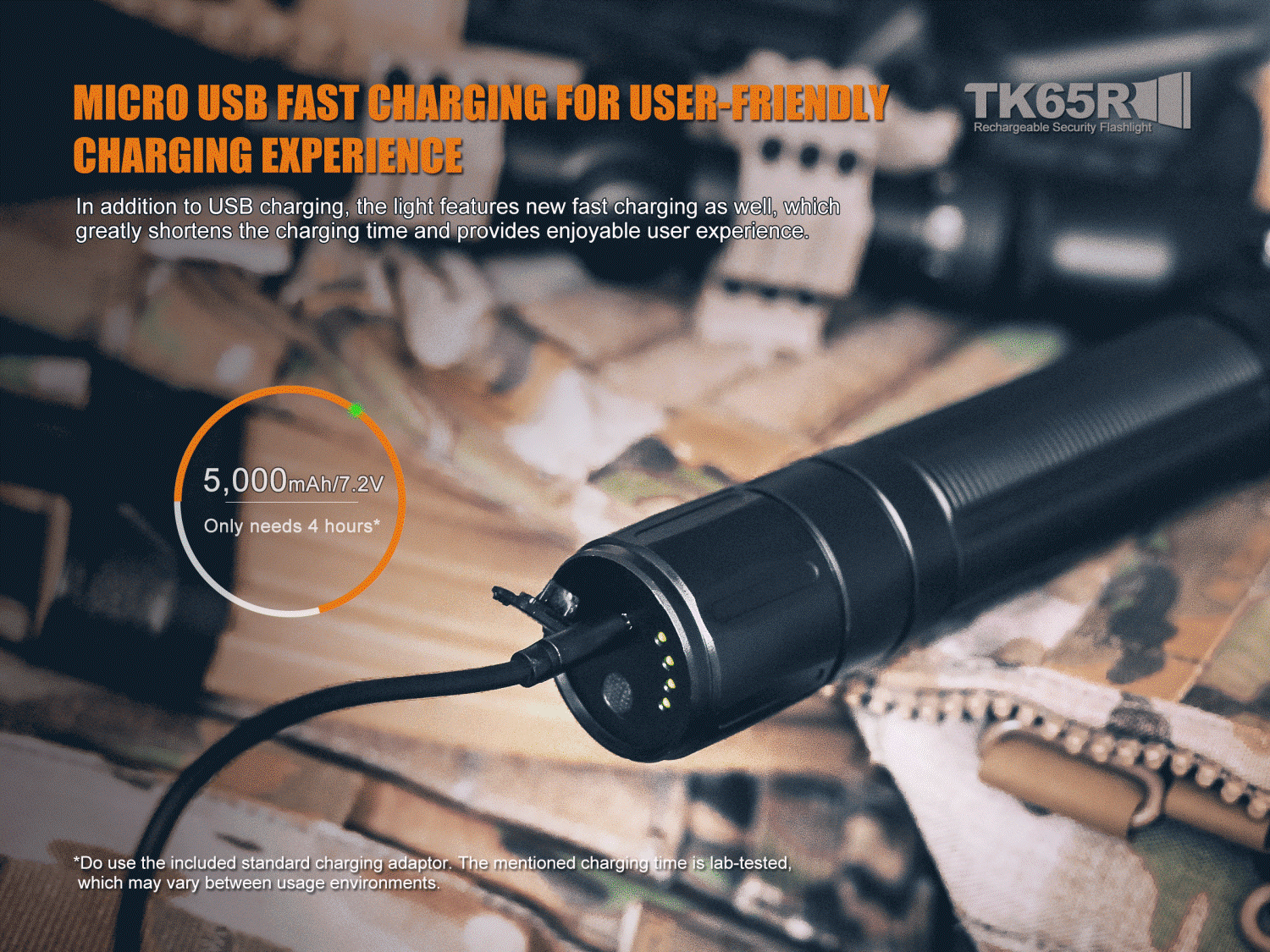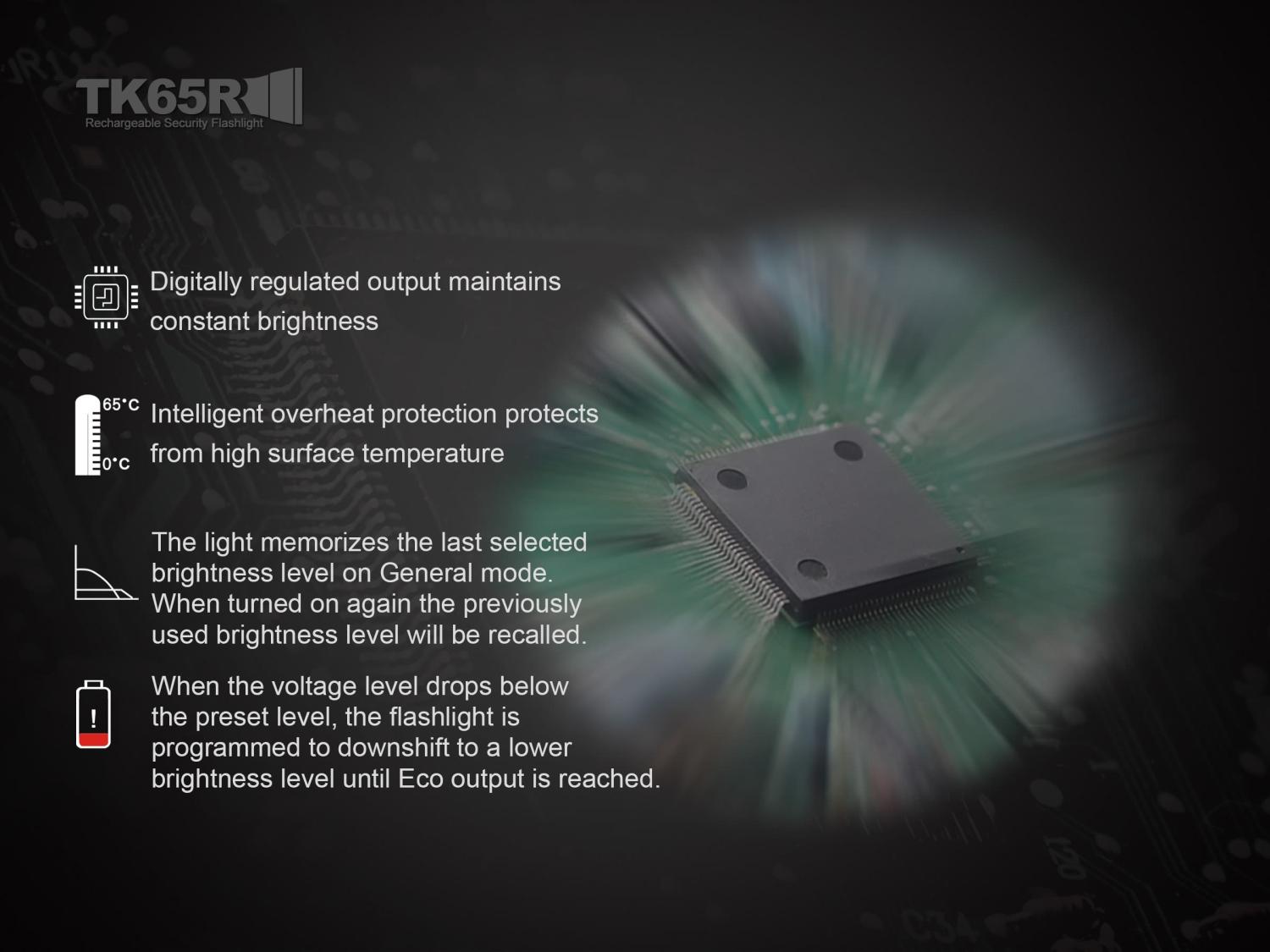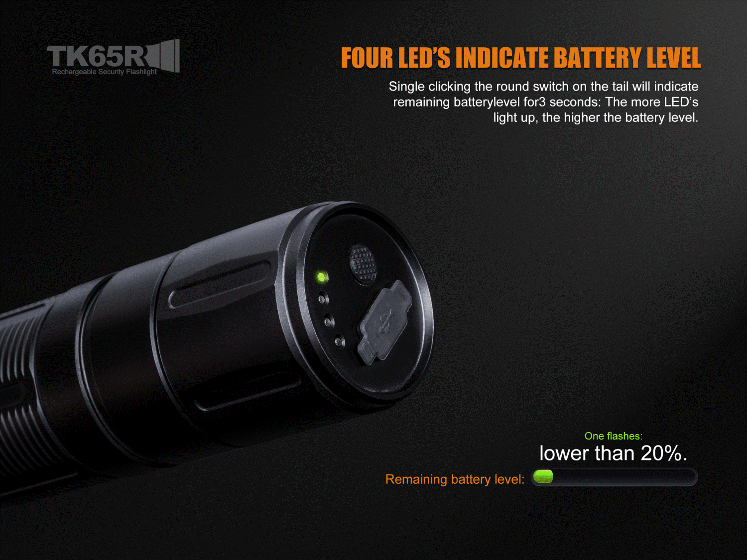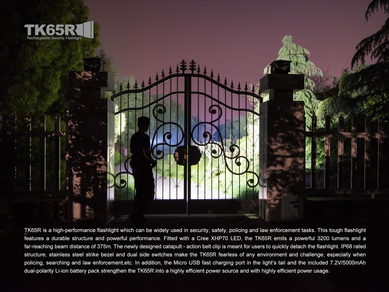 Vysokovýkonné nabíjateľné svietidlo Fenix TK65R poskytuje výnimočný svetelný výkon až 3200 lúmenov (ANSI) a dosvit až 375 metrov. Jeho výkon je dosiahnutý prostredníctvom mimoriadne výkonnej LED Cree XHP70, ktorý je poháňaný vlastnou vnútornou lítiovo-iónovou batériou, ktorú je možné nabíjať priamo vo svietidle prostredníctvom konektora micro USB. Baterka ponúka celkovo sedem neustále kontrolovaných úrovní výkonu vrátane dvoch zábleskových režimov – stroboskop a SOS. Pre pohodlie je baterka vybavená dvomi tlačidlami na boku. Spodné tlačidlo ovláda režimy stáleho svietenia a druhé tlačidlo ovláda režimy zábleskové. Okrem toho je svietidlo vybavené rýchloupínacím závesom na opasok, ktorý z neho robí vždy dostupného pomocníka. Toto svietidlo je vhodné napríklad na stráženie veľkých plôch, ostrahu objektov, prieskum a záchranné operácie a takisto na pohyb v ťažkom a neprehľadnom teréne.