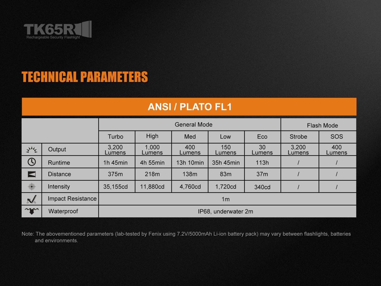 Všetky parametre svietidla (svetelný tok, doba svietenia na batérie, vodotesnosť, dosvit a nárazuvzdornosť) sú merané v súlade s normou ANSI/NEMA FL 1-2009 Flashlight Basic Performance Standard.