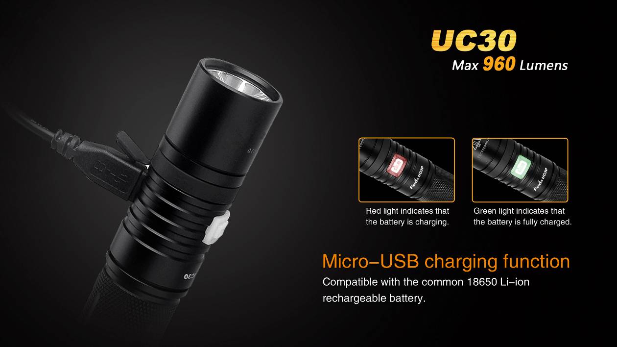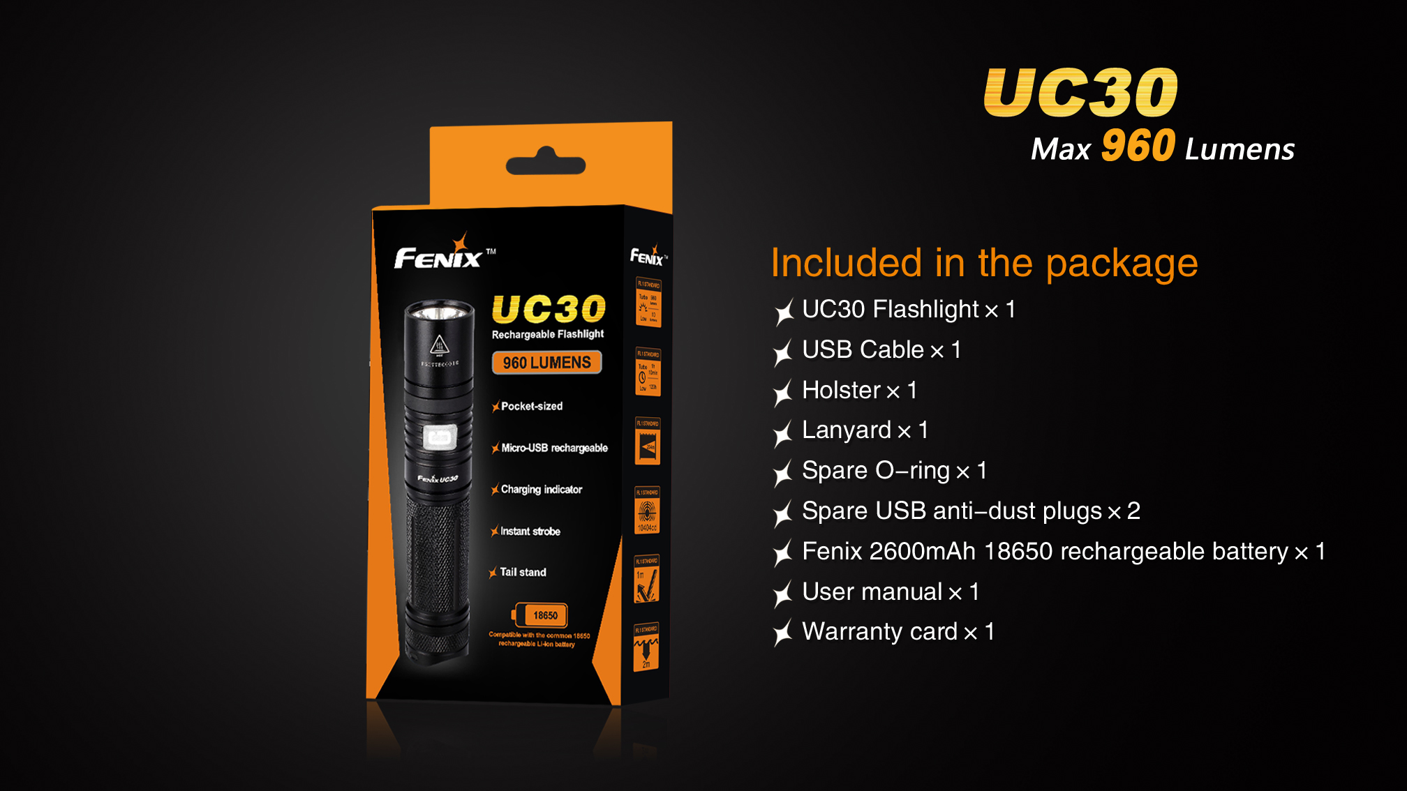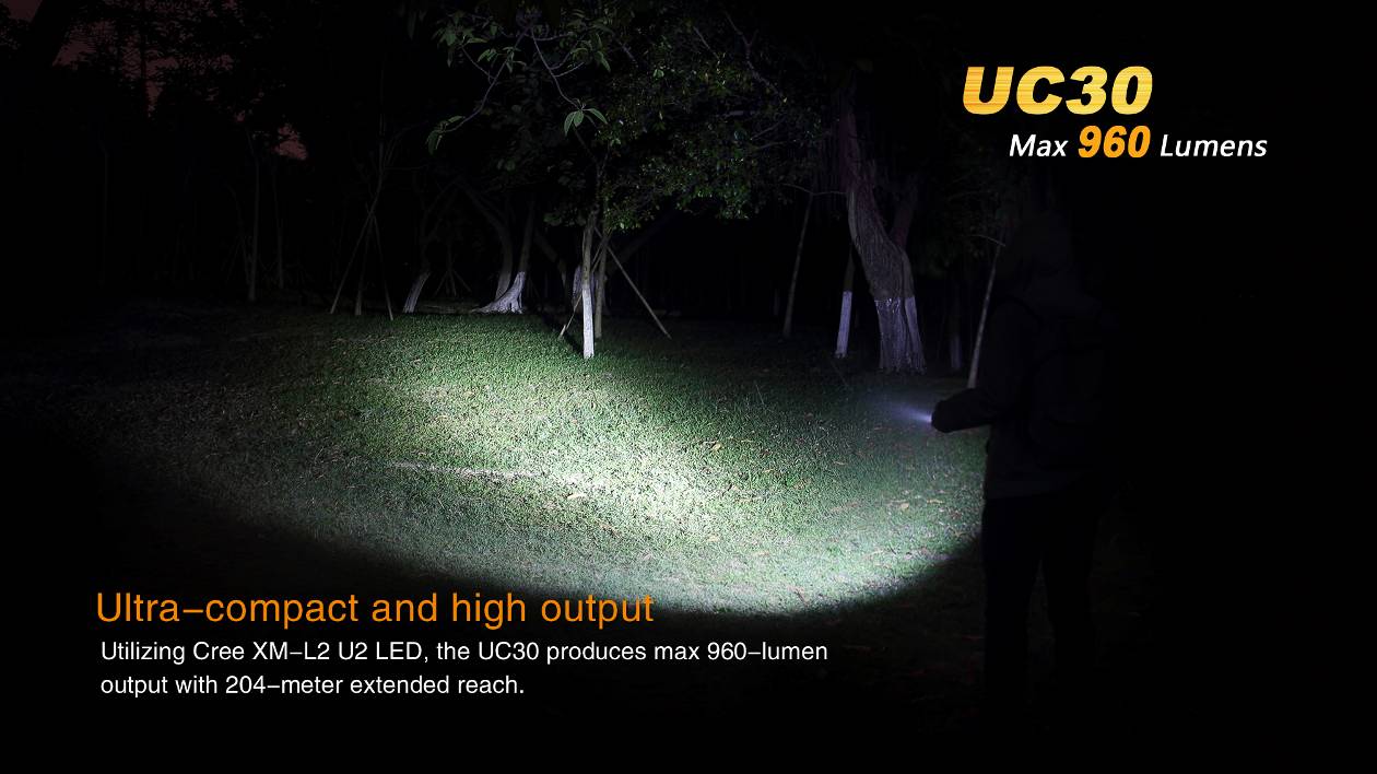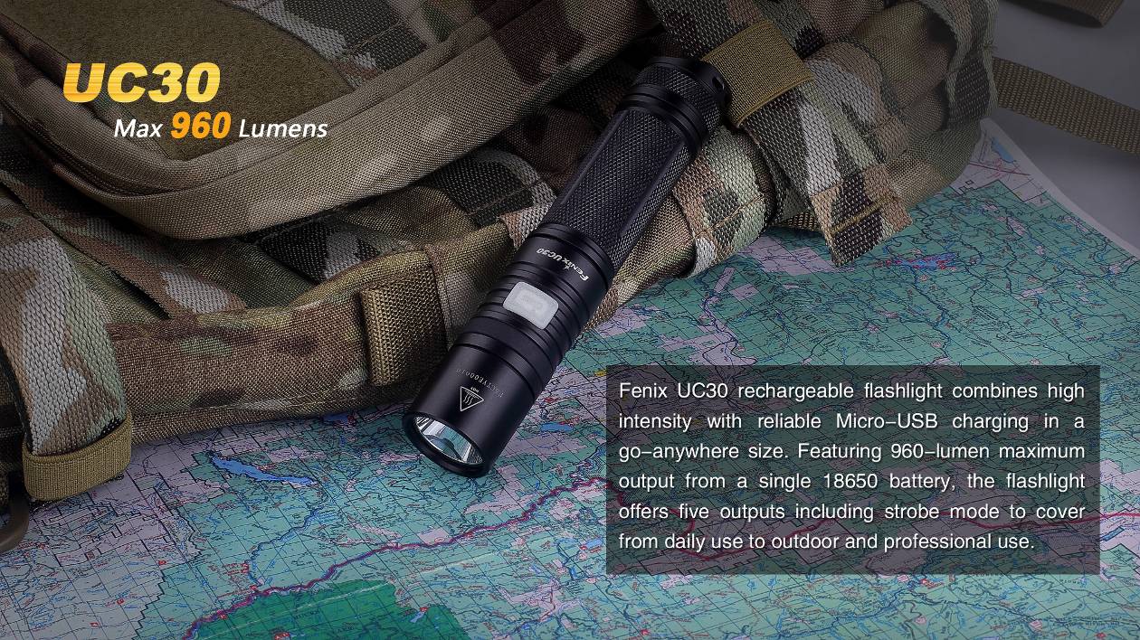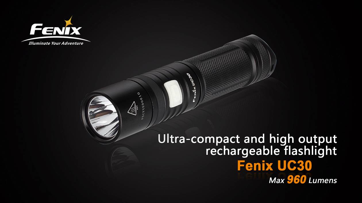 Fenix UC30je jednoduchá nabíjacia baterka, ktoré ponúka svetelný tok až 960 lúmenov. Svetelná dióda Cree XM-L2 U2 v kombinácii s hliníkovým reflektorom dosvieti až do vzdialenosti 204 metrov. Na napájanie používa li-ion akumulátor typu 18650 s kapacitou 2600 mAh, ktorý sa nabíja priamo v baterke. V núdzi je však možné na napájanie použiť aj dve jednorazové CR123A batérie. K dispozícii je celkom päť režimov osvetlenia s výdržou až 120 hodín v najnižšom režime. Zapnutie aj prepínanie svetelných funkcií sa vykonáva bočným tlačidlom pri reflektore baterky. Tento model je vhodný pre všetkých, ktorí hľadajú čo najmenšie a zároveň čo najvýkonnejšie nabíjacie svietidlo.